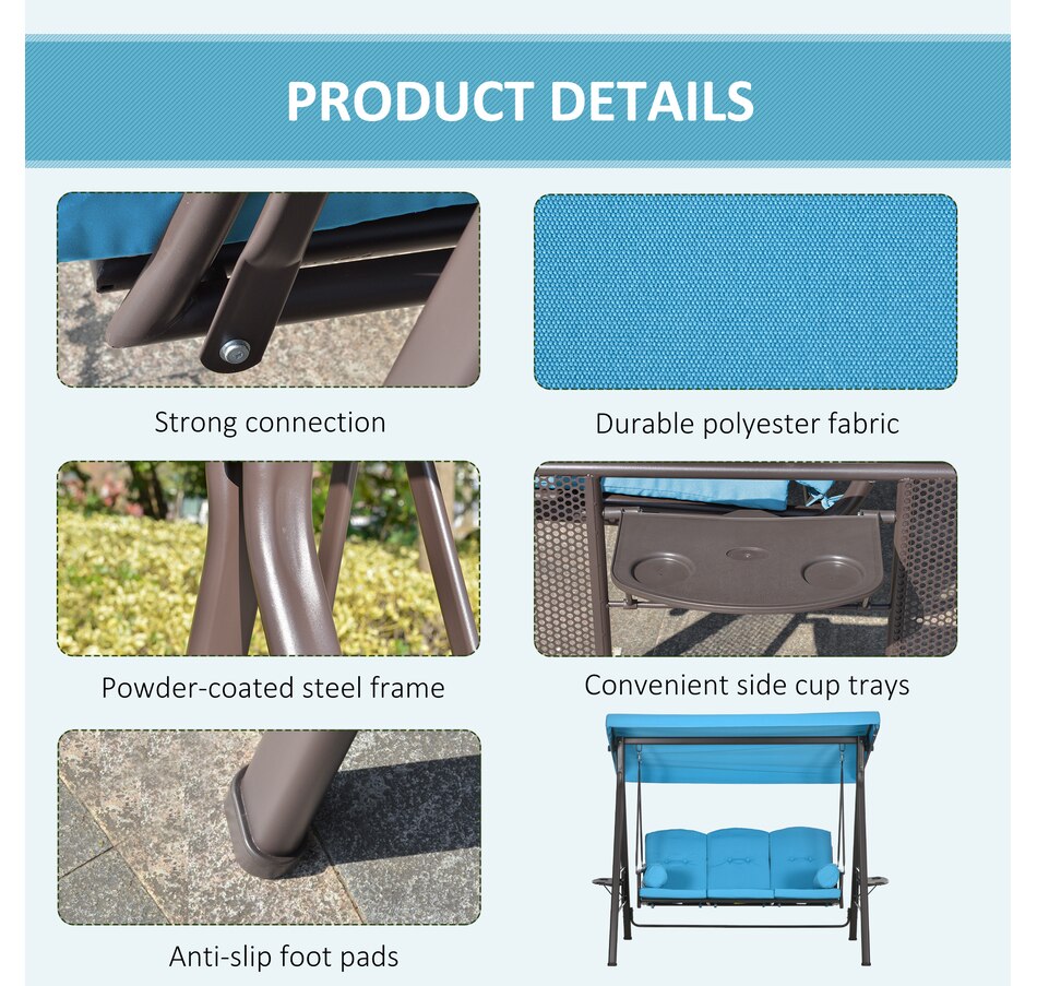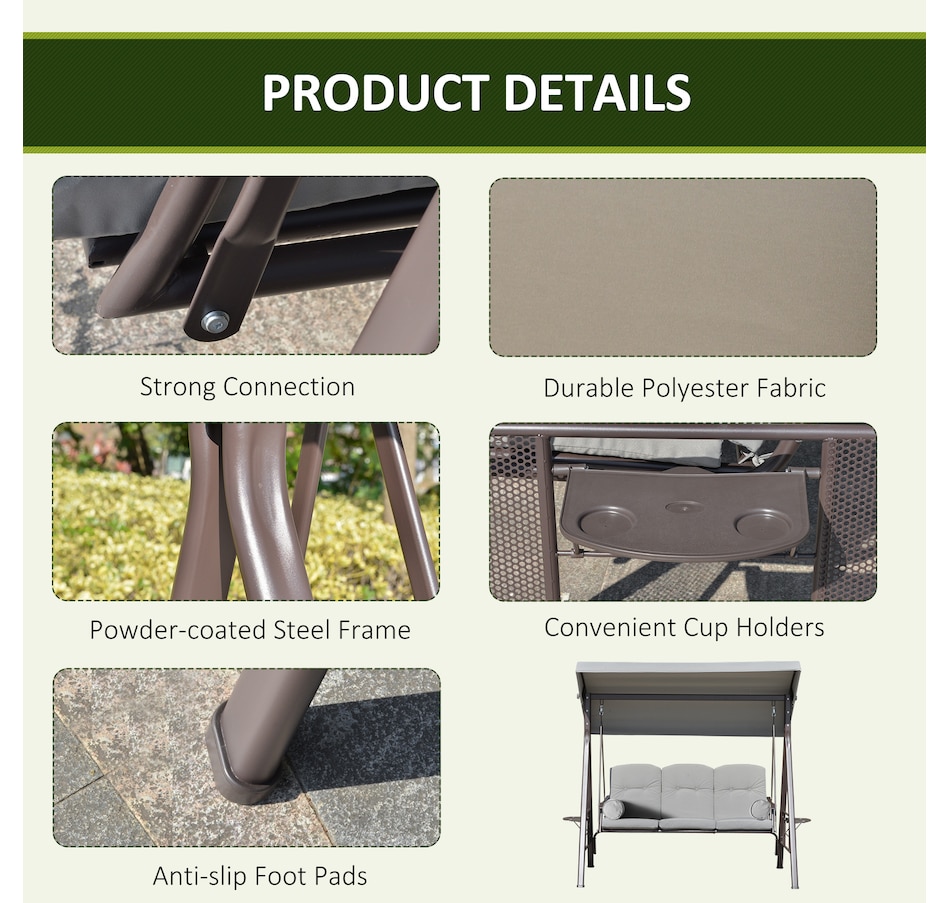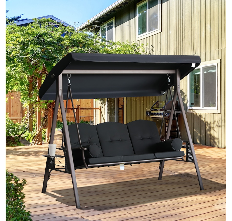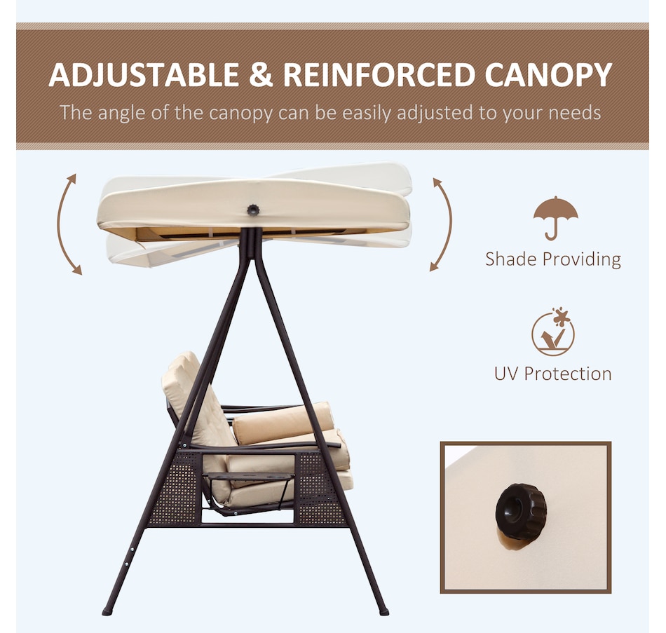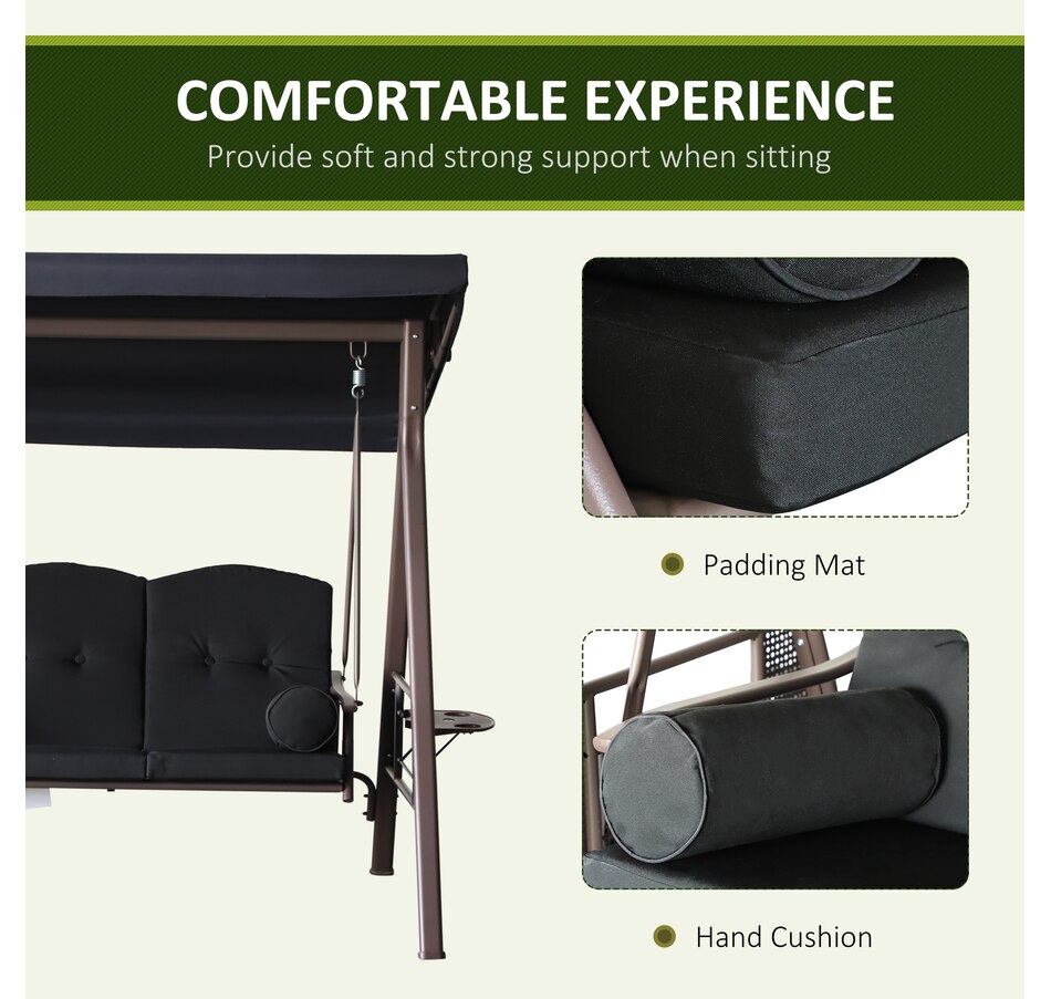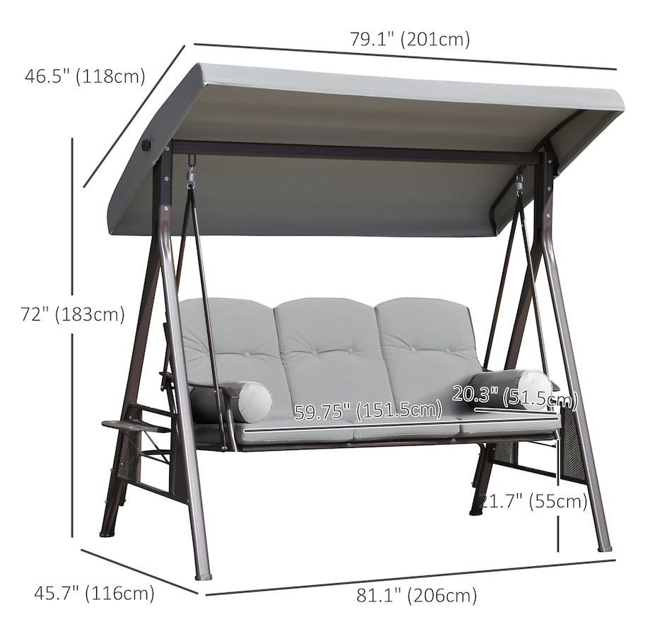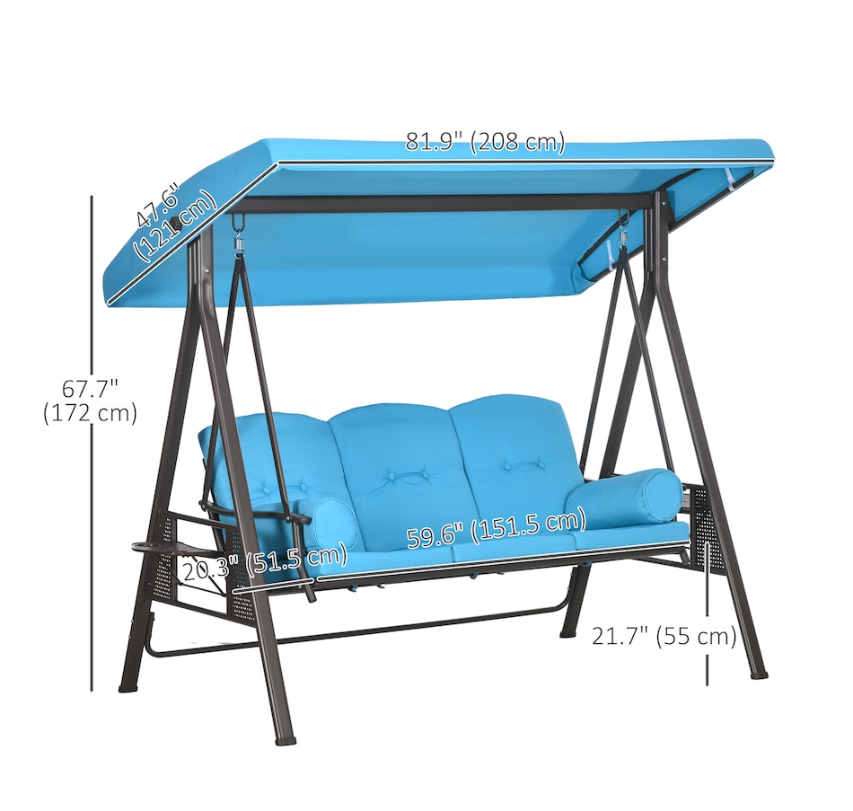Relax and enjoy with friends and family in outdoor swing chair for adults from Outsunny. The 3 seat swing frame is made of powder coated steel with a polyester canopy for extra shade. The adjustable outside swing tilt canopy provides maximum shade, foldable cup holders for convenience, and two extra round pillows for added comfort. Sit back, grab your favorite drink, and let the summer breeze take you away in this relaxing Outsunny covered swing.
