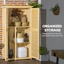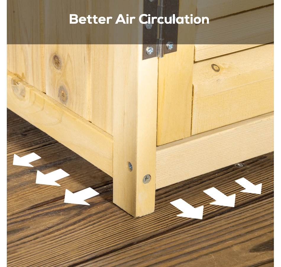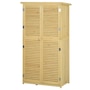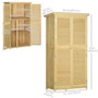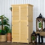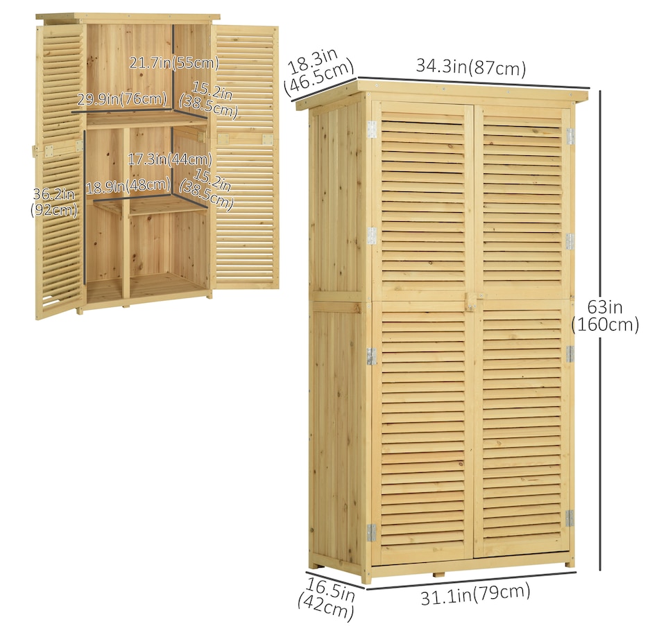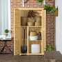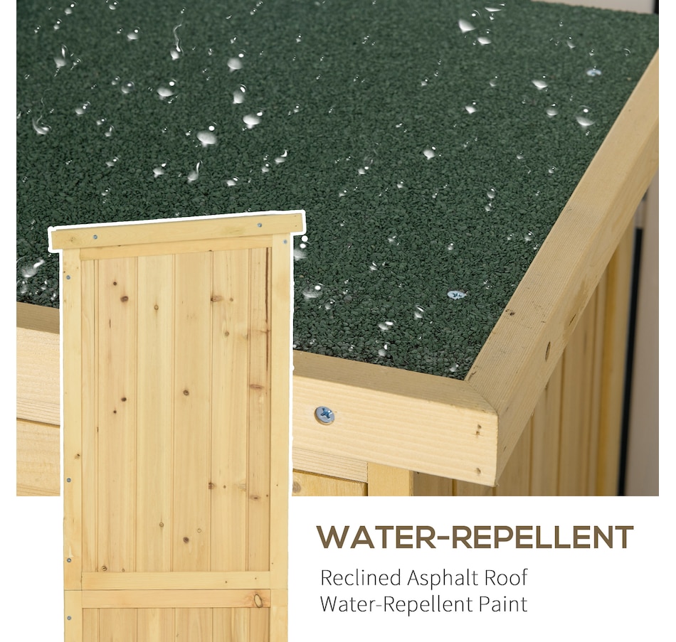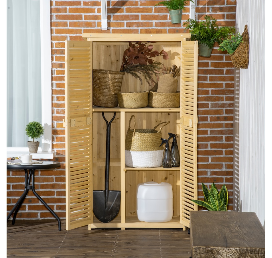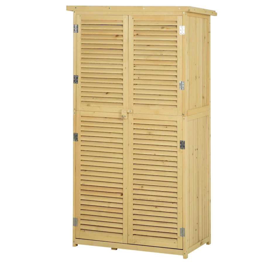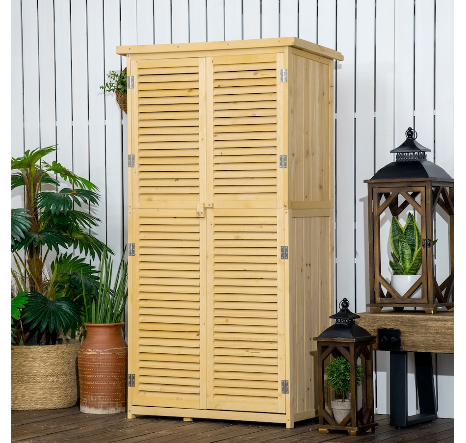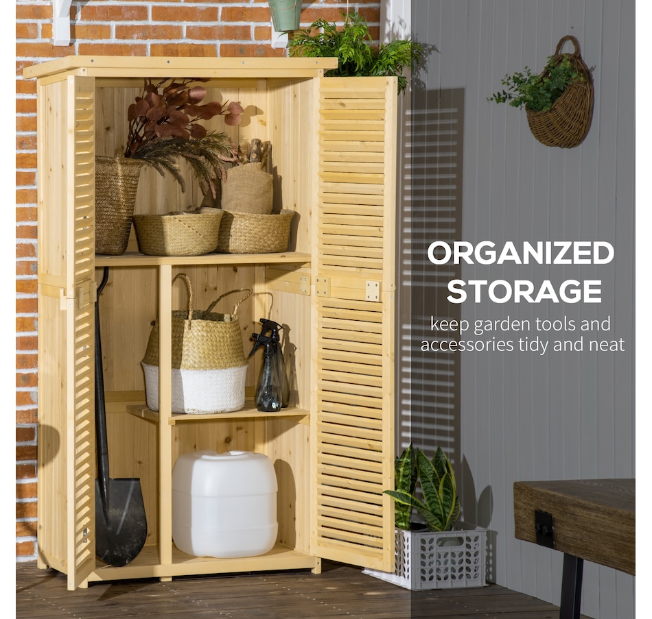 Vertical storage sheds from Outsunny provide storage and organization for your gardening tools and outdoor essentials. With three shelves at the bottom and a larger space on top, we made sure to have plenty of space. The slanted asphalt roof prevents water from pooling, and the material prevents water from seeping into the tool cabinet. The backyard storage's two wooden doors have a wooden lock to keep your tools safe. Check out the outdoor tool storage and get your yard organized.