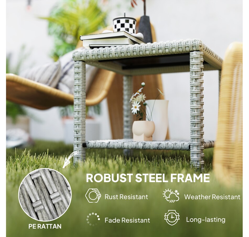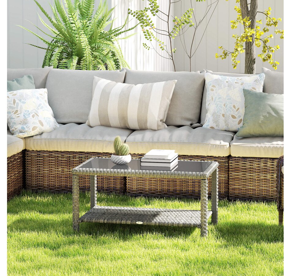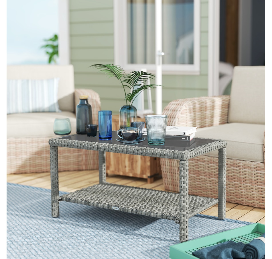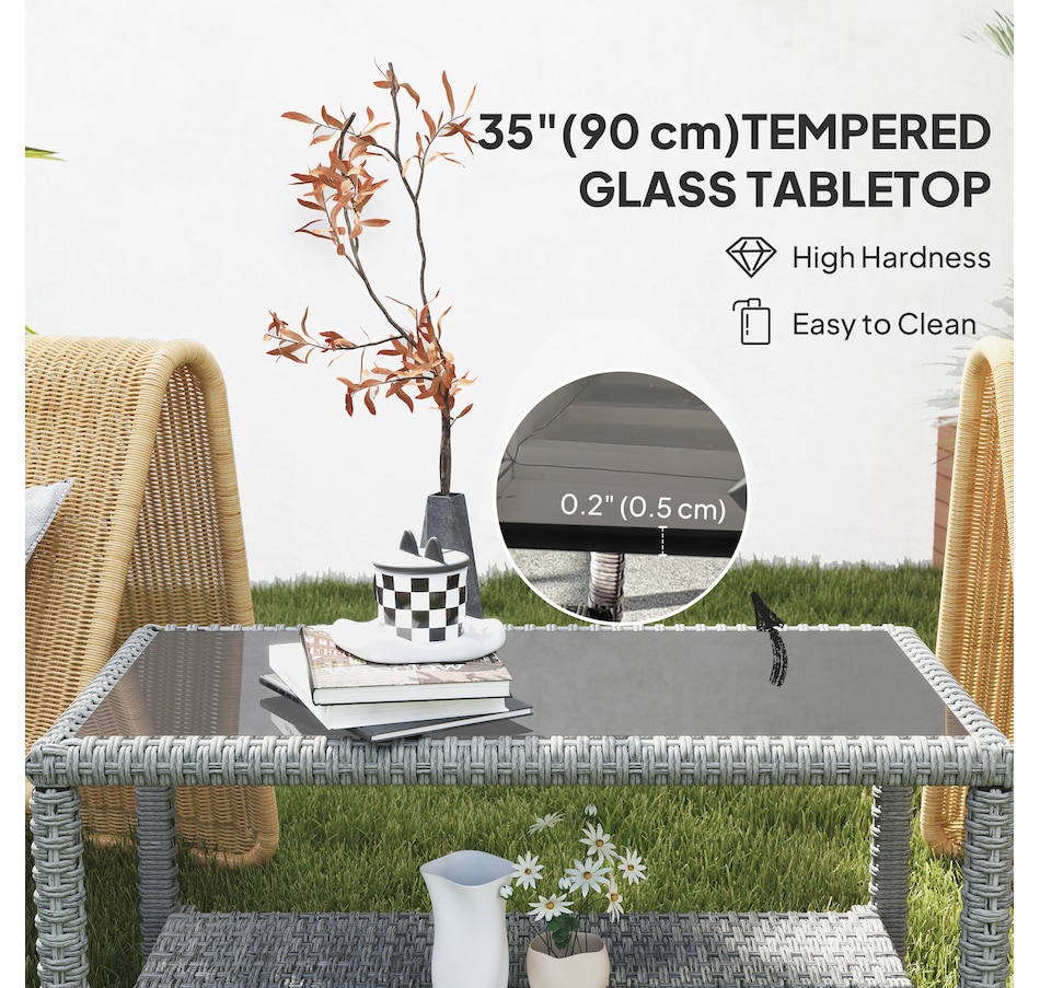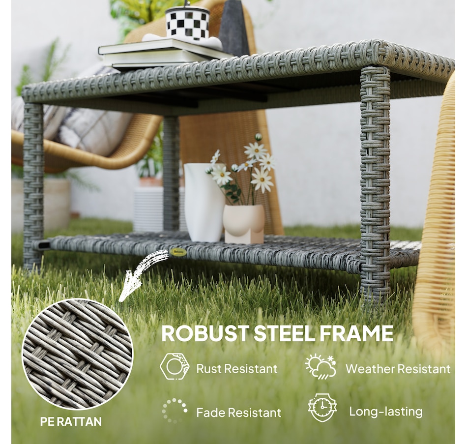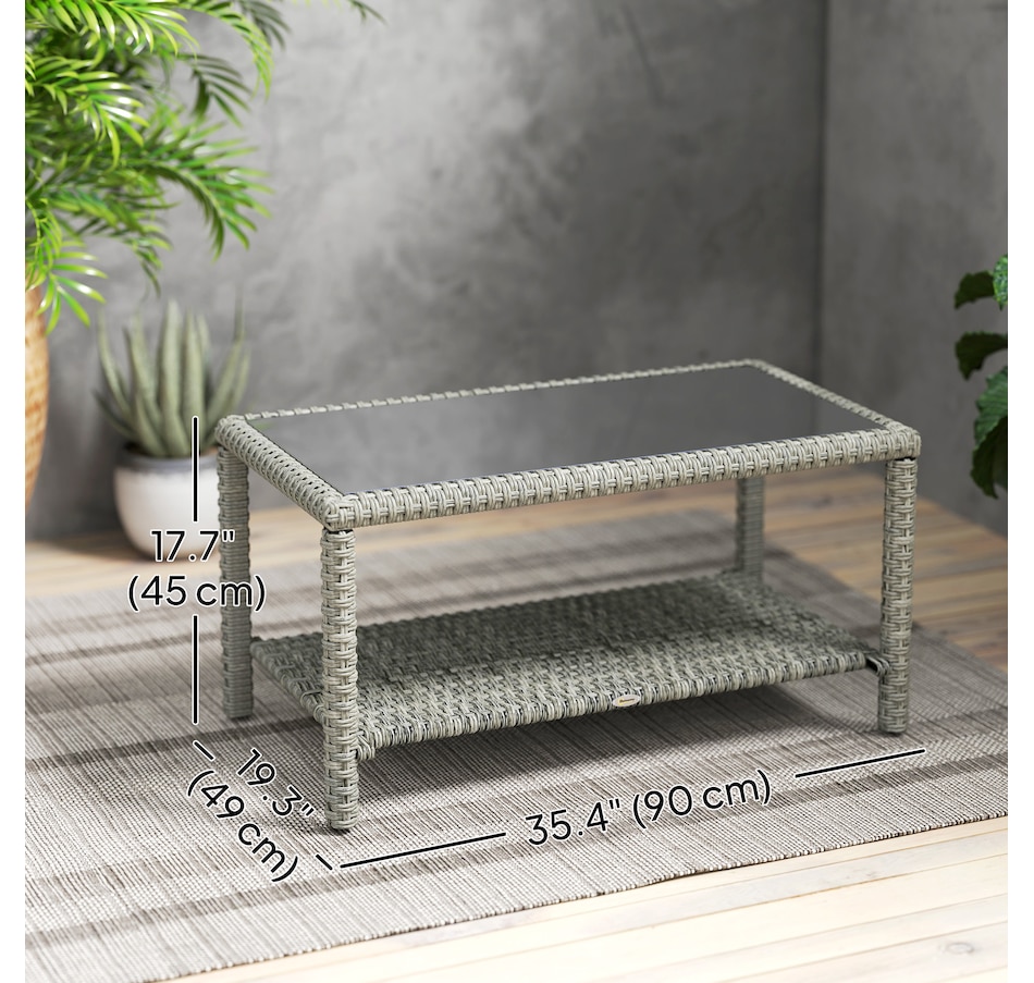 Discover the charm and versatility of the Outsunny Rattan Coffee Table. A chic staple for any home, this low table blends seamlessly from patio to poolside with its elegant rattan design. Enjoy a clutter-free zone with its double-layer glass coffee table with storage, all supported by a robust steel frame. Elevate your living space effortlessly!