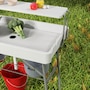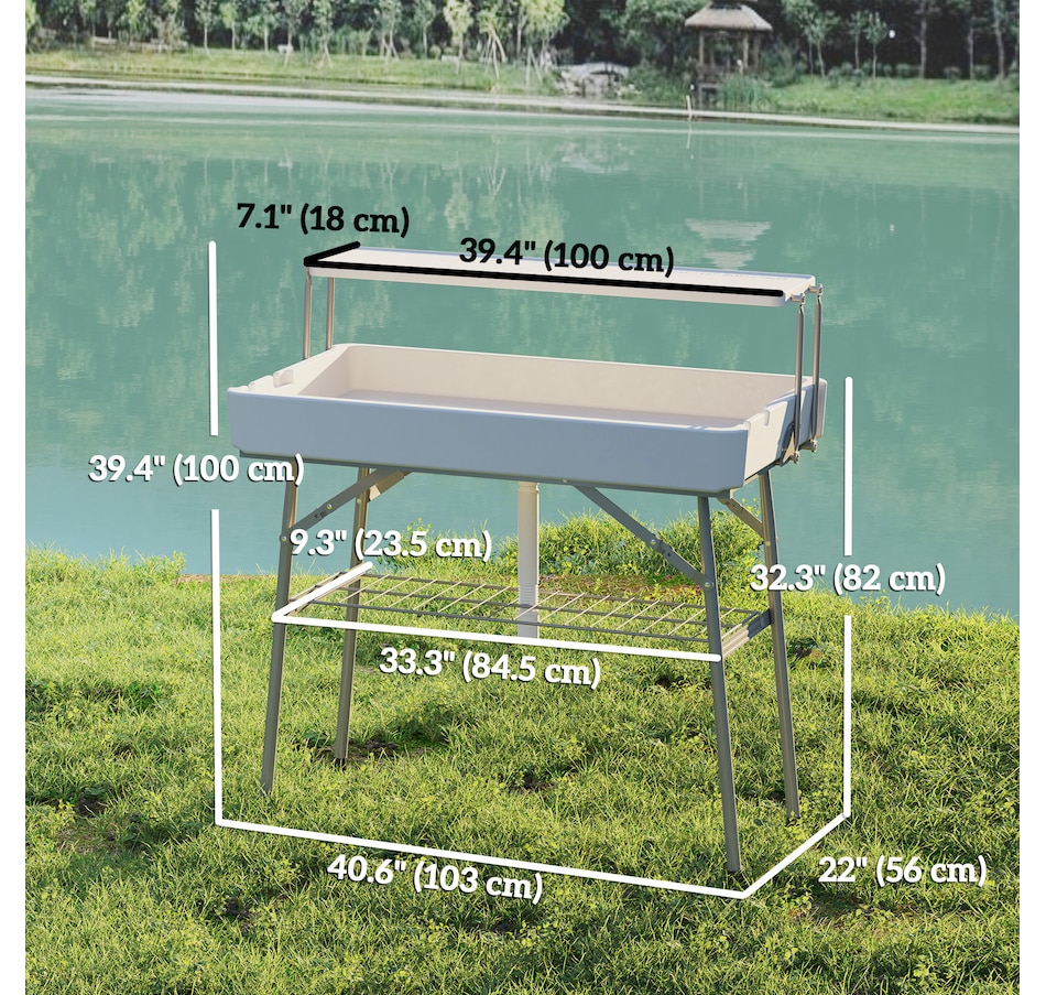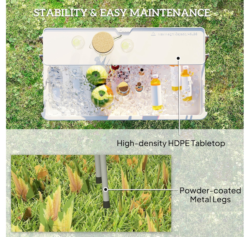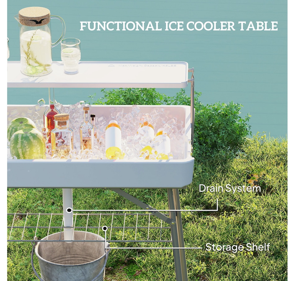 Elevate your outdoor gatherings with the Outsunny party cooler table! This versatile outdoor cooler doubles as a functional table with a built-in drainpipe and extra storage shelf and as a cleaning station for fish or other items. Its foldable design ensures easy transport and space-efficient storage. Great for any celebration, from backyard barbecues to beach parties, keep your drinks chilled and your guests happy with this stylish patio cooler table.Features: