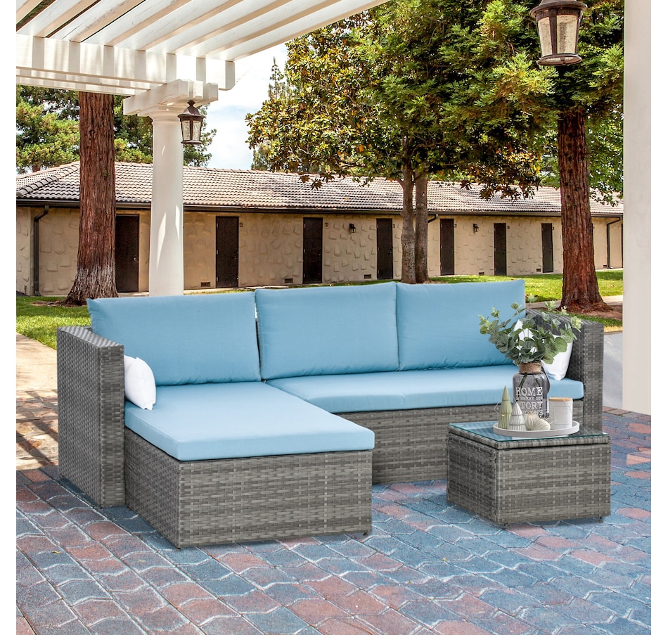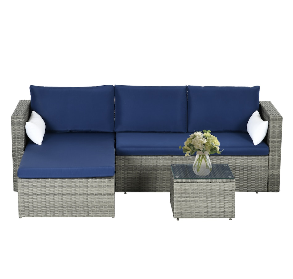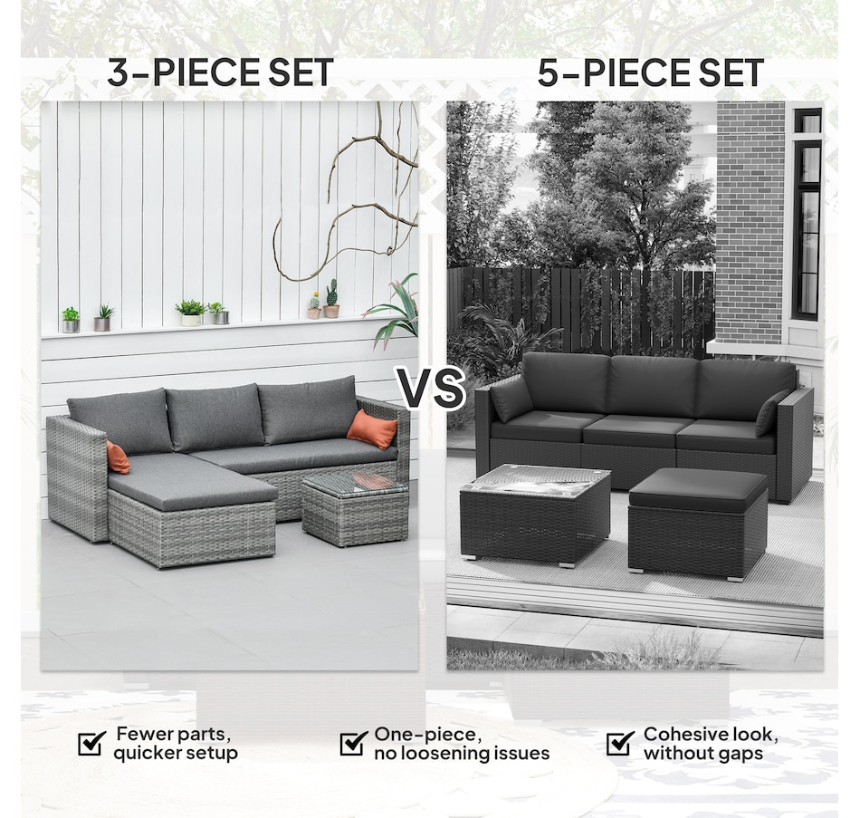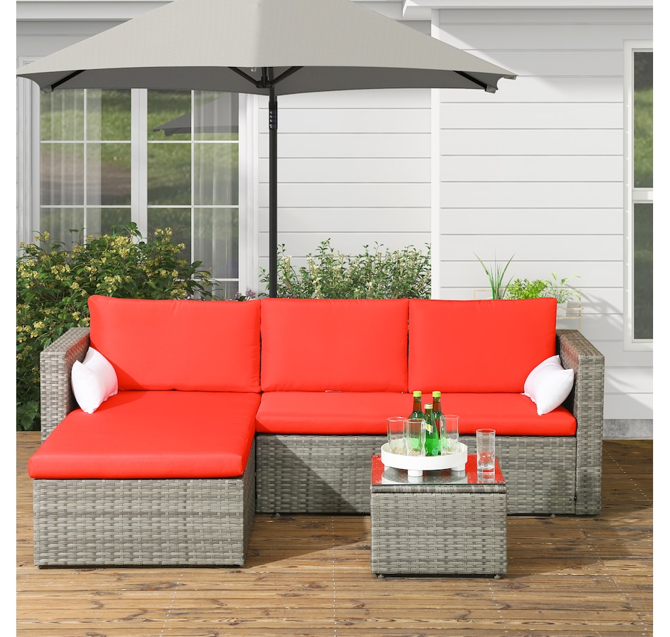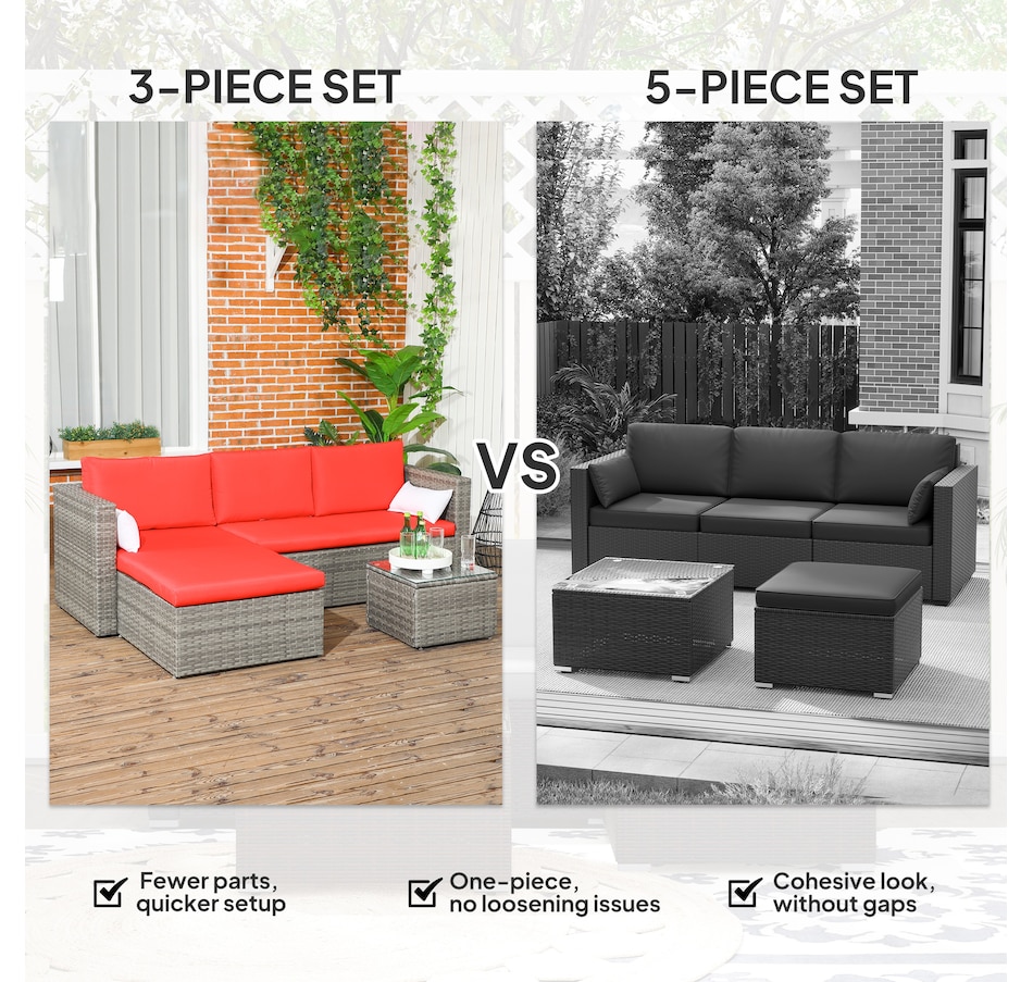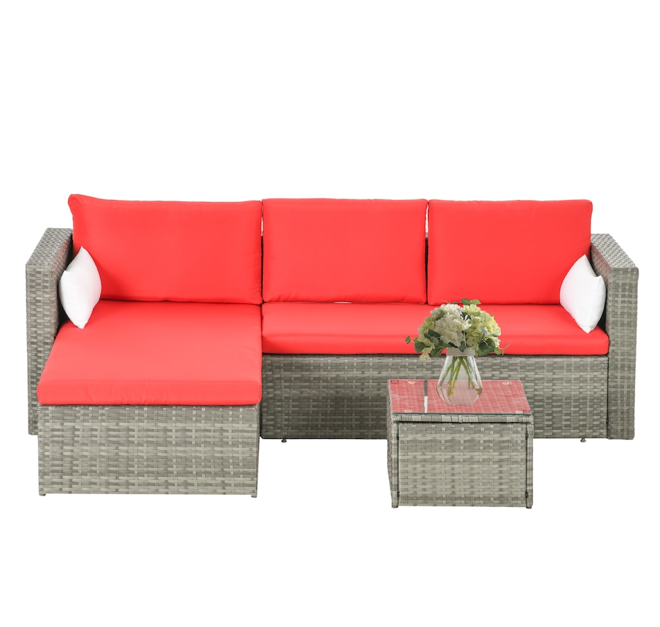 ● Modern 3-piece reconfigurable outdoor furniture set includes a double sofa, a corner sofa, and a coffee table