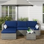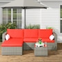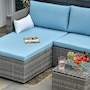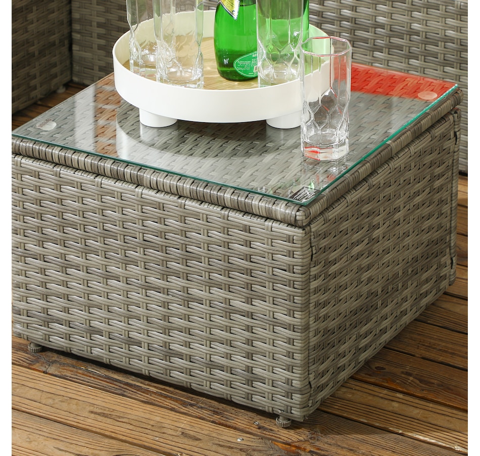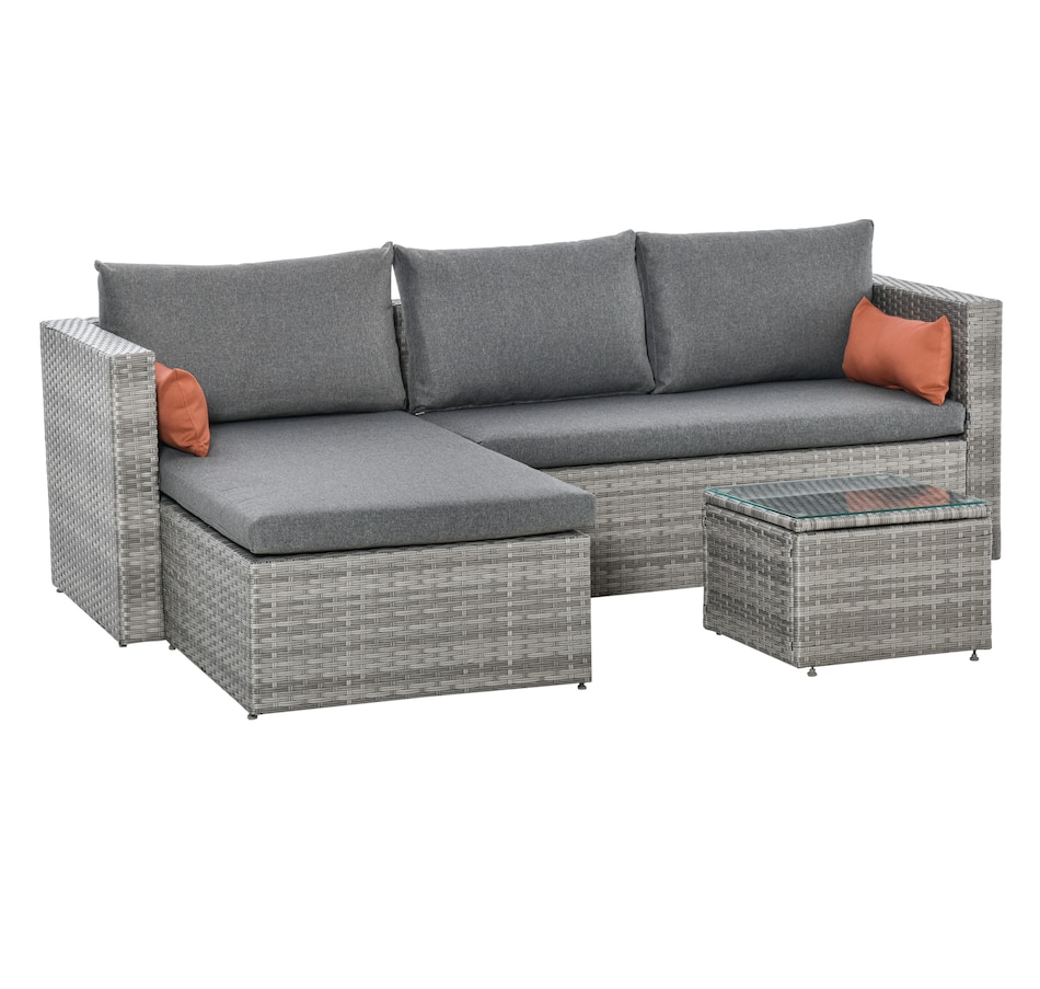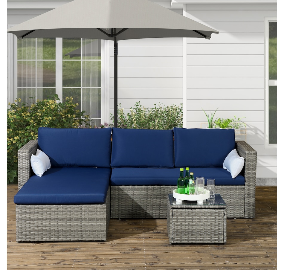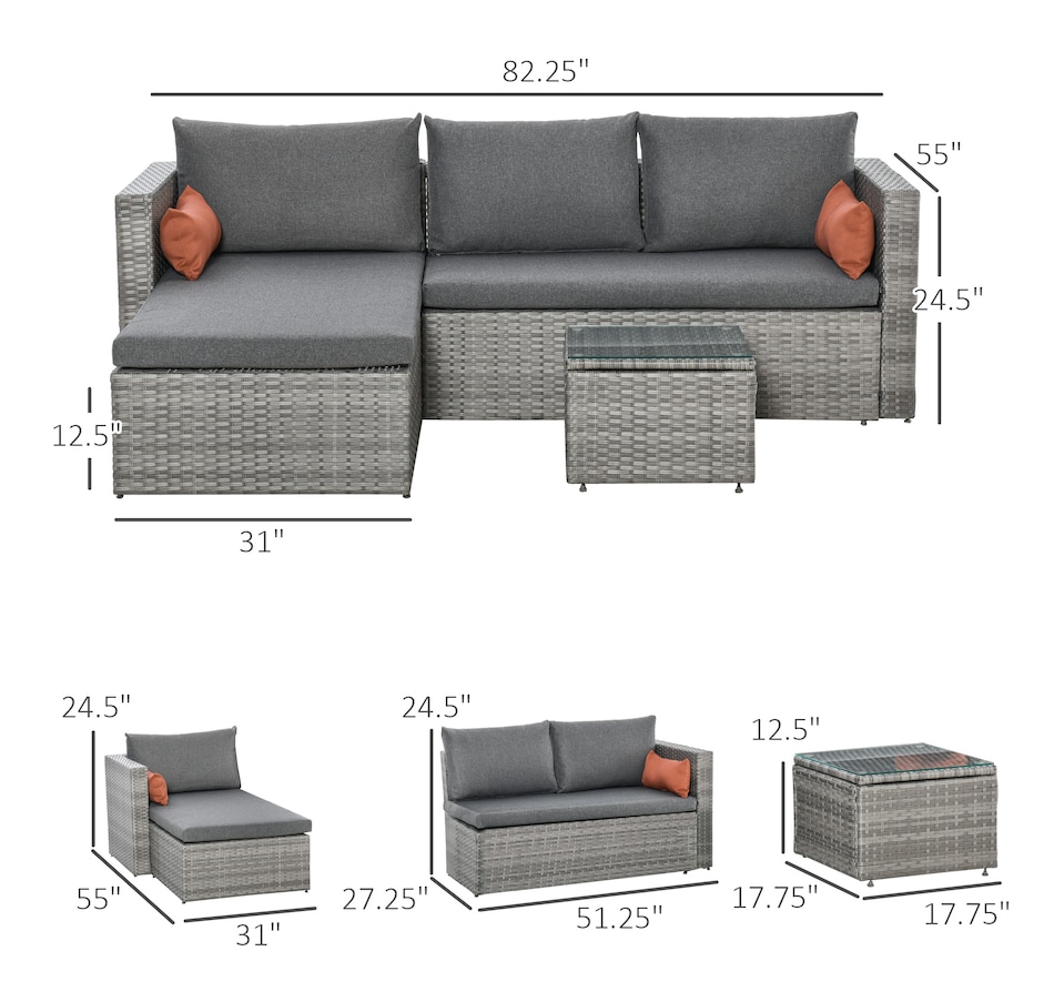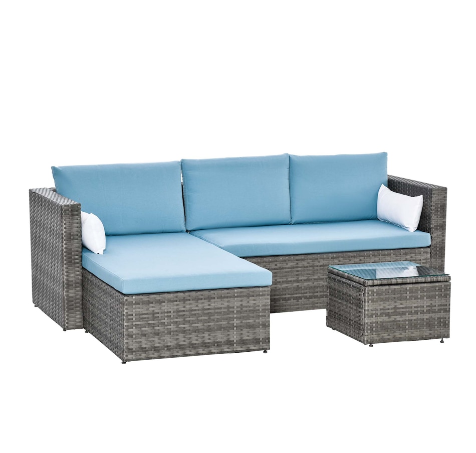 ● Modern 3-piece reconfigurable outdoor furniture set includes a double sofa, a corner sofa, and a coffee table