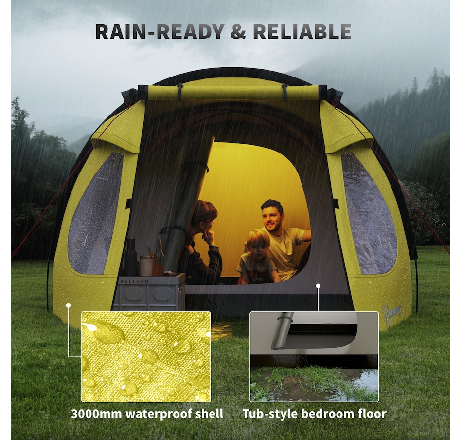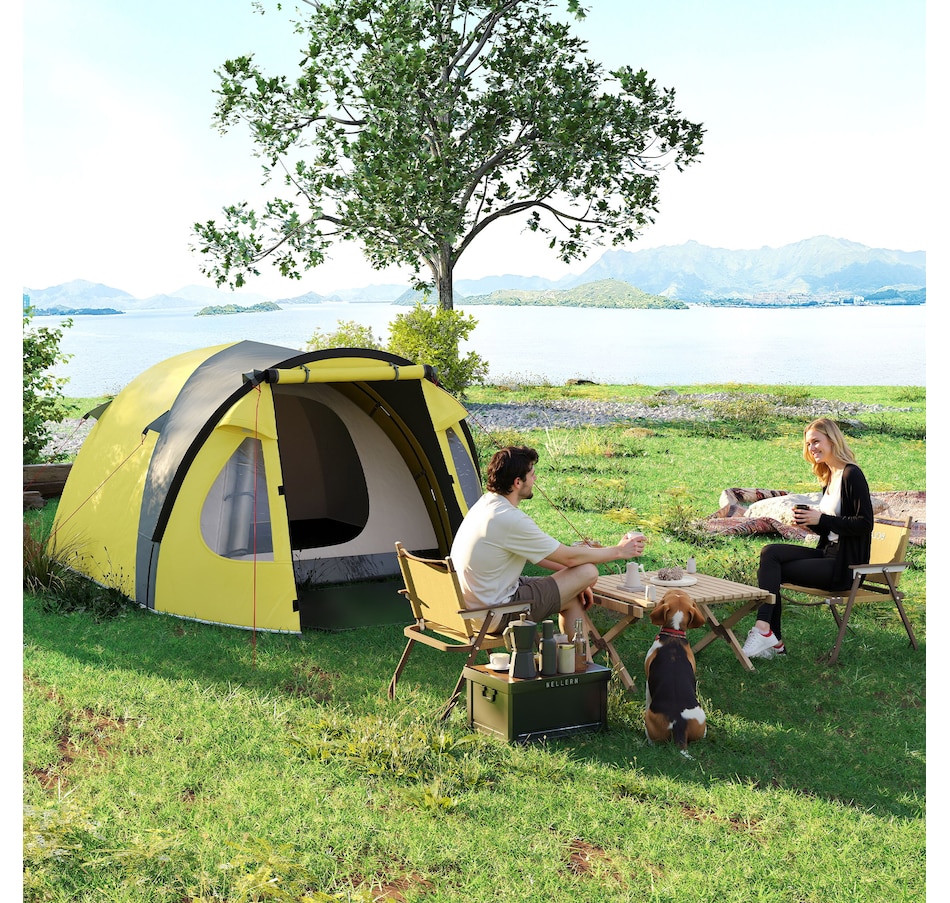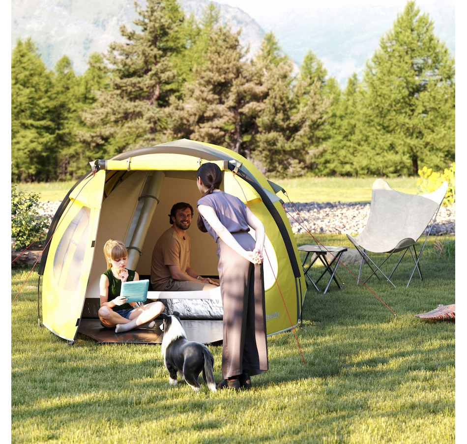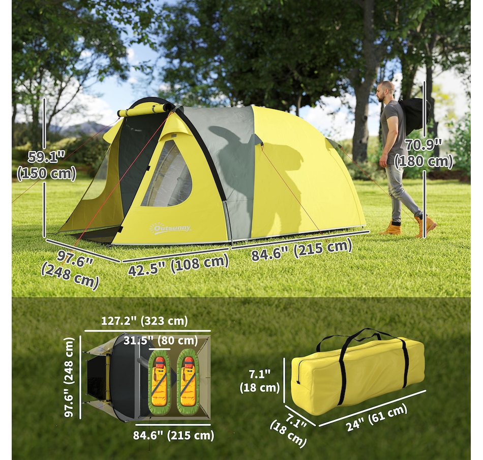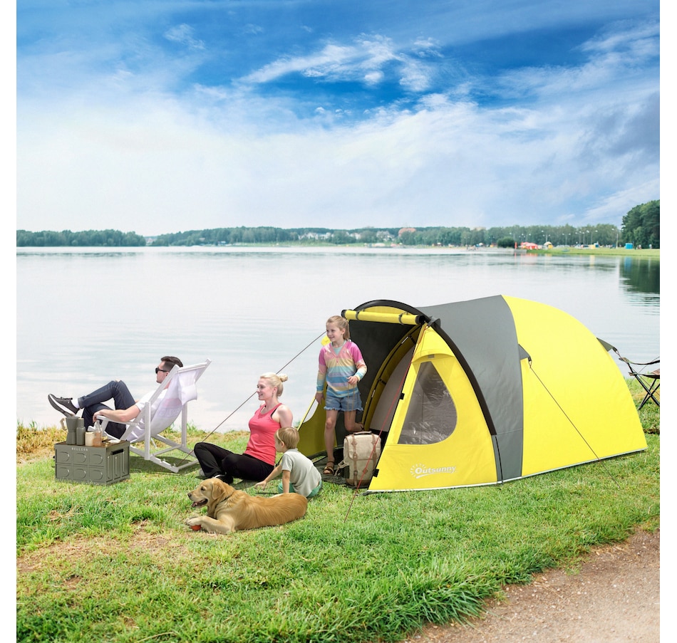 Discover the great outdoors with the Outsunny camping tent, your comfy dome tent for any adventure! This spacious tent fits 3-4 people and features a dividable bedroom for privacy. Made with polyester for 3000 mm water resistance, the 4 season tent ensures you stay dry. Enjoy the view and light from two visual windows, making it a great choice as a family tent or backpacking tent.