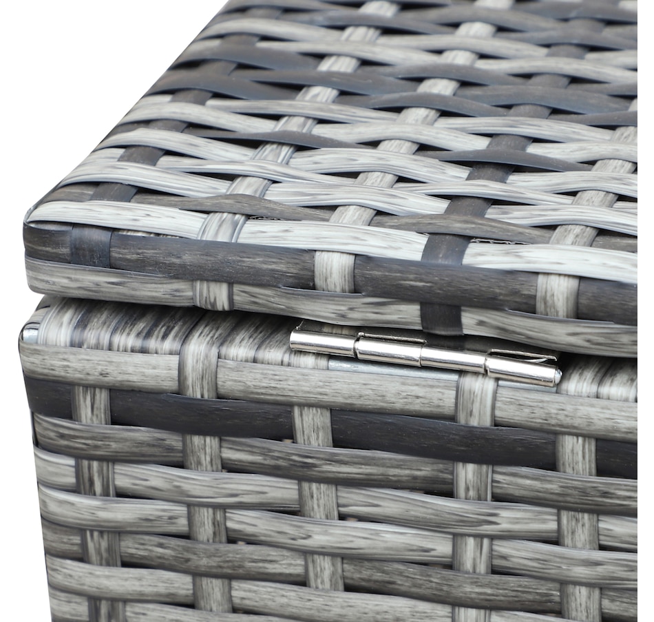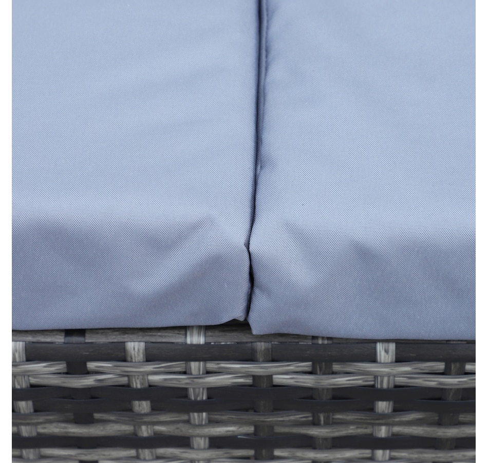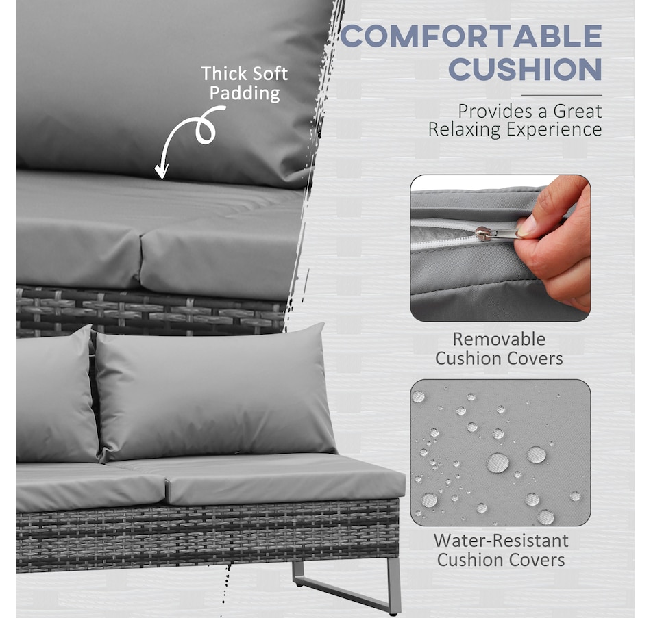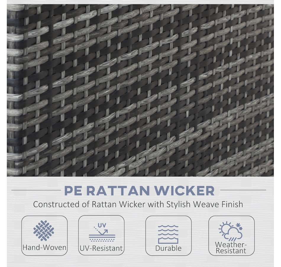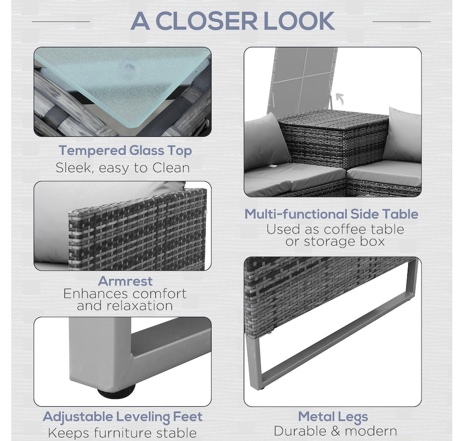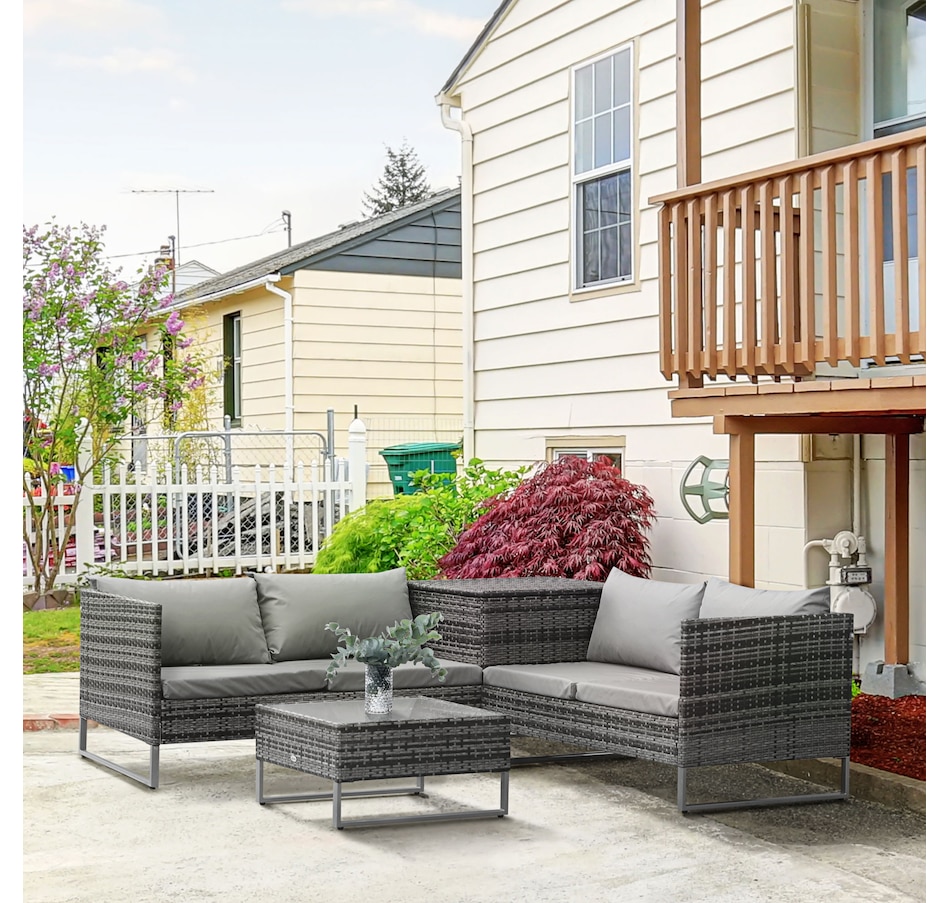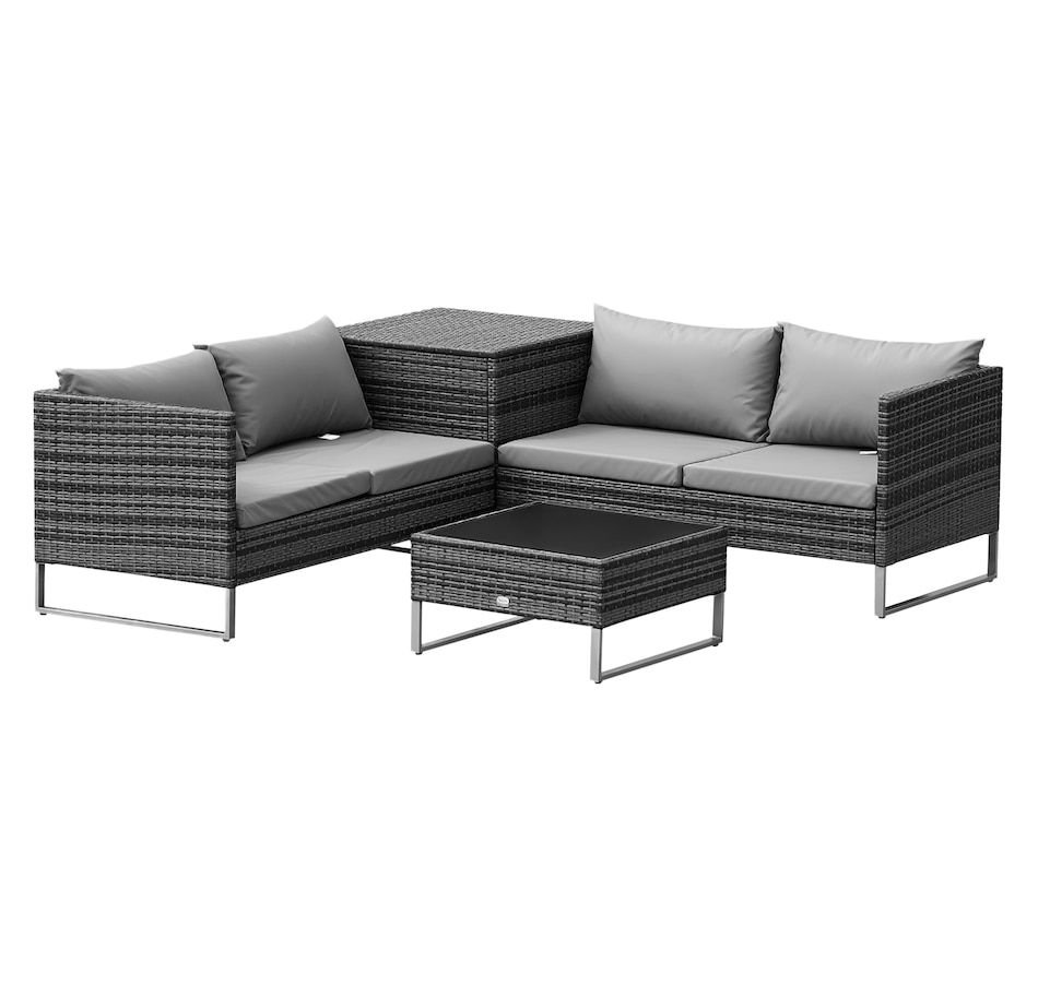 Let this patio furniture from Outsunny take the lead for your outdoor comfort this season. The conservatory furniture consists of four pieces – two two-seater sofas with a small end wall on each, a storage trunk and a small coffee table. Each piece of the outdoor furniture is made of metal frame for strength, with PE wicker wrapped for weather-resistance, with thick grey cushions for all-day comfort. The corner trunk provides lots of storage room to keep your garden tidy.Features: