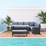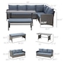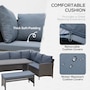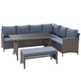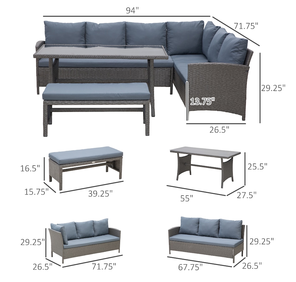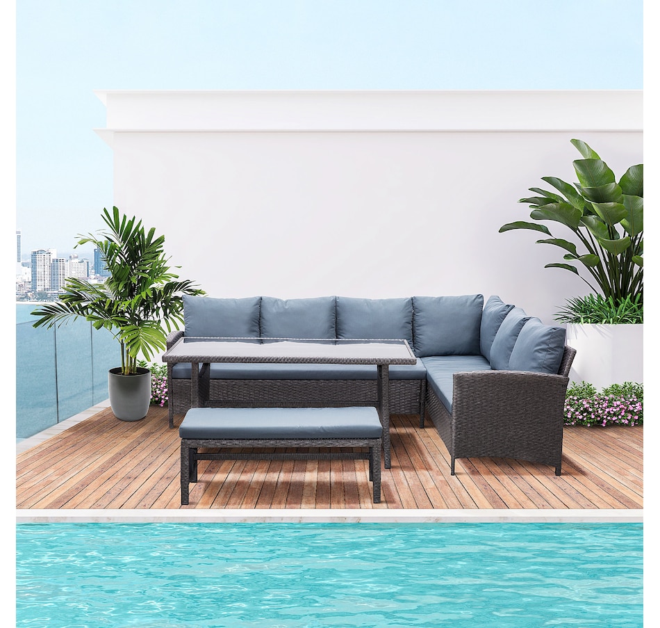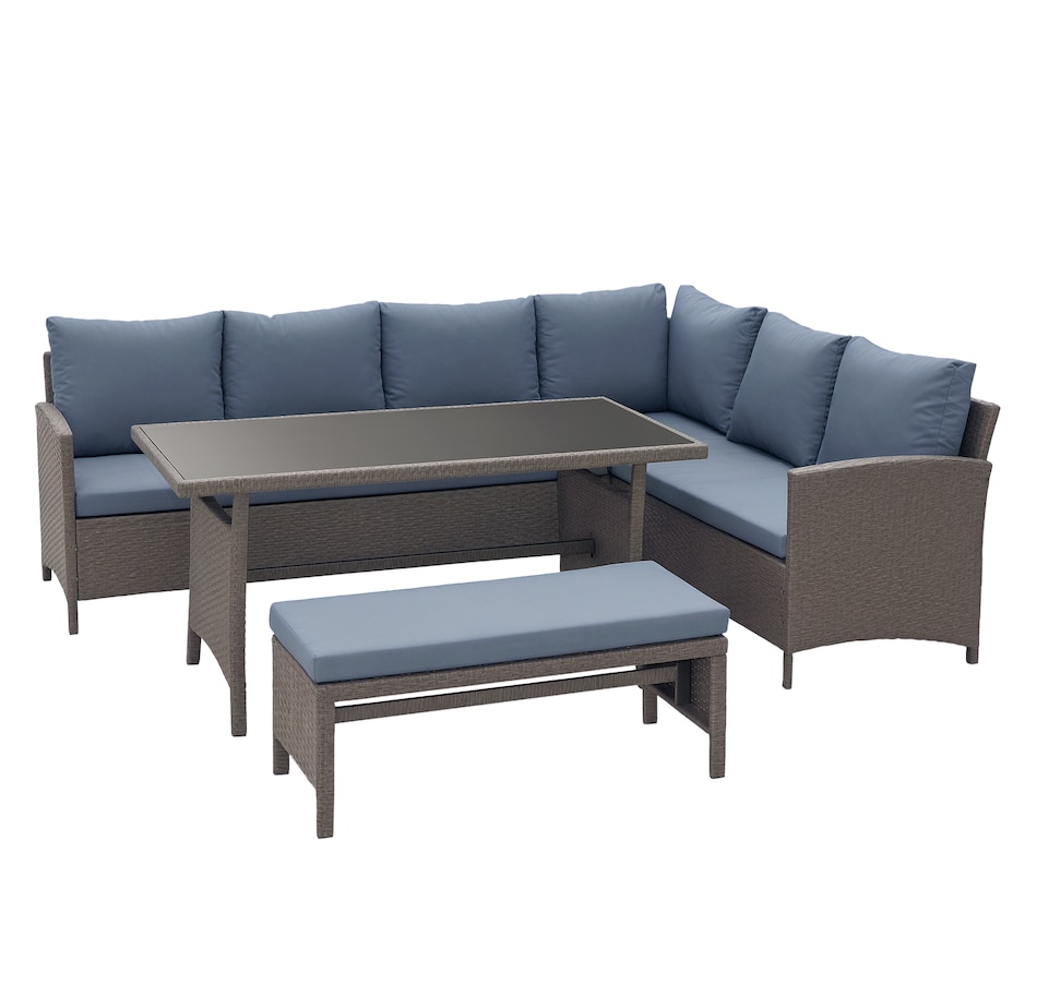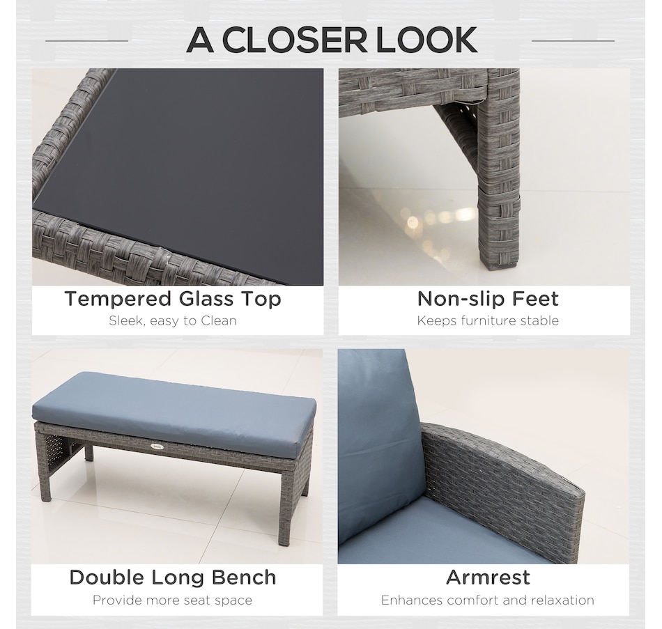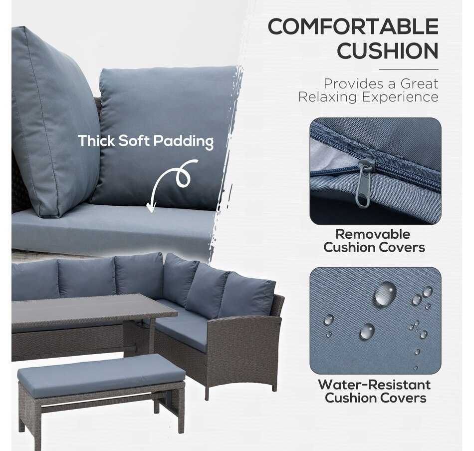 Brighten your backyard with our Outsunny's 4-Piece Outdoor Rattan Wicker Dining Set and make the exterior of your home just as inviting as the inside. Wide seat design can sit 7-8 people the same time. This set can withstand years of reliable outdoor use. Dining table and the matching bench can be used individually or together with the 2 sofas for extra dining experience. Decorative and functional, they create an inviting setting that you and your family will want to use throughout the year.