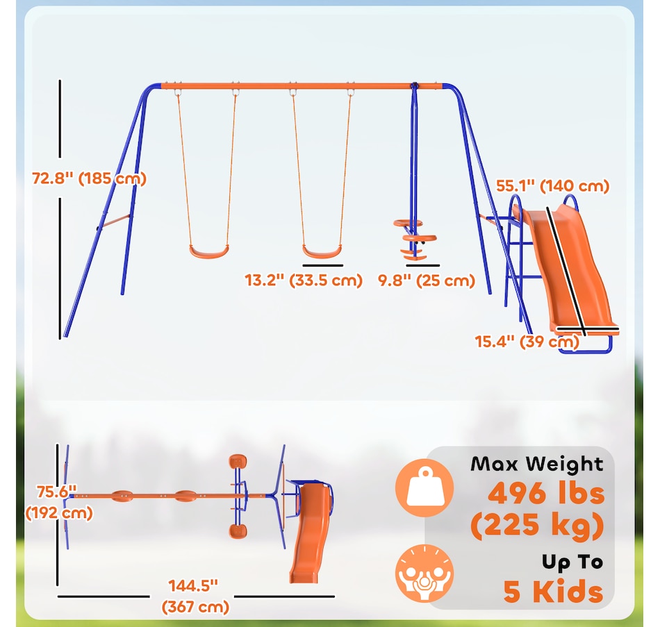 ● Maximum Load: Each swing, glider and slide: 99 lbs(45kg);