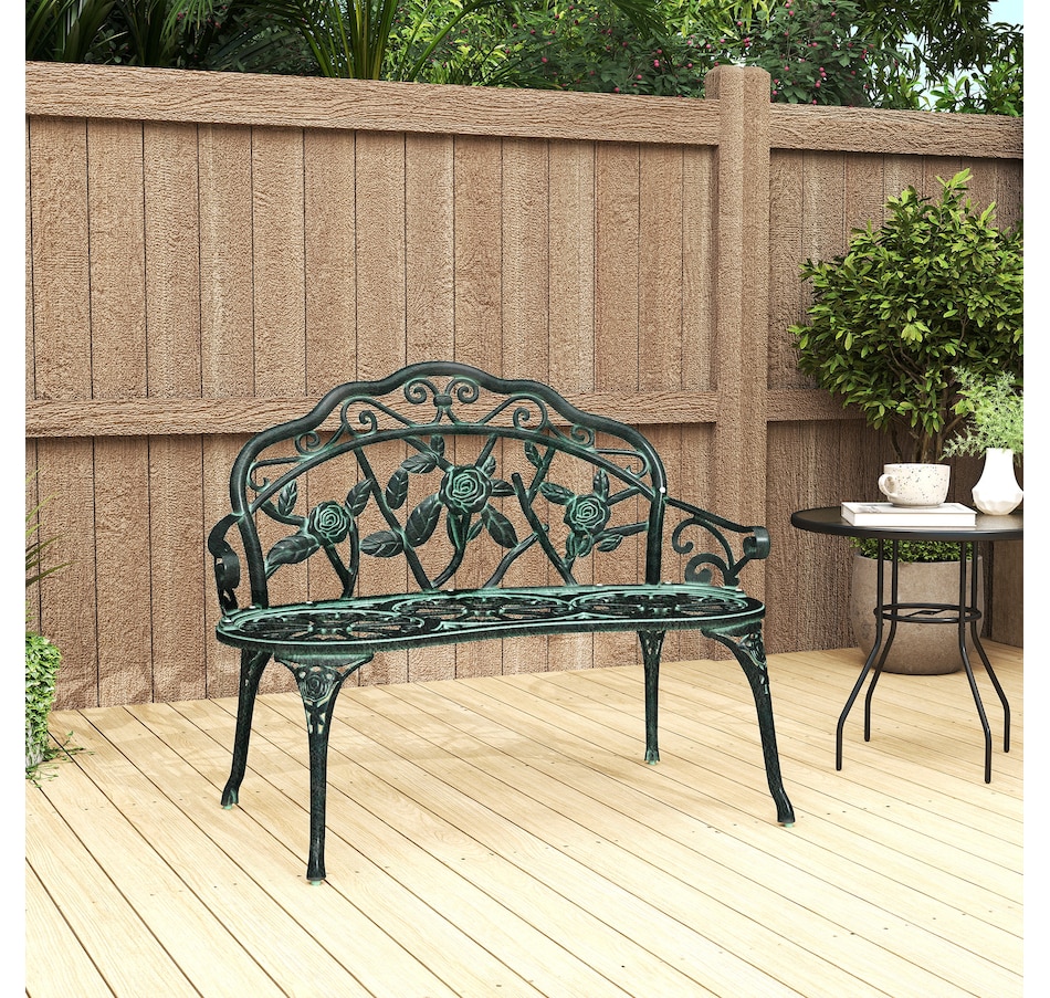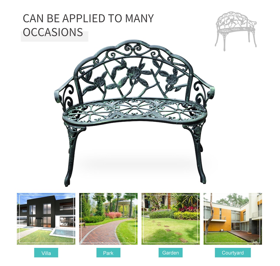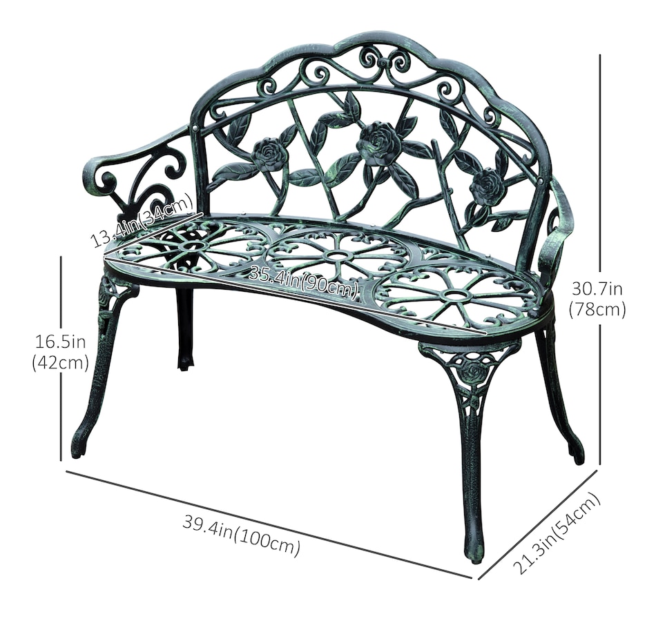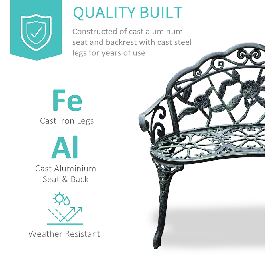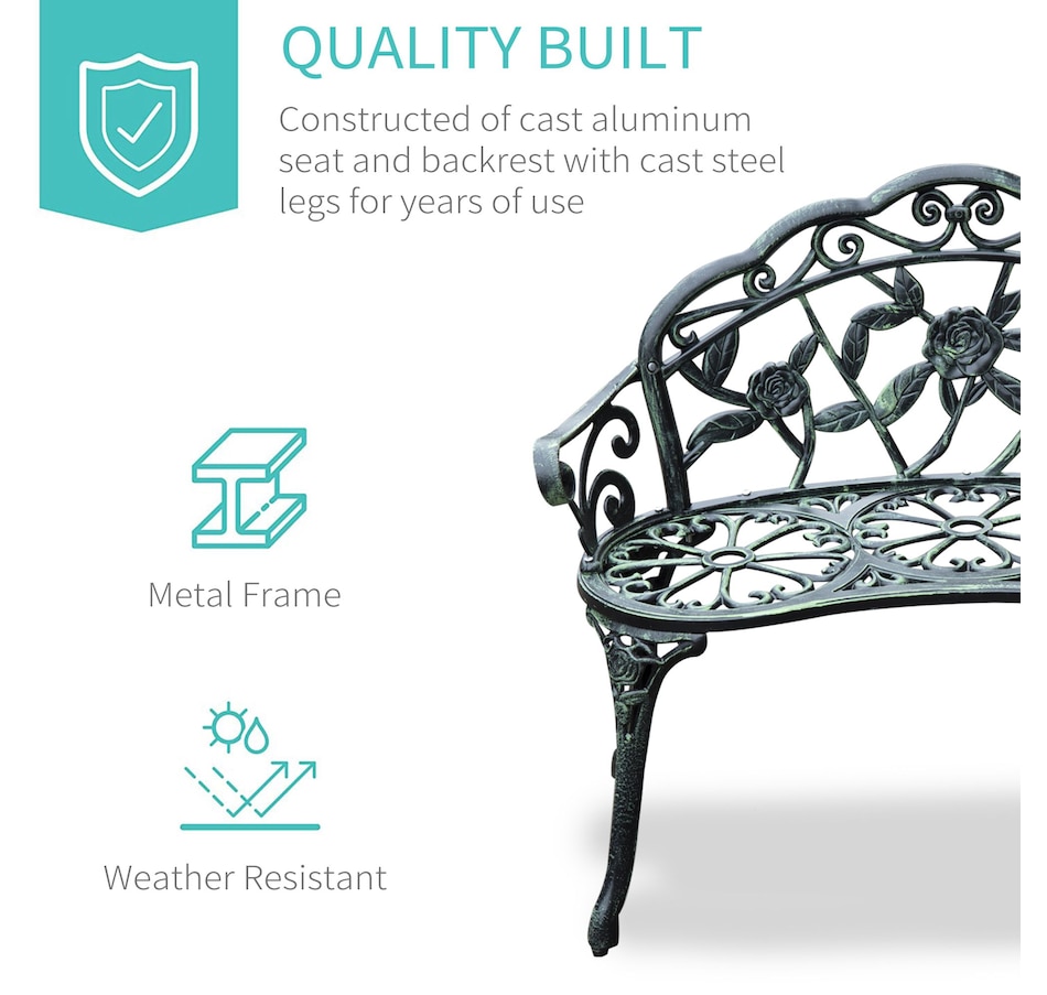 Make your garden or path complete with an Outsunny antique rose style bench to sit and rest on while enjoying the great outdoors. Made of cast aluminum and lightweight yet durable metal this bench is sturdy yet comfortable enough to relax on in the sun. The seat is composed of metal to provide optimal support. The antique look that will fit perfectly with any outdoor décor and allow it to maintain its stylish look. Add a touch of style to your backyard or garden with this beautiful Outsunny bench.Features: