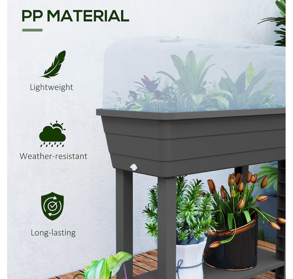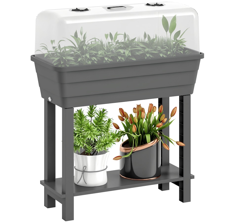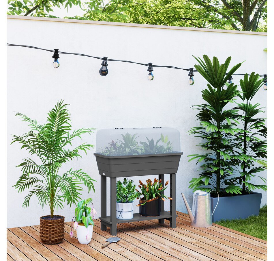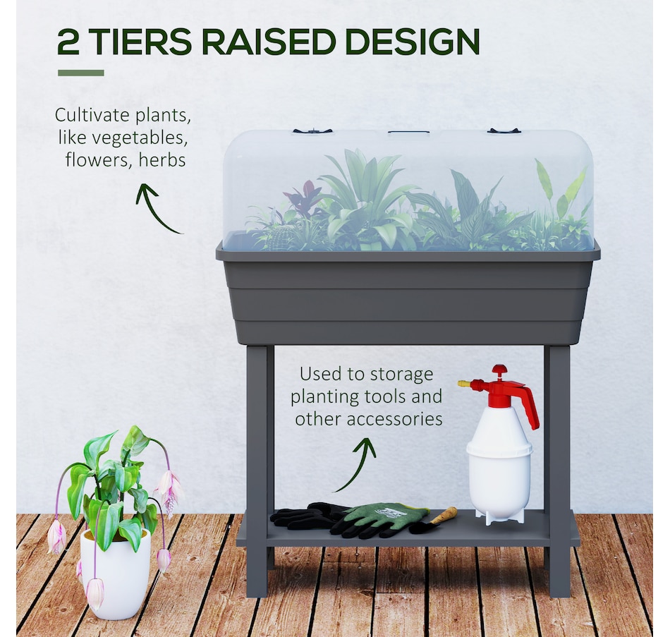 Discover the joys of gardening with the Outsunny Raised Garden Bed! This flower bed features a top box with a ventilated lid to protect your plants, along with a convenient bottom shelf for storing gardening essentials. The transparent lid lets you easily check on your plants, ensuring they thrive in their cozy, controlled space. Great for transforming any outdoor area into a lush oasis.