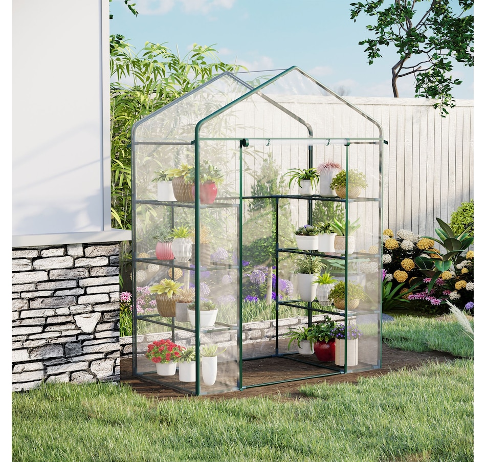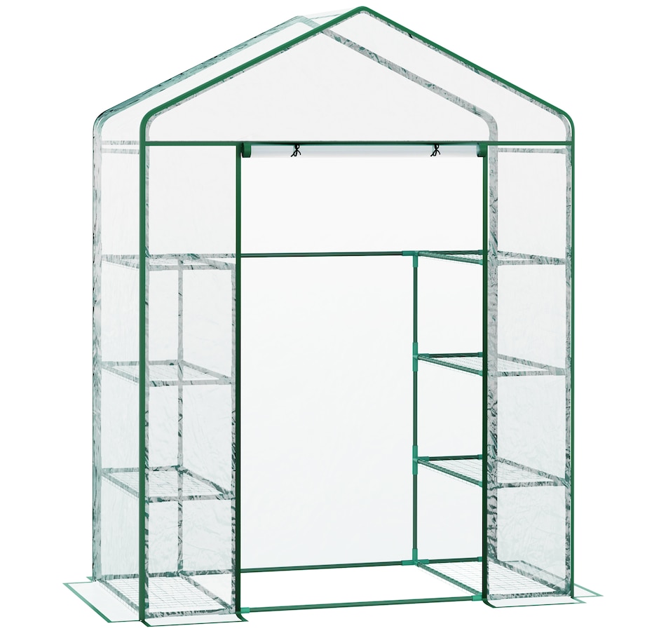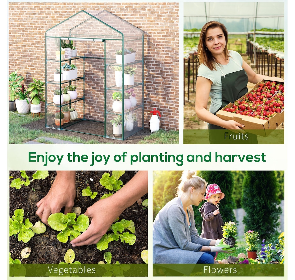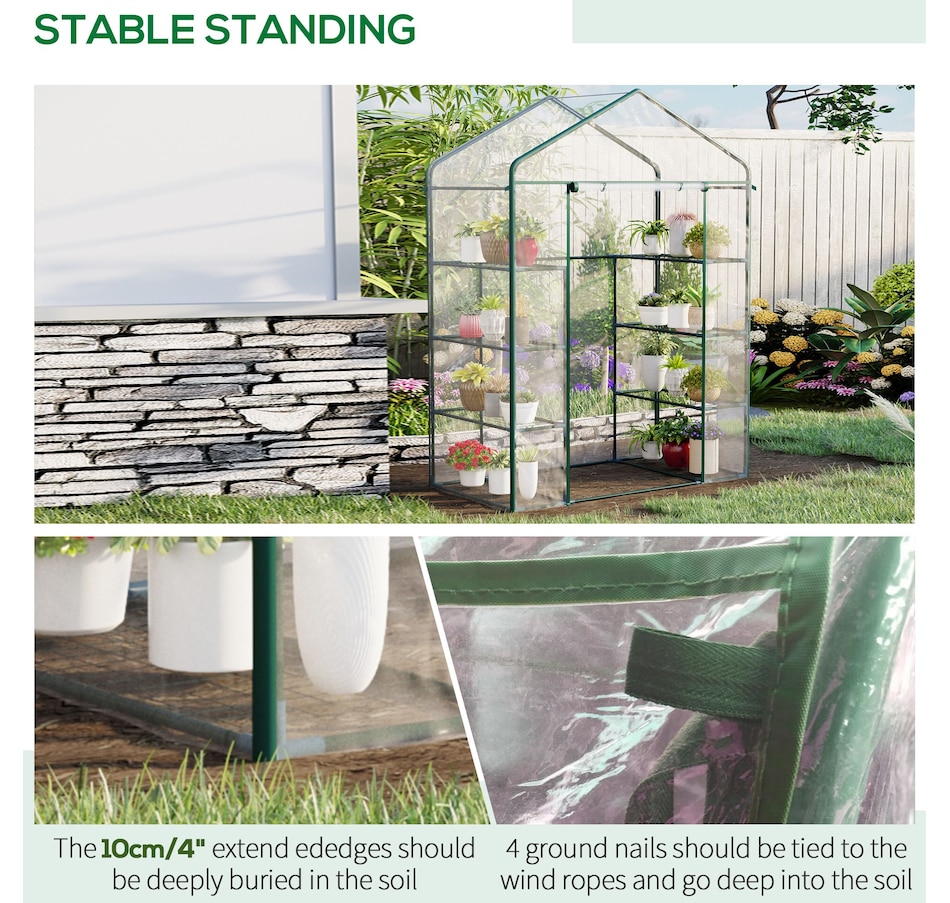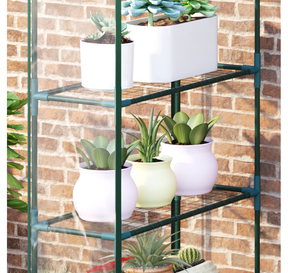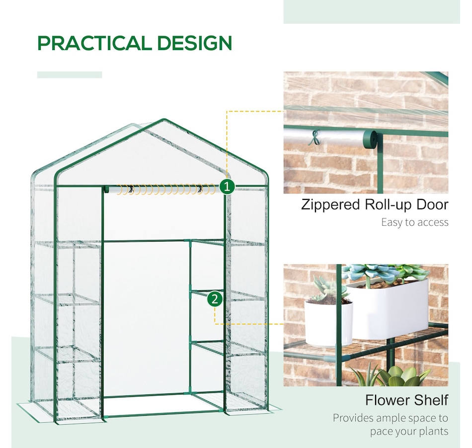 ● Equipped with 8 Steel wire shelves for holding seed trays, potted plants and tools