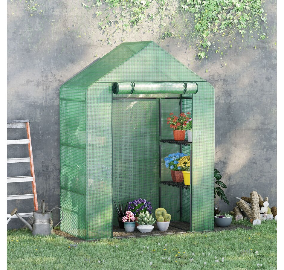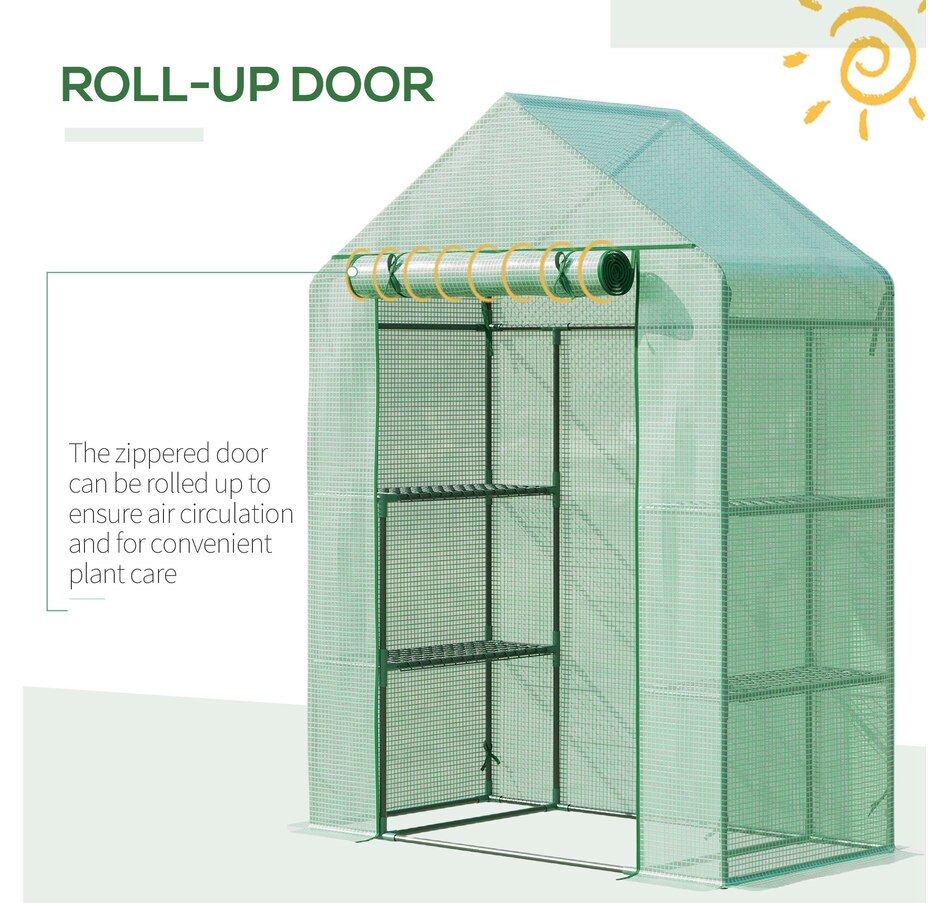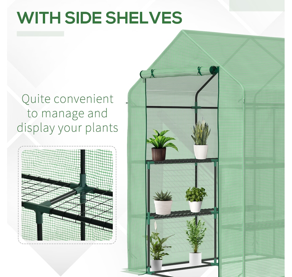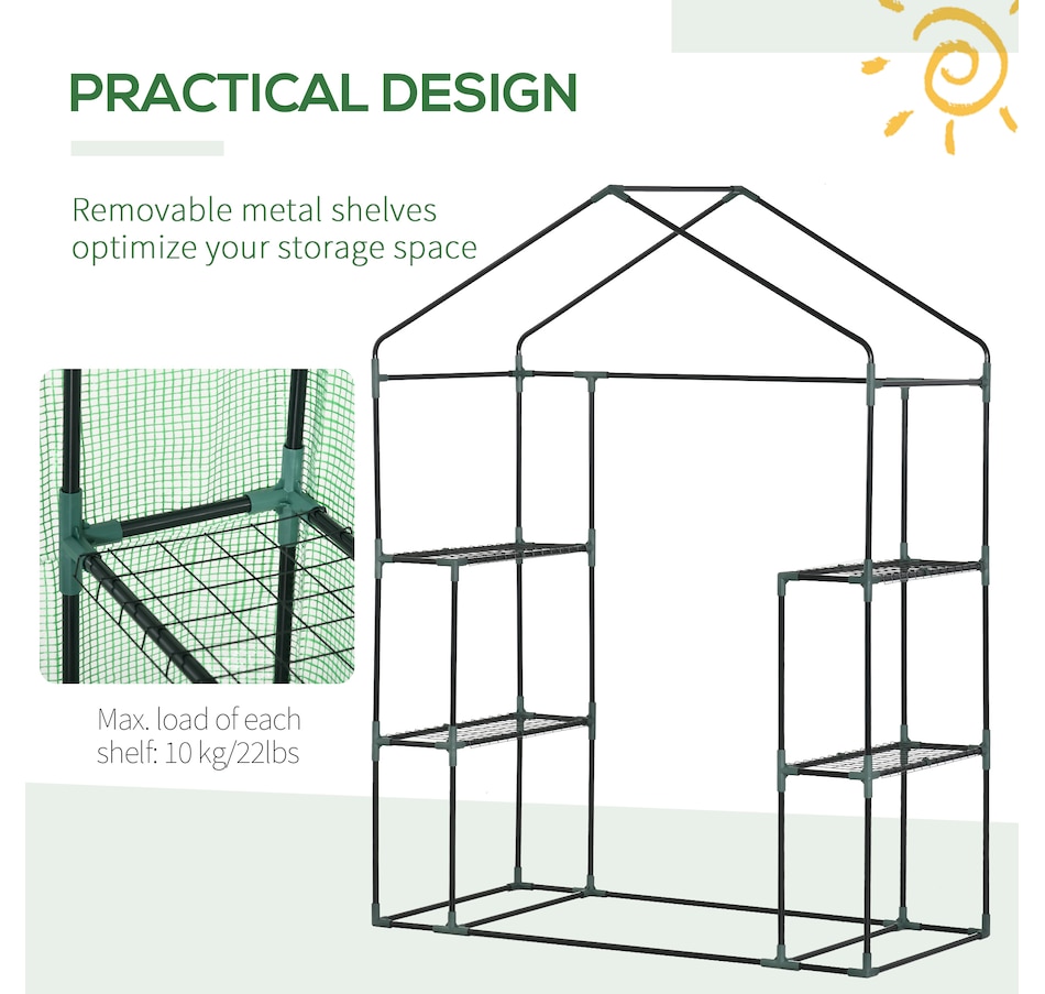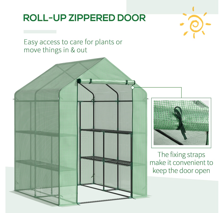 This Outsunny portable walk-in greenhouse is ideal for seedlings and growing young plants. It has a front door panel which retains solar energy to help enhance plant growth while also providing easy access and optimal air circulation. Built using sturdy steel, the 4 wire shelves provide ample space where you can place your potted plants or seedling trays. Add the Outsunny walk-in greenhouse wherever it's convenient for you to enjoy fresh flowers and healthy vegetables all year round!