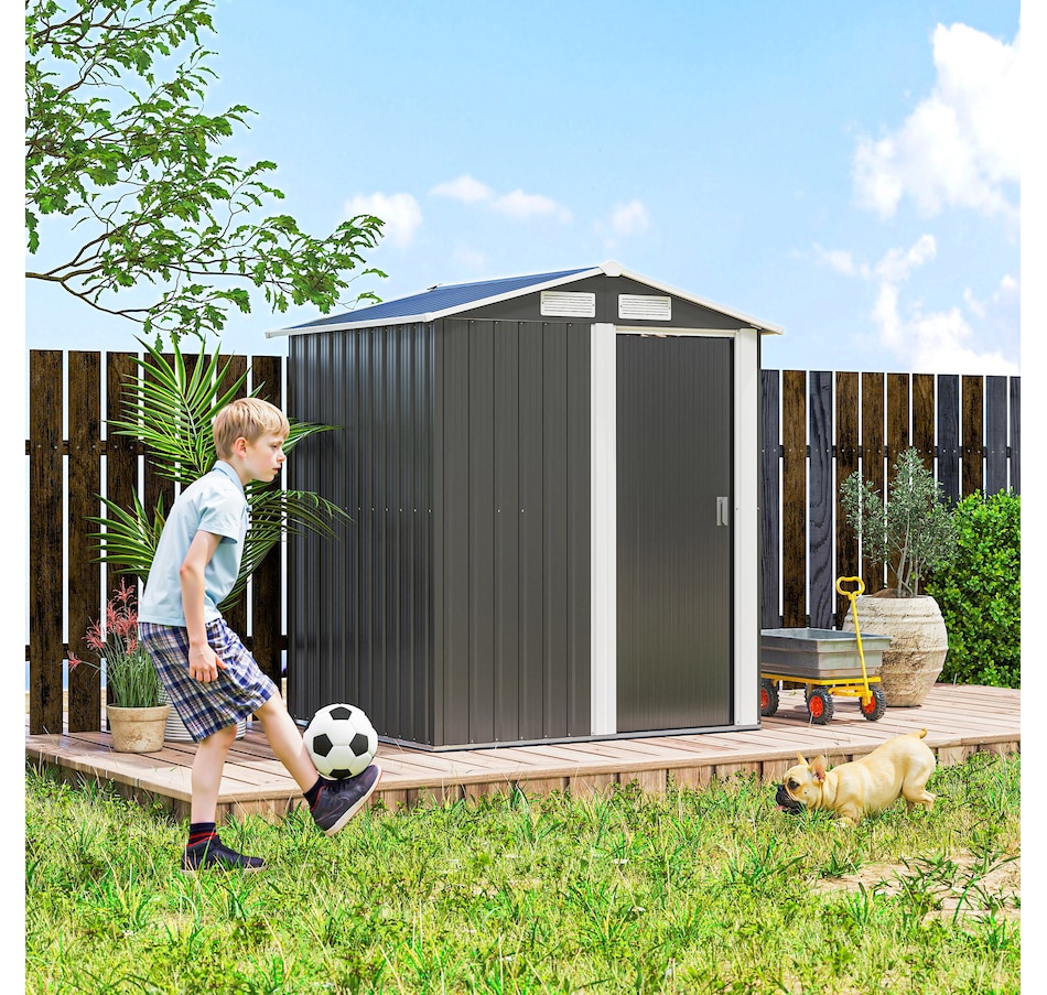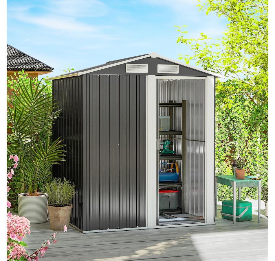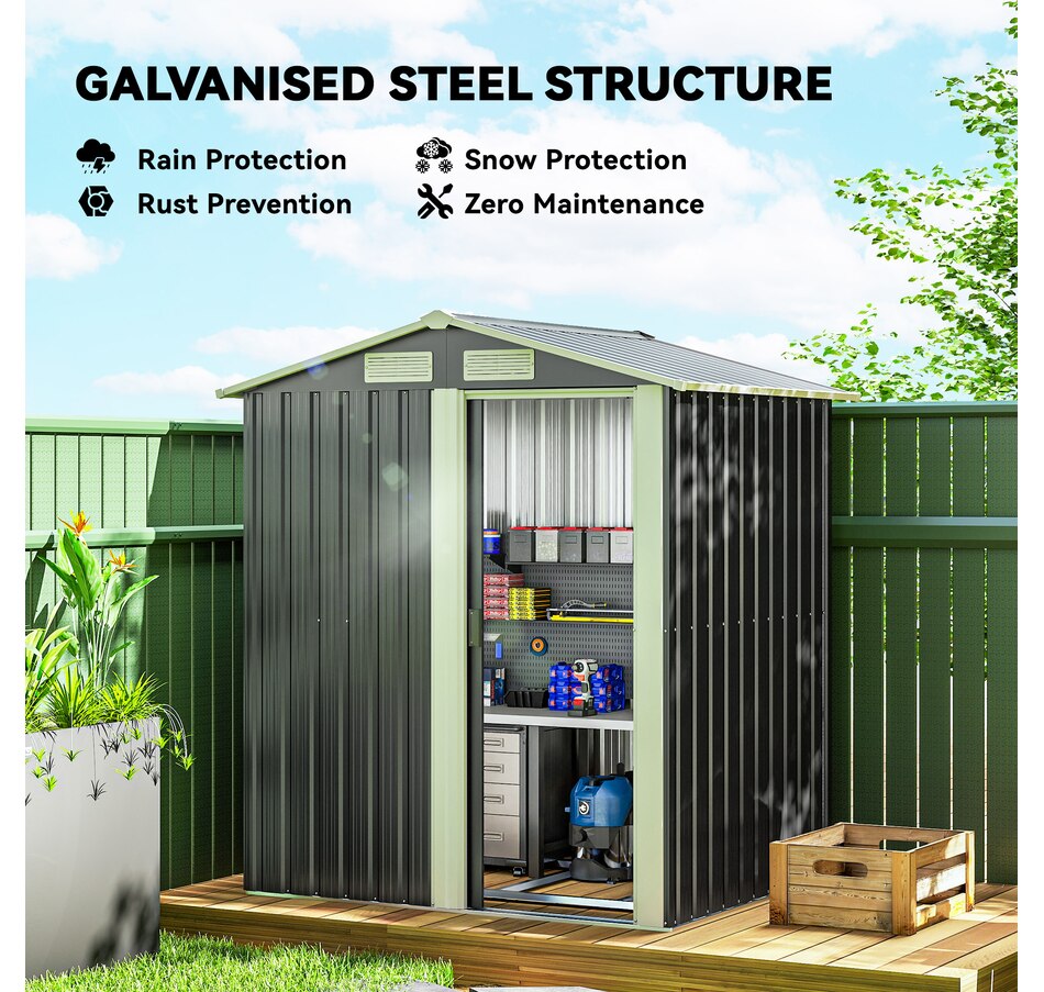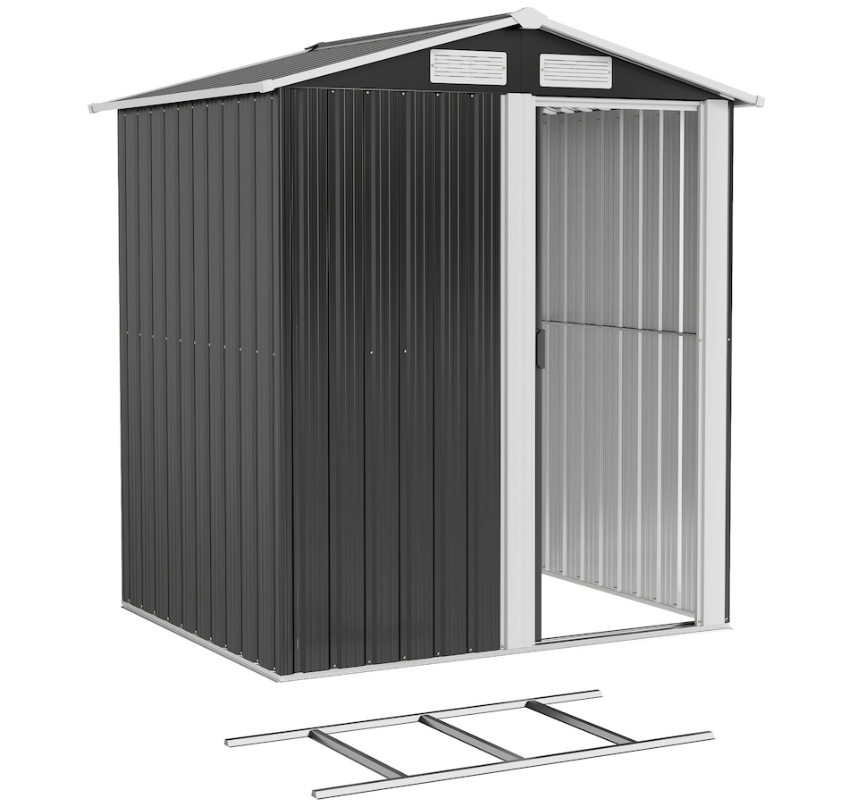 Essential outdoor shed with a sheltered roof to keep safe. This Outsunny shed is a must for every home. Made from steel, the shell is strong and tough, and it is built with a sliding door to open and access inside easily. The built-in ventilation slots allow air inside, keeping contents aerated and fresh. A sloping roof helps prevent rainwater and other liquids from building up, so nothing leaks inside. A foundation kit is included for the tool shed to stand level on the ground.