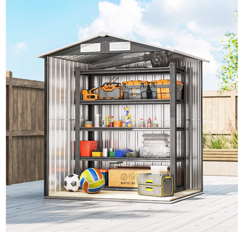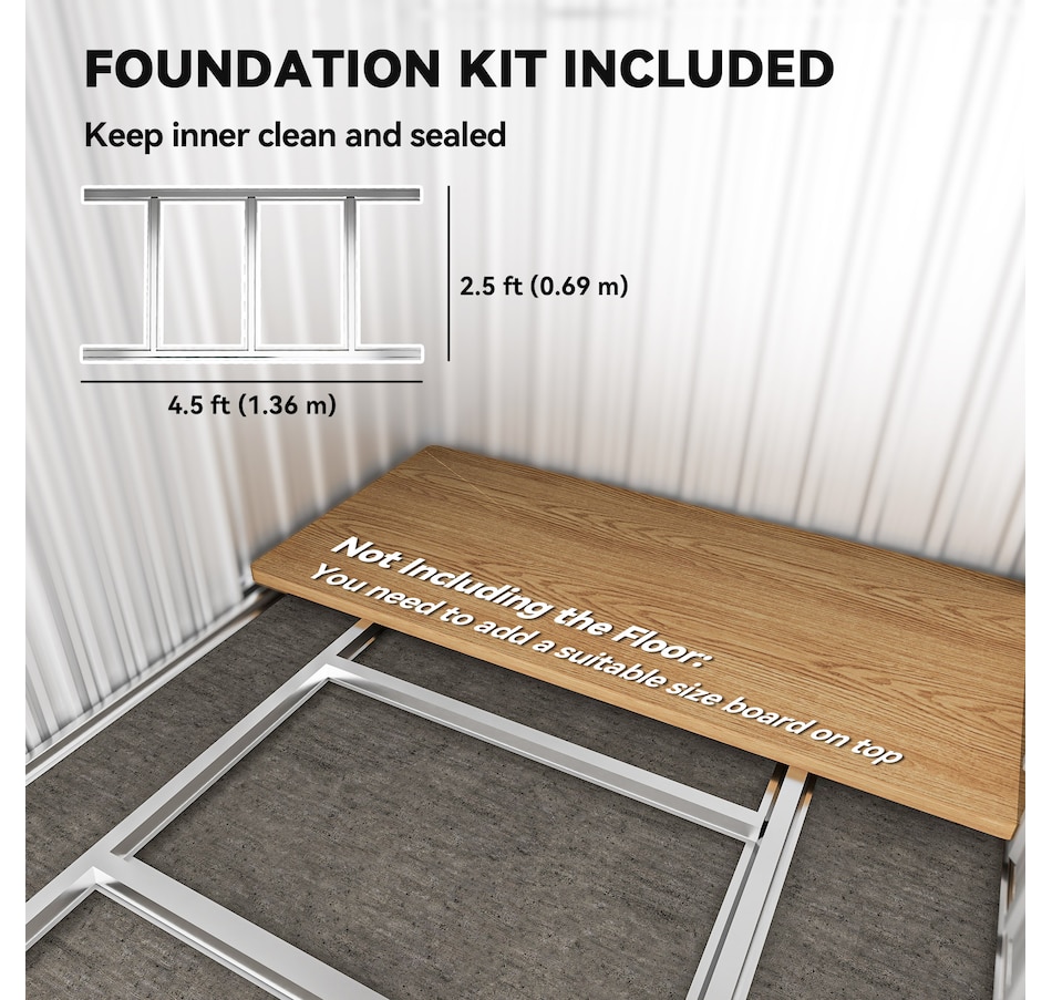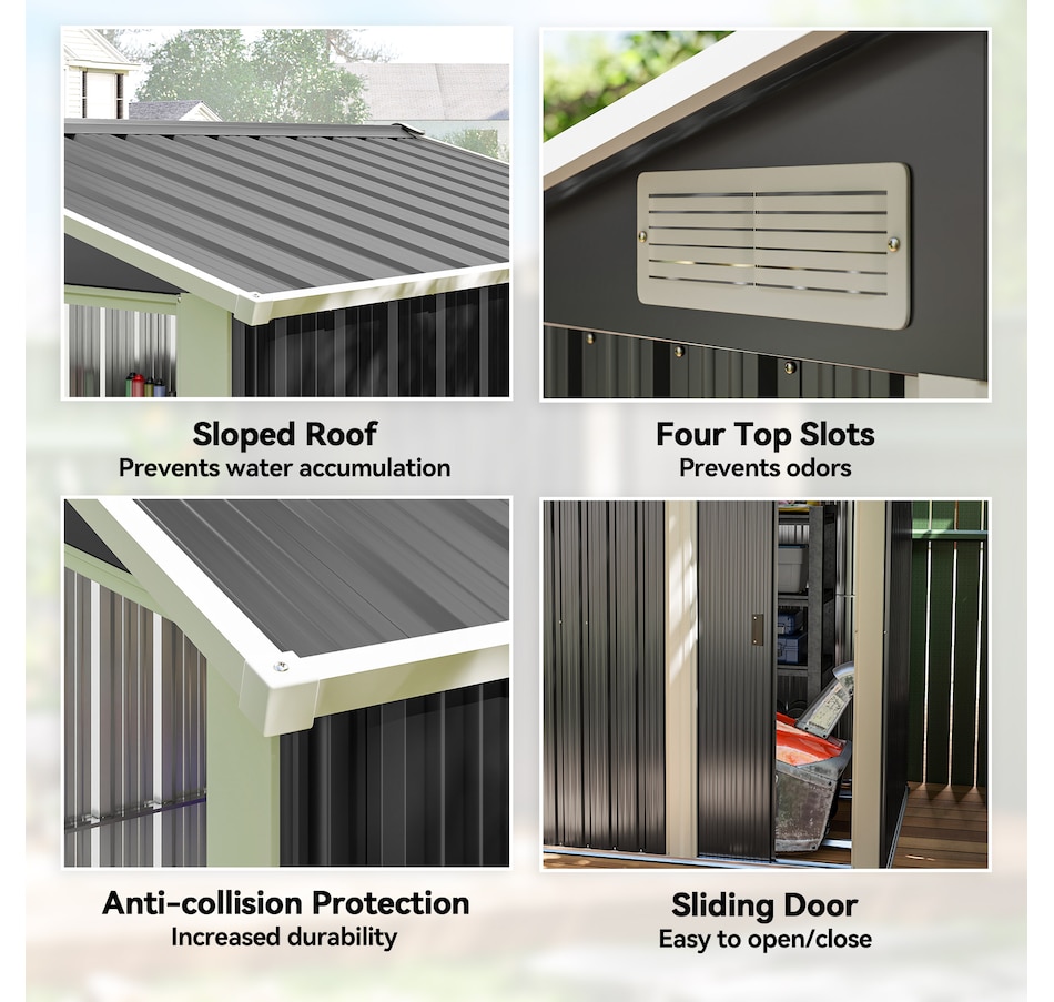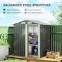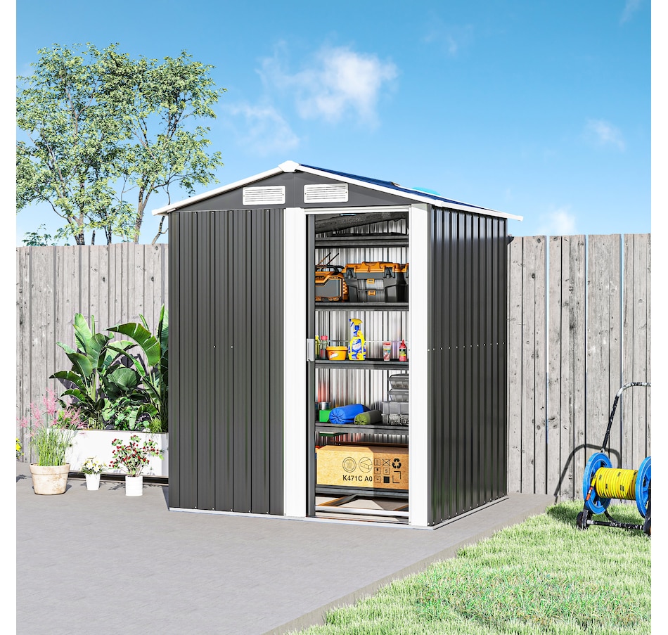 Essential outdoor shed with a sheltered roof to keep safe. This Outsunny shed is a must for every home. Made from steel, the shell is strong and tough, and it is built with a sliding door to open and access inside easily. The built-in ventilation slots allow air inside, keeping contents aerated and fresh. A sloping roof helps prevent rainwater and other liquids from building up, so nothing leaks inside. A foundation kit is included for the tool shed to stand level on the ground.