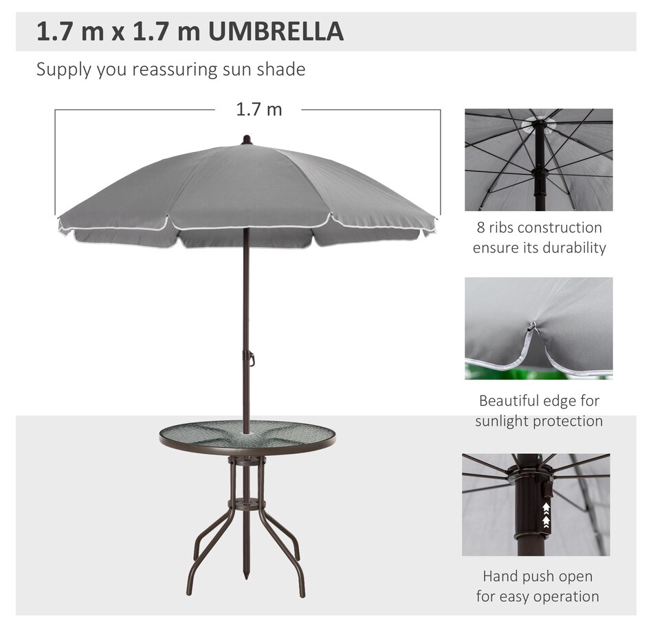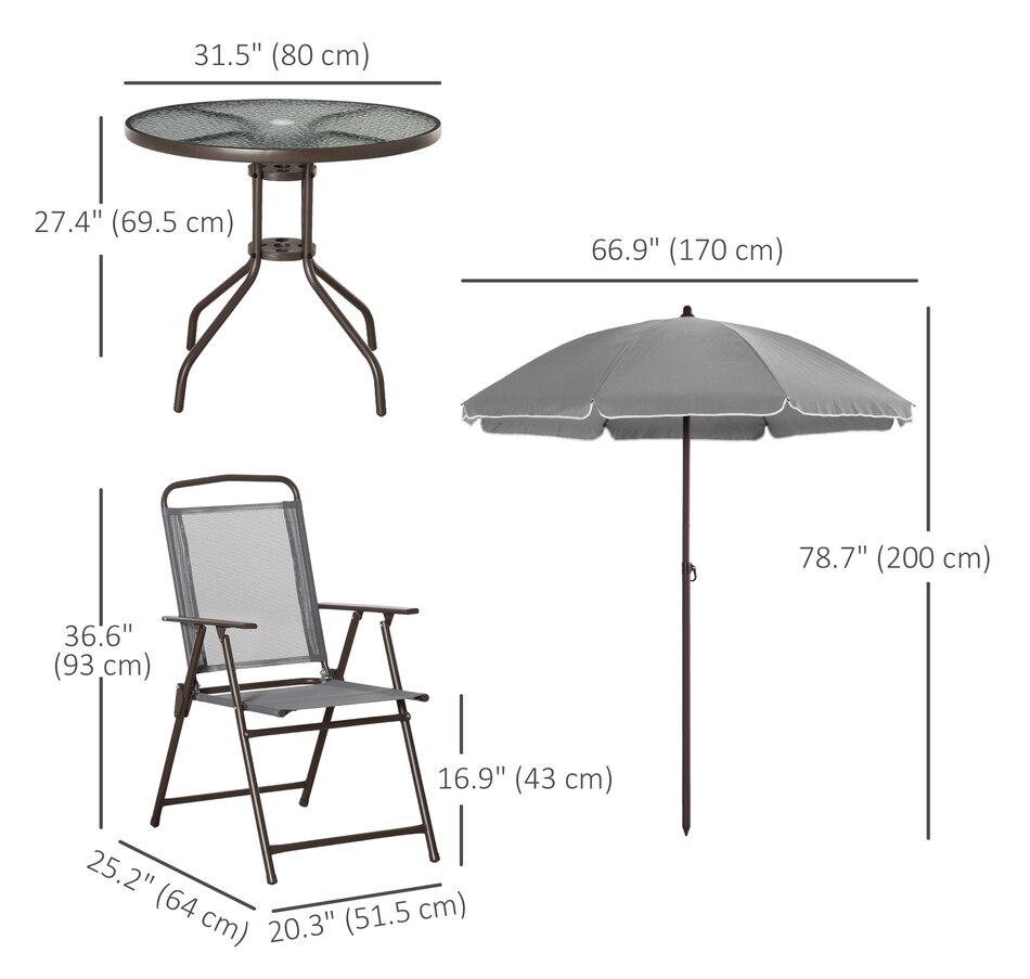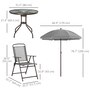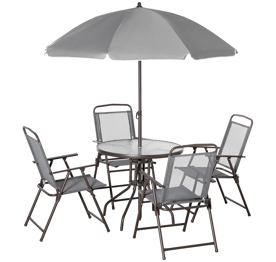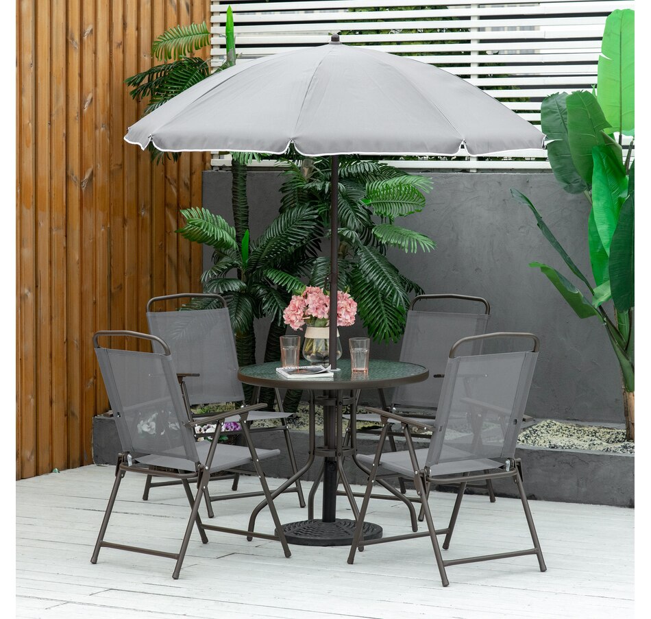 This patio dining set for 4 is perfect to complement your garden, patio or balcony. It is modern, stylish, lightweight and a great value for the money. The outdoor patio table and chairs with umbrella include 4 foldable and stackable chairs and a round glass-top table which features a hole for a parasol which also can be covered with the cap provided. Constructed on a metal frame, the all-weather texilene set is durable and can be kept outside all the year round.