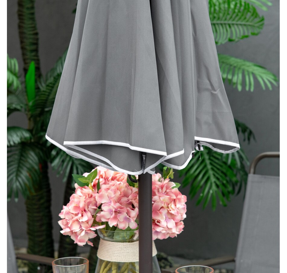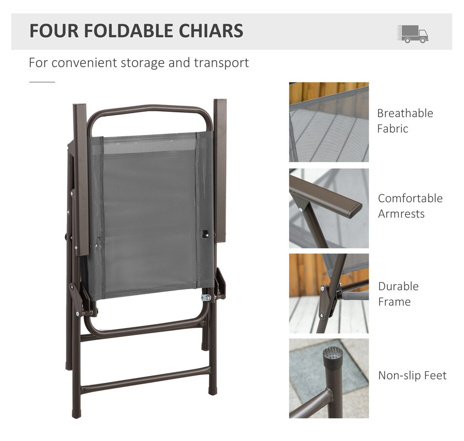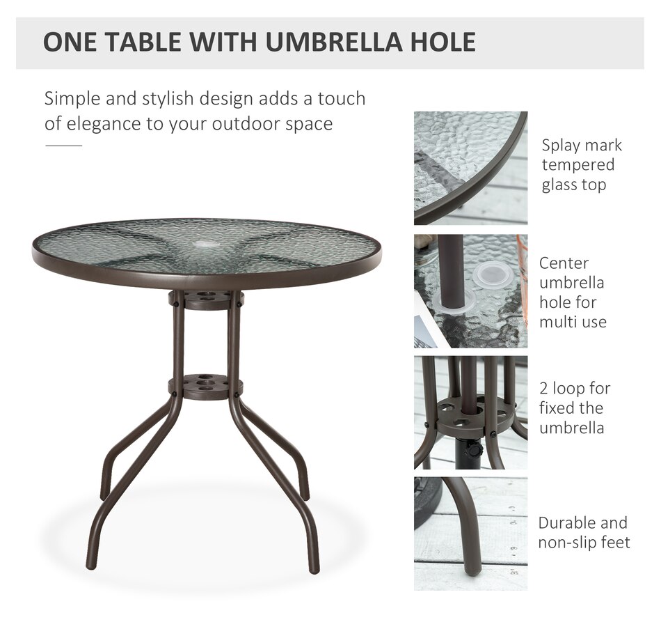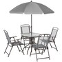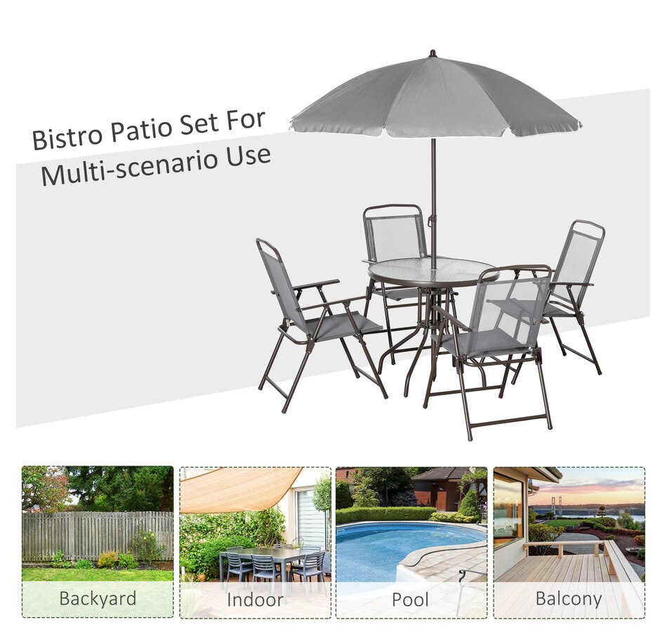 This patio dining set for 4 is perfect to complement your garden, patio or balcony. It is modern, stylish, lightweight and a great value for the money. The outdoor patio table and chairs with umbrella include 4 foldable and stackable chairs and a round glass-top table which features a hole for a parasol which also can be covered with the cap provided. Constructed on a metal frame, the all-weather texilene set is durable and can be kept outside all the year round.