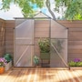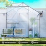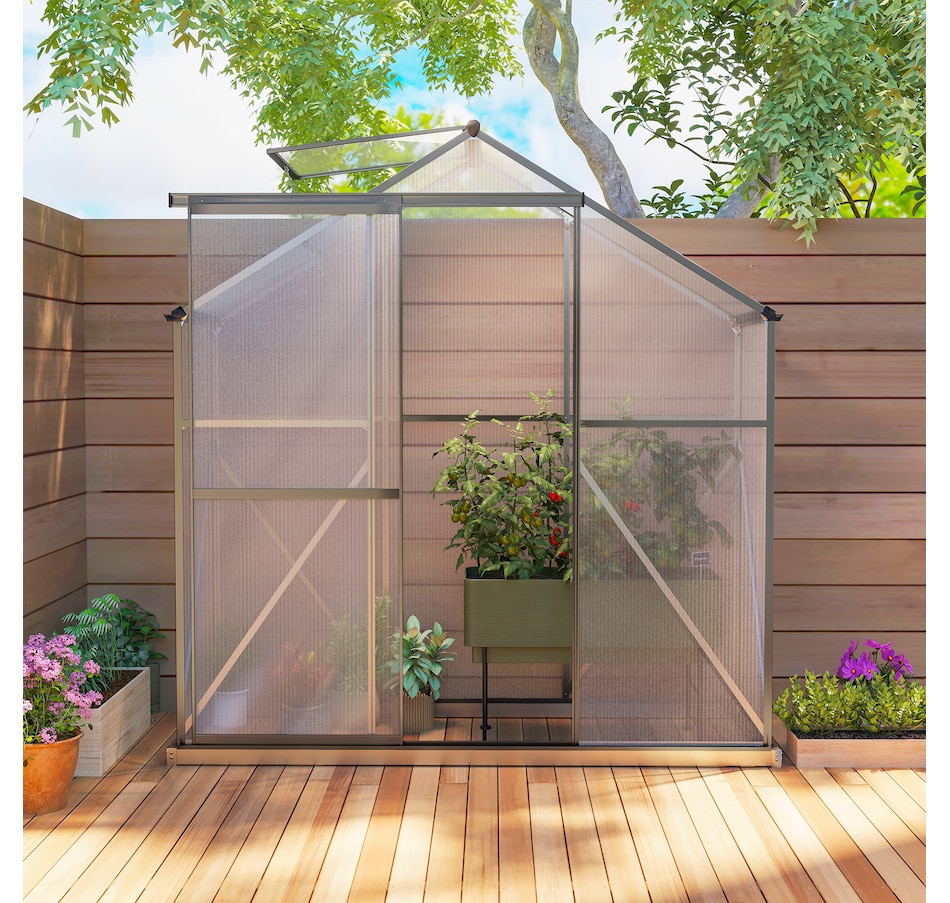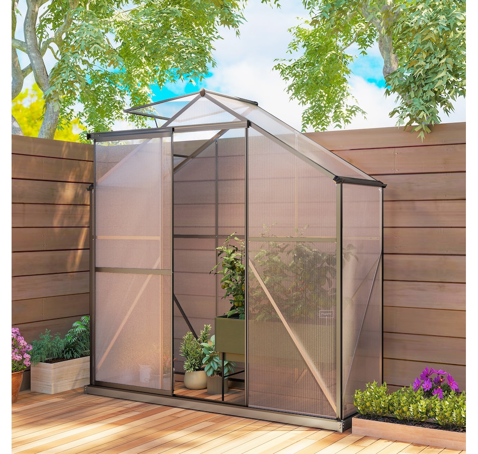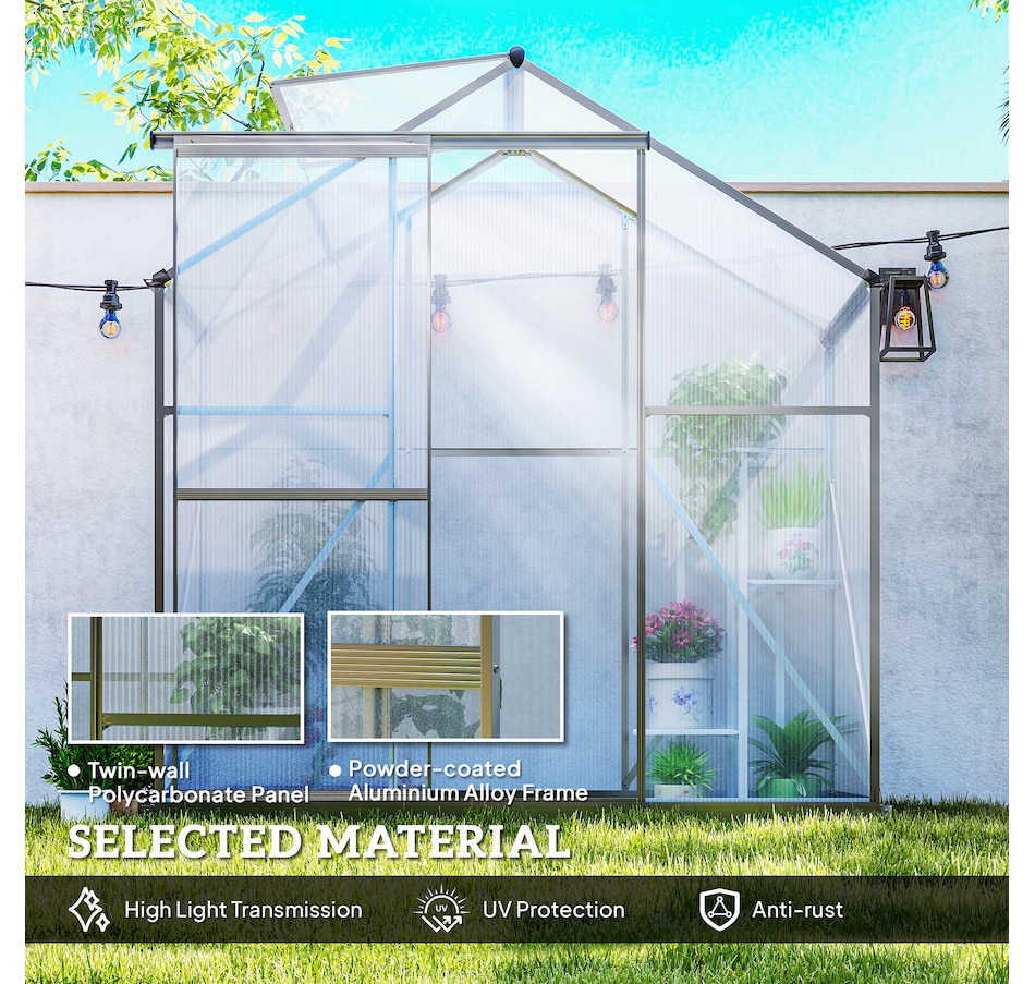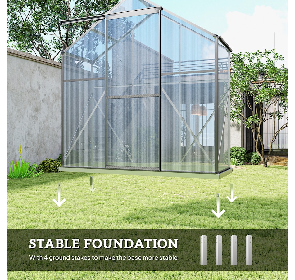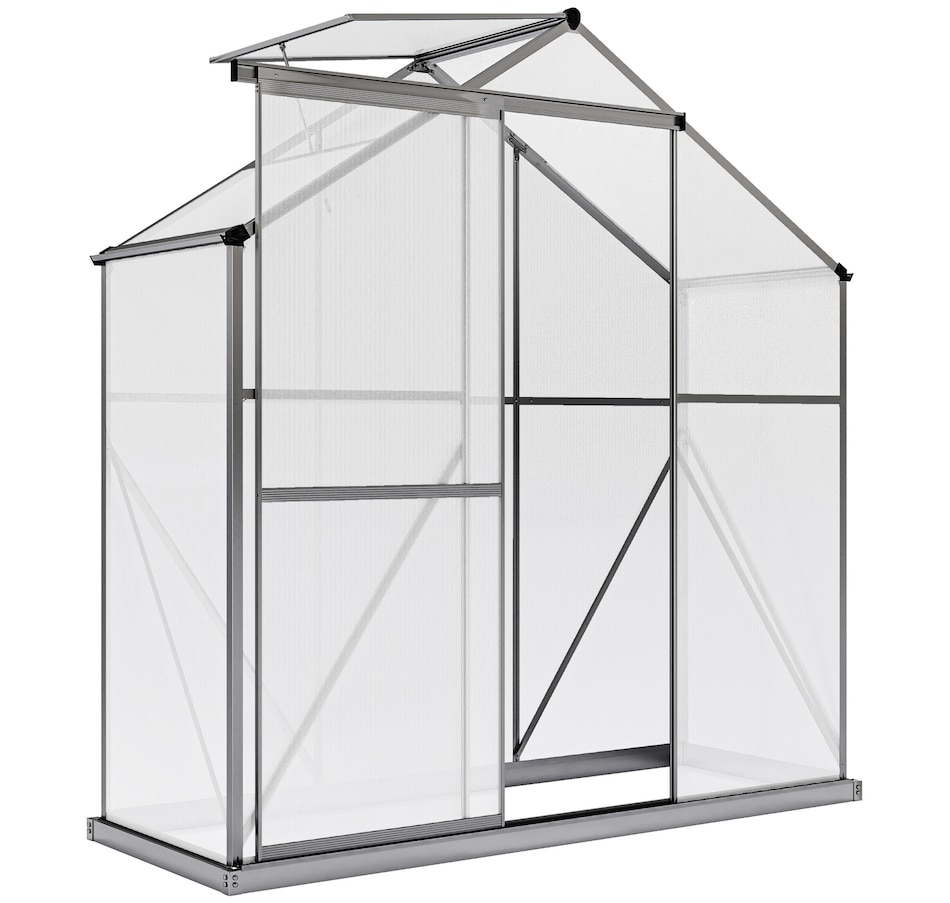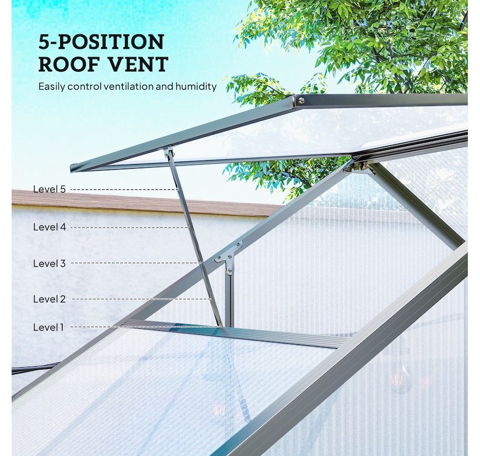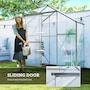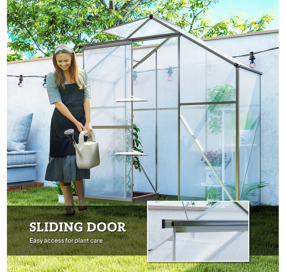 Experience the magic of greenhouse gardening with the Outsunny Polycarbonate Greenhouse, which provides optimal light transmission and insulation against harsh weather. The spacious interior and sturdy aluminium alloy frame accommodate plants of all sizes. An adjustable roof vent and a sliding door to control ventilation and humidity and for easy access. Invest in the Outsunny Polycarbonate Greenhouse and enjoy fruitful harvests in your own garden oasis.