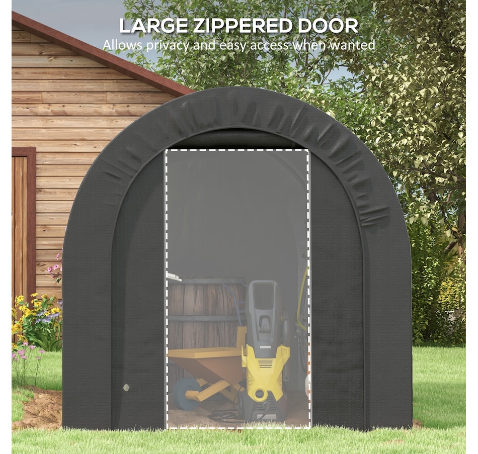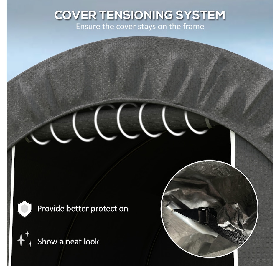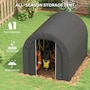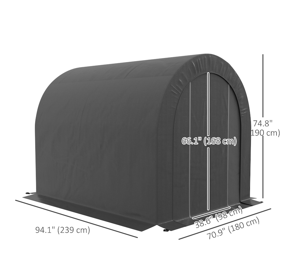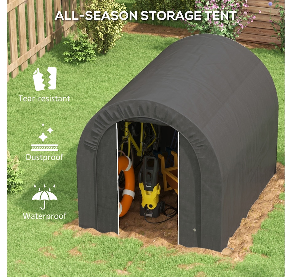 Offering a large amount of space with a level 5 windproof rating, the Outsunny tarp shed tent is a portable shelter to protect your motorcycle, garden tools, or other items outside. It has a thick PE tarp that can create a seal with the ground by burying its edges. The tarp holds on its frame with a ratchet tension system. Built with strong galvanized steel that mounts to the ground with stakes, our motorcycle shed provides outdoor protection at a moment's notice.Features: