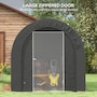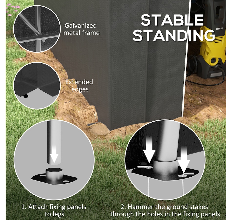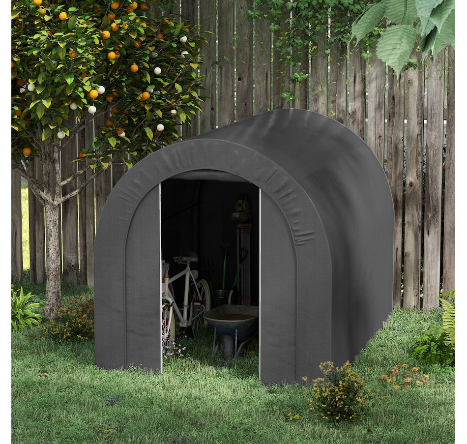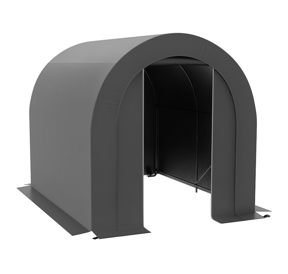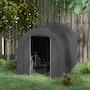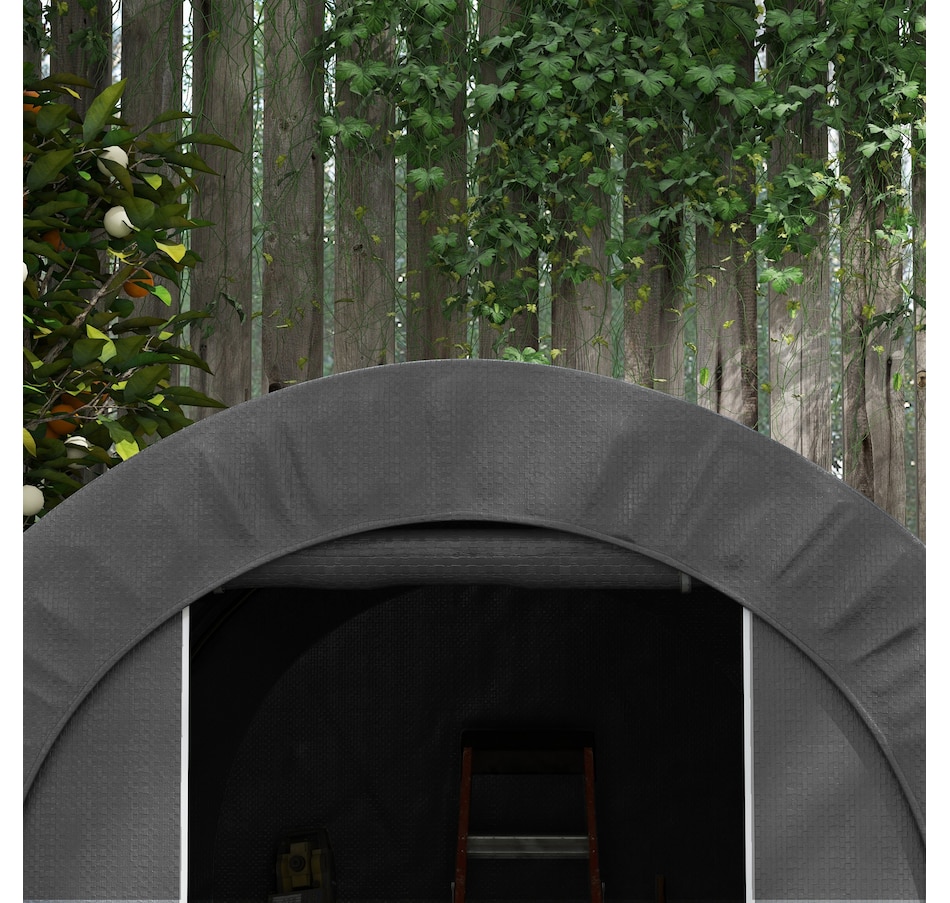 Offering a large amount of space with a level 5 windproof rating, the Outsunny tarp shed tent is a portable shelter to protect your motorcycle, garden tools, or other items outside. It has a thick PE tarp that can create a seal with the ground by burying its edges. The tarp holds on its frame with a ratchet tension system. Built with strong galvanized steel that mounts to the ground with stakes, our motorcycle shed provides outdoor protection at a moment's notice.Features: