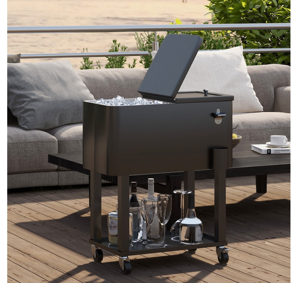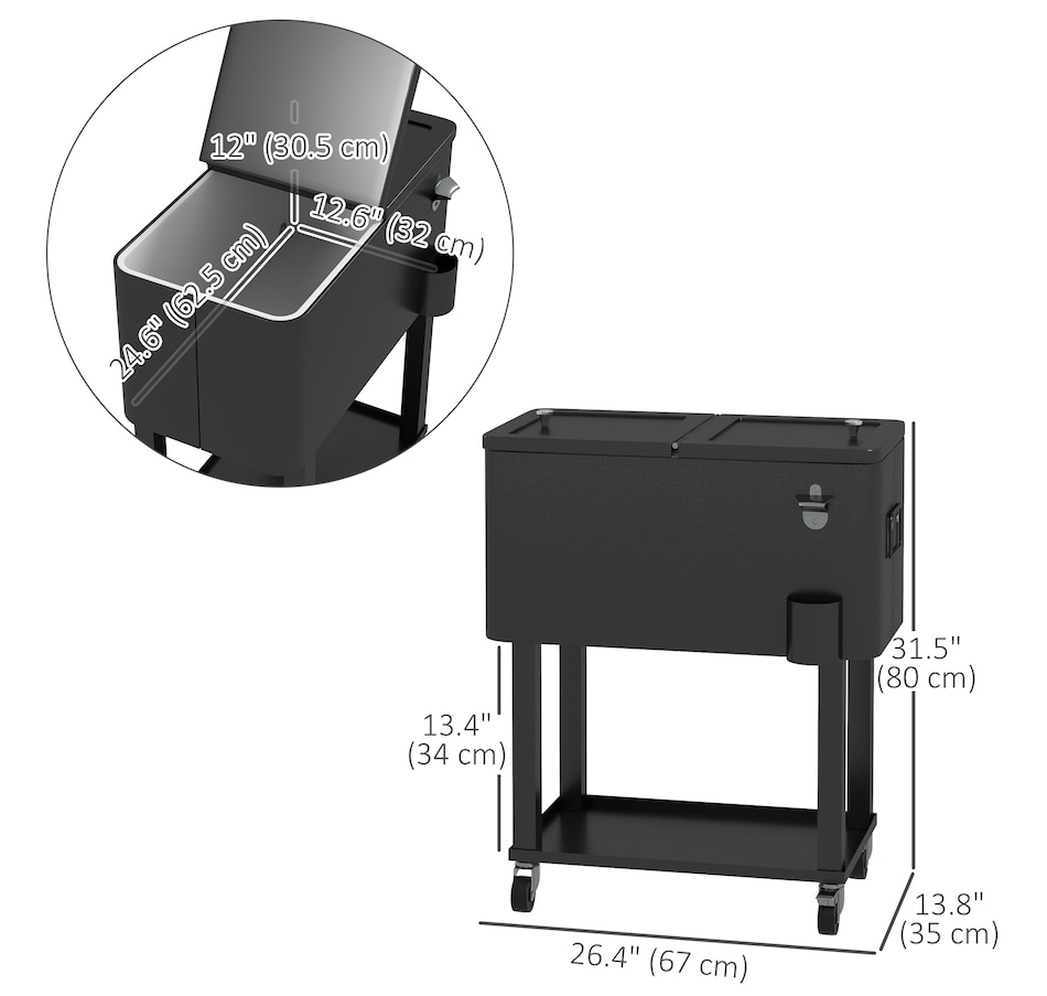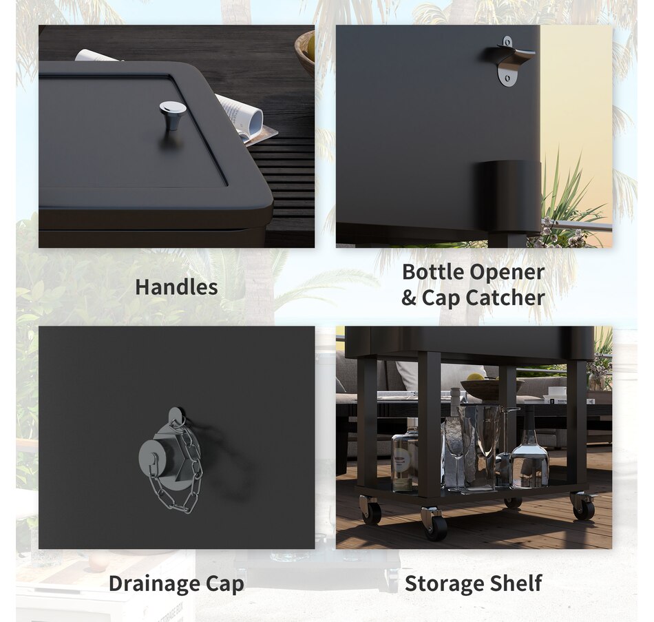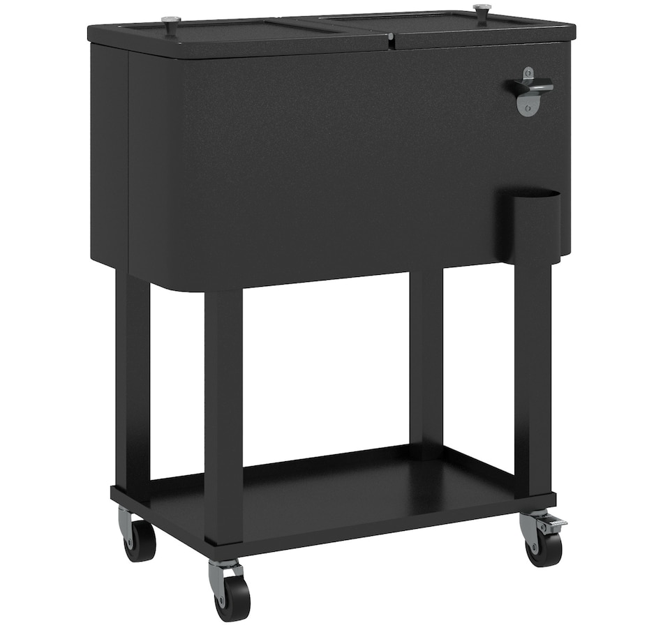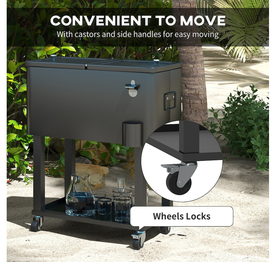 Get ready for summer with the Outsunny cooler cart. Featuring a 60qt (56L) capacity and a weather-resistant shell, it ensures your beverages stay chilled longer. Simply add ice or freeze packs (not included) to maintain a great drink temperature. This beverage cooler with wheels is crucial for keeping beverages cool and accessible.