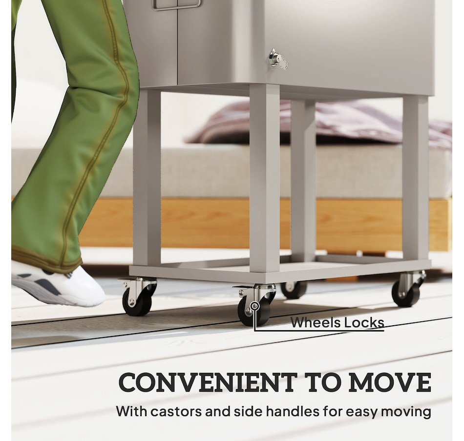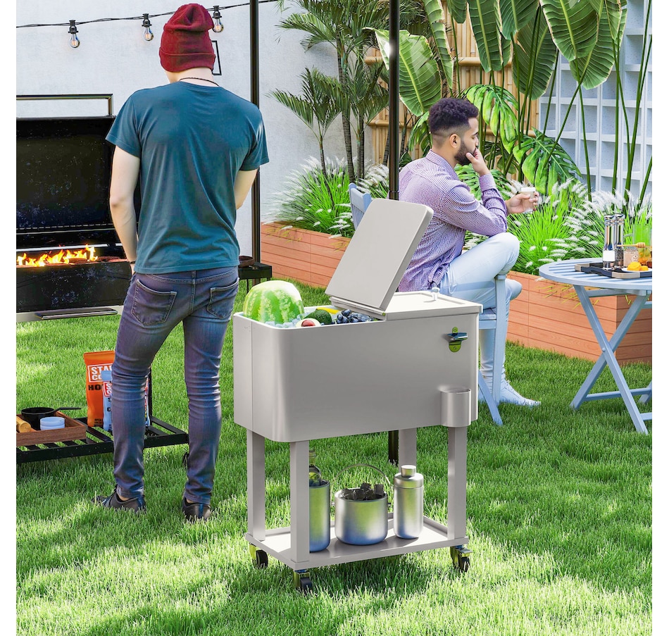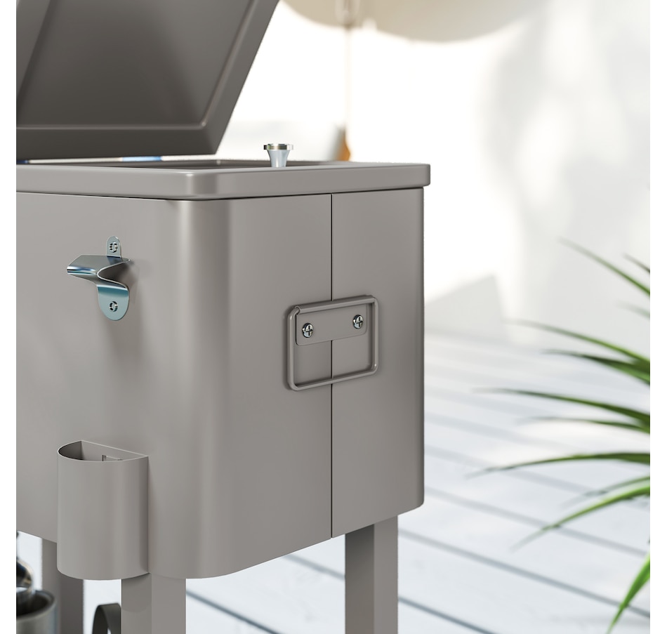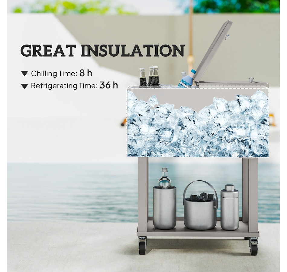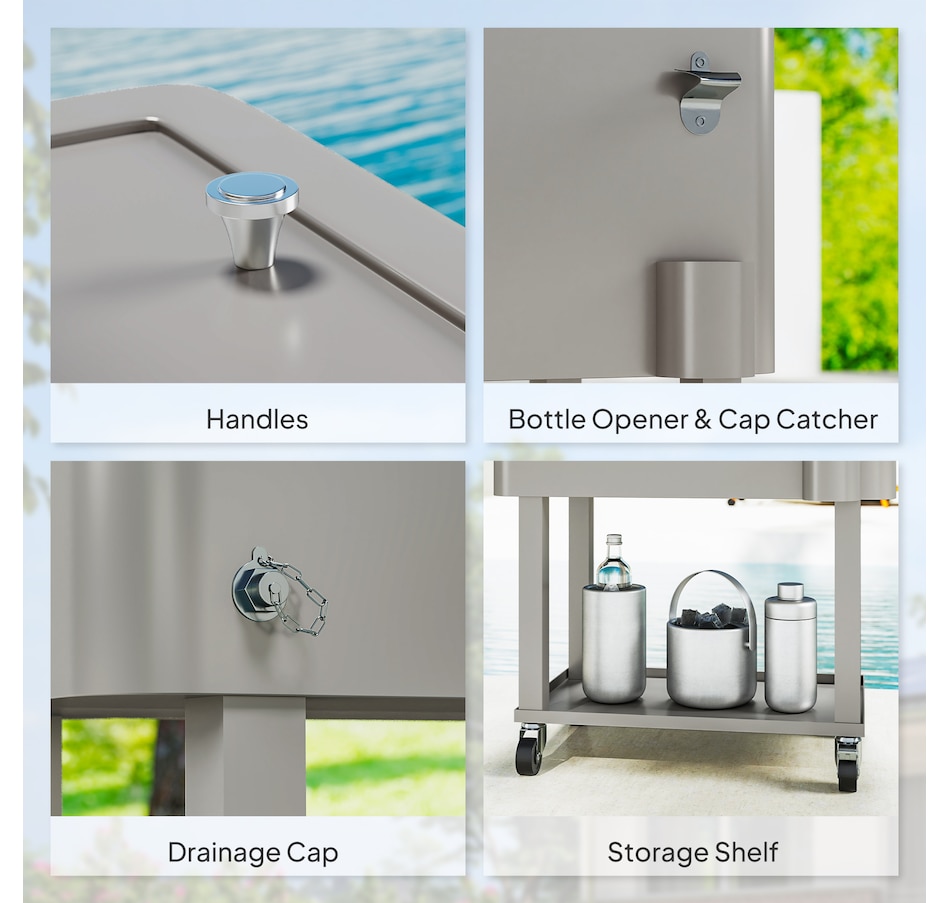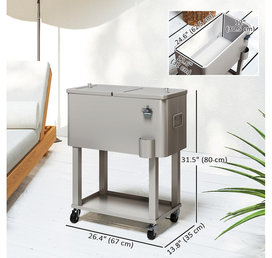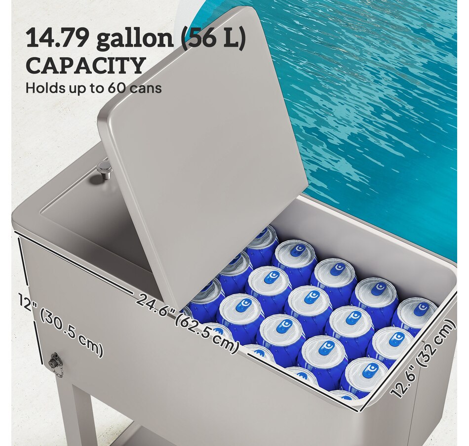 Get ready for summer with the Outsunny cooler cart. Featuring a 60qt (56L) capacity and a weather-resistant shell, it ensures your beverages stay chilled longer. Simply add ice or freeze packs (not included) to maintain a great drink temperature. This beverage cooler with wheels is crucial for keeping beverages cool and accessible.