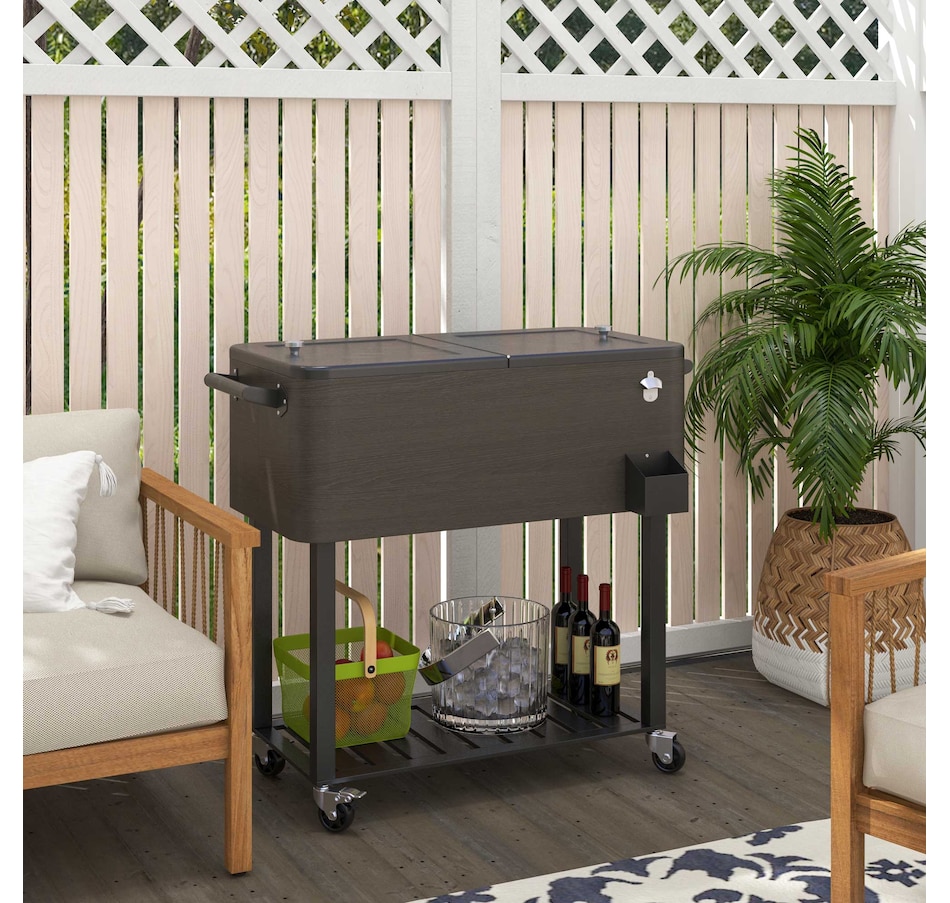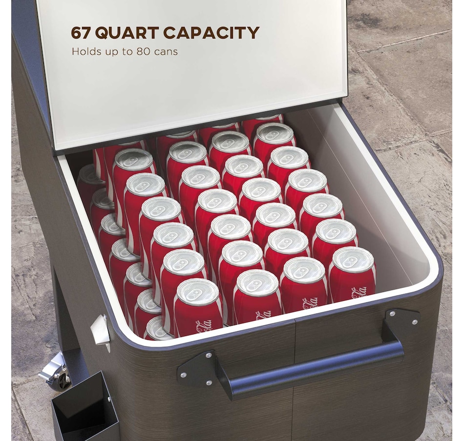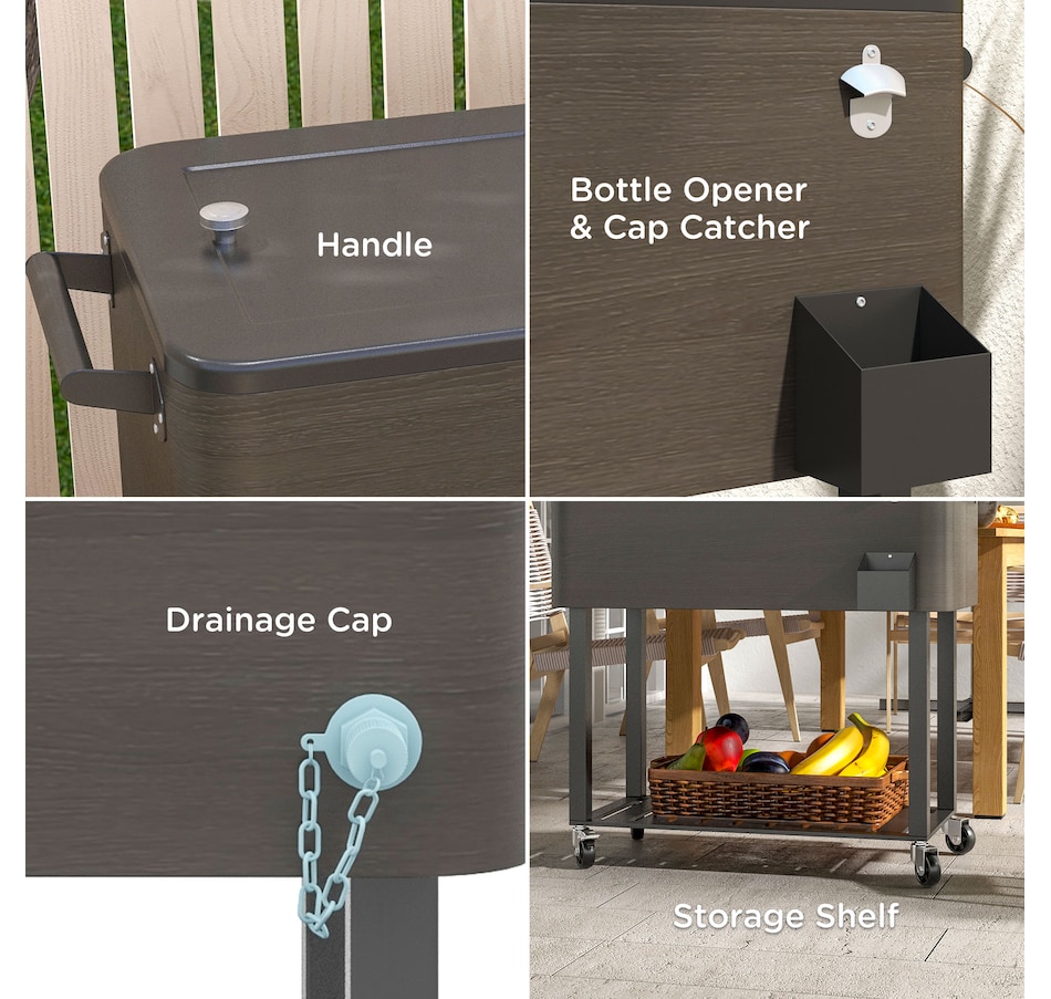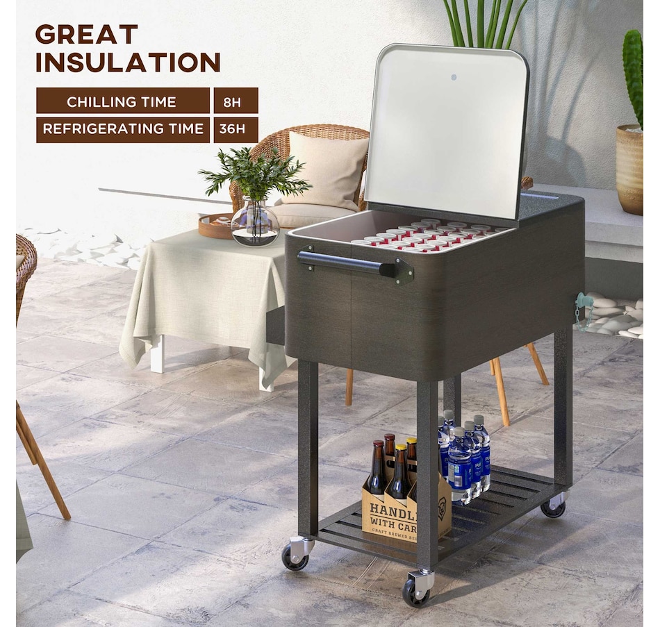 Bring the party with you wherever you go with our cooler cart from Outsunny. With a large volume of 67qt, a weather resistant outer shell, and an inner box for insulation, this standing cooler keeps your beverages cool for longer periods. Whether you're hosting a backyard BBQ or enjoying a picnic, this ice chest with wheels is a must have to keep your refreshments chilled and easily accessible. Elevate your outdoor entertaining with the Outsunny outdoor cooler.