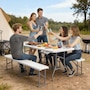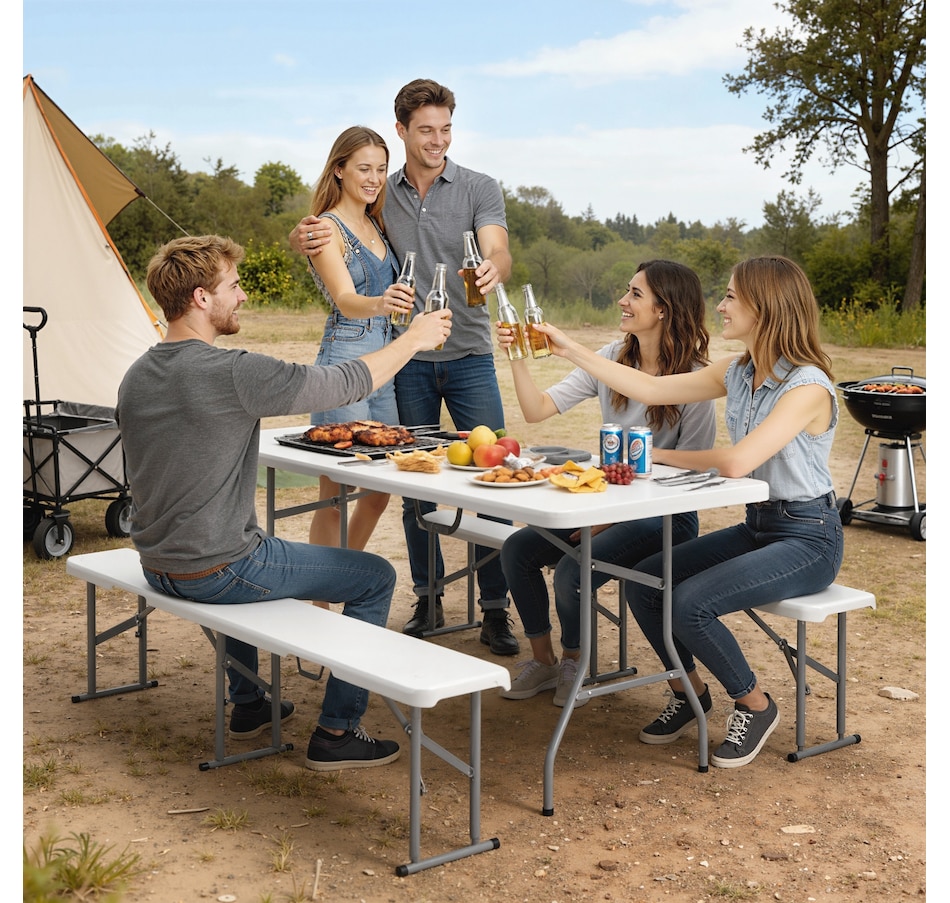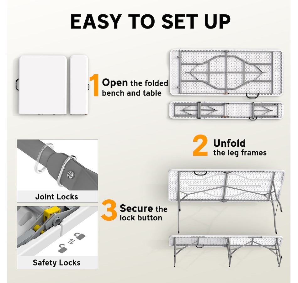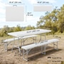 Discover the great outdoors with the Outsunny Portable Picnic Table Set! This three-piece set includes a spacious outdoor picnic table and two benches, great for family picnics or festival outings. Crafted with a waterproof HDPE benchtop and a corrosion-resistant metal frame, it ensures safety with joint locks and non-slip pads. Easily portable, this camping furniture unfolds adventure wherever you go!