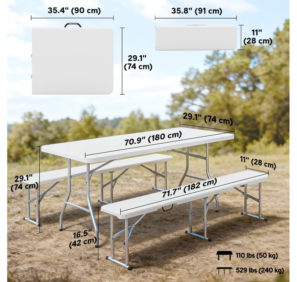 6FT 3-Piece Folding Picnic Table with 2 Benches, White