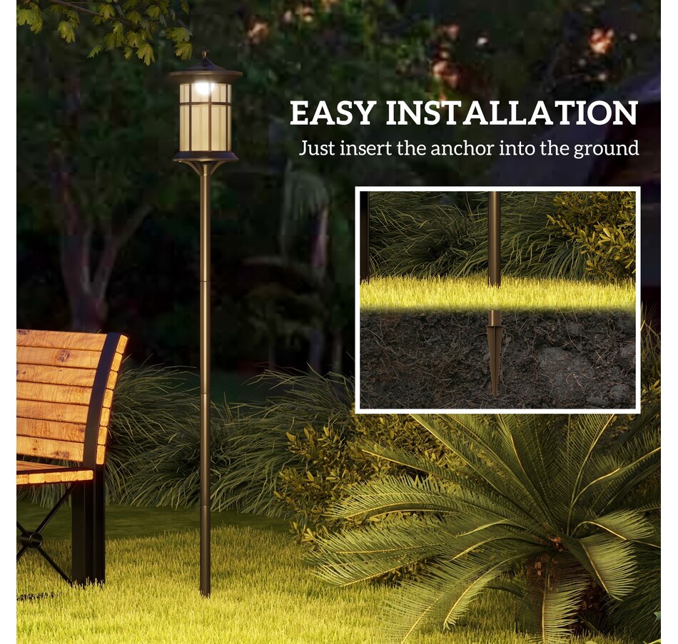 Bask in the glow of Outsunny's solar post light, designed to charge under normal sunlight for 8 hours and illuminate your outdoors for 6 hours. As day turns to night, it automatically lights up your space and fades with the dawn, ensuring seamless transition. Weatherproof with an IP44 rating, this solar street lamp stands tall in any condition, effortlessly anchoring into the soil.Features: