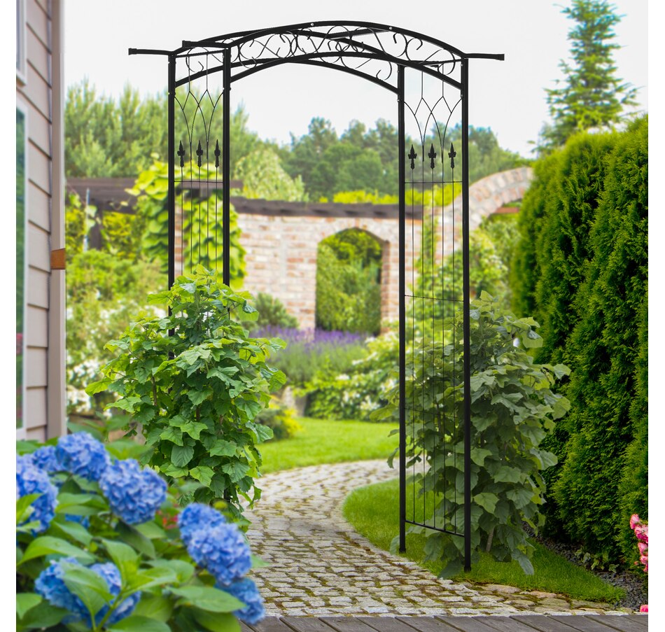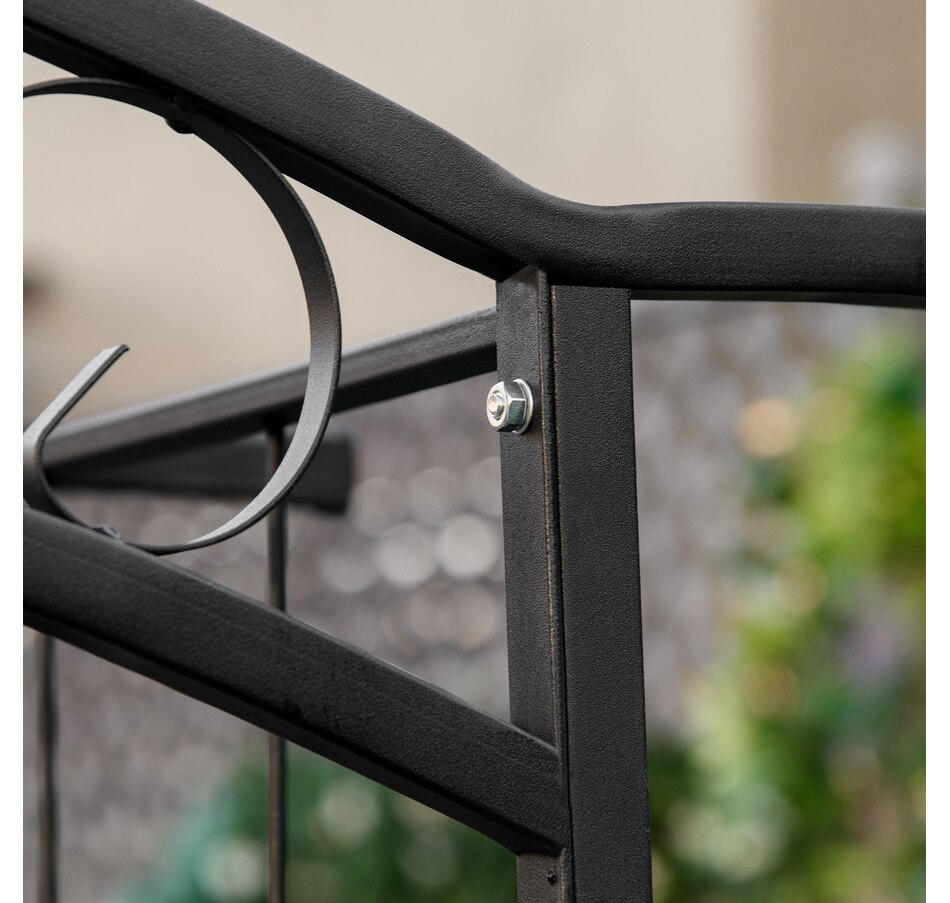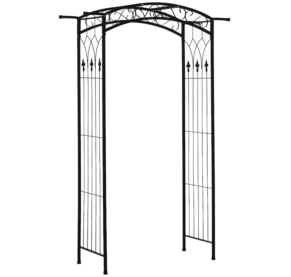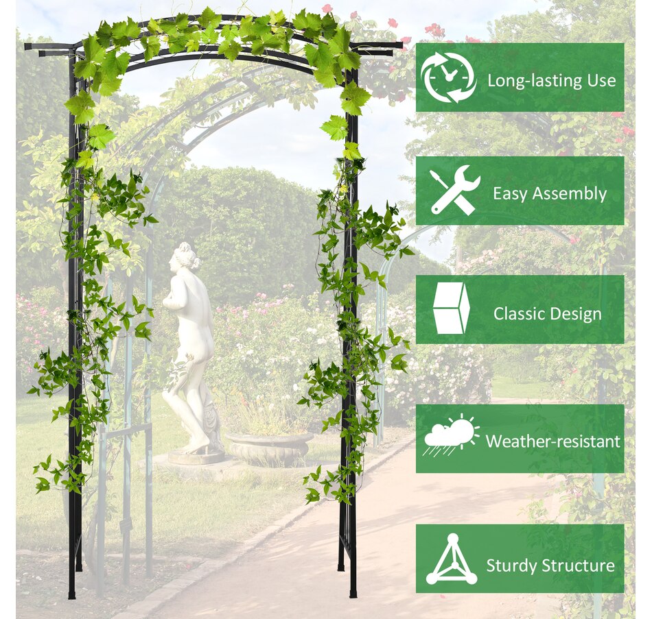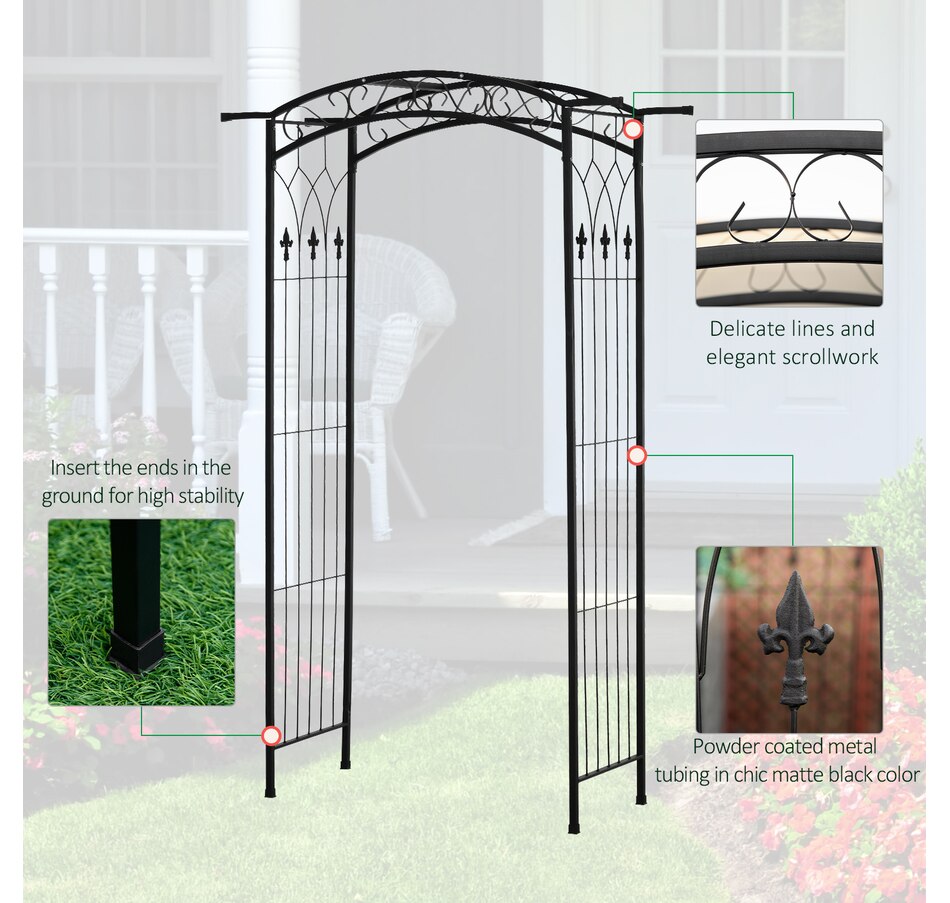 Bring a little southern charm to your garden with scrollwork from Outsunny! Constructed of a powder-coated matte black metal frame, this metal arbor will easily blend into your beautiful garden. The top horizontal bars provide structural support as well as an ideal place to hang lightweight potted plants. The entry arbor is perfect for supporting lightweight climbing plants and vines. Display small hanging accents on this garden archway in order to create a beautiful entry into your garden.