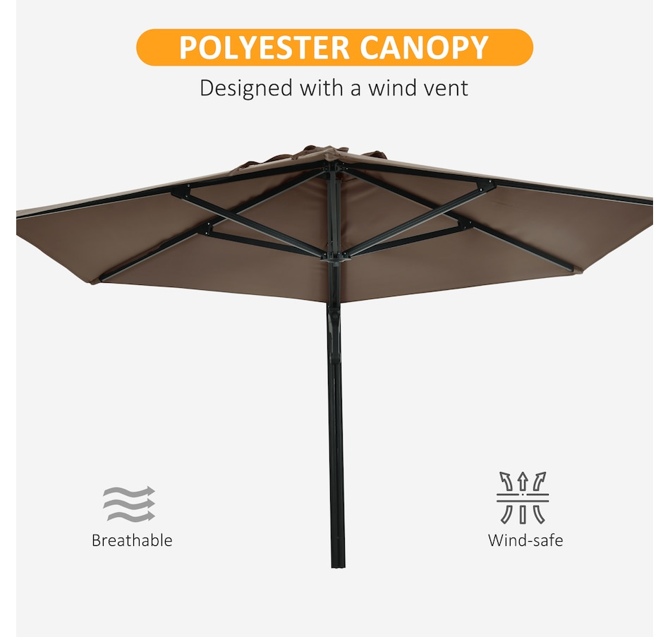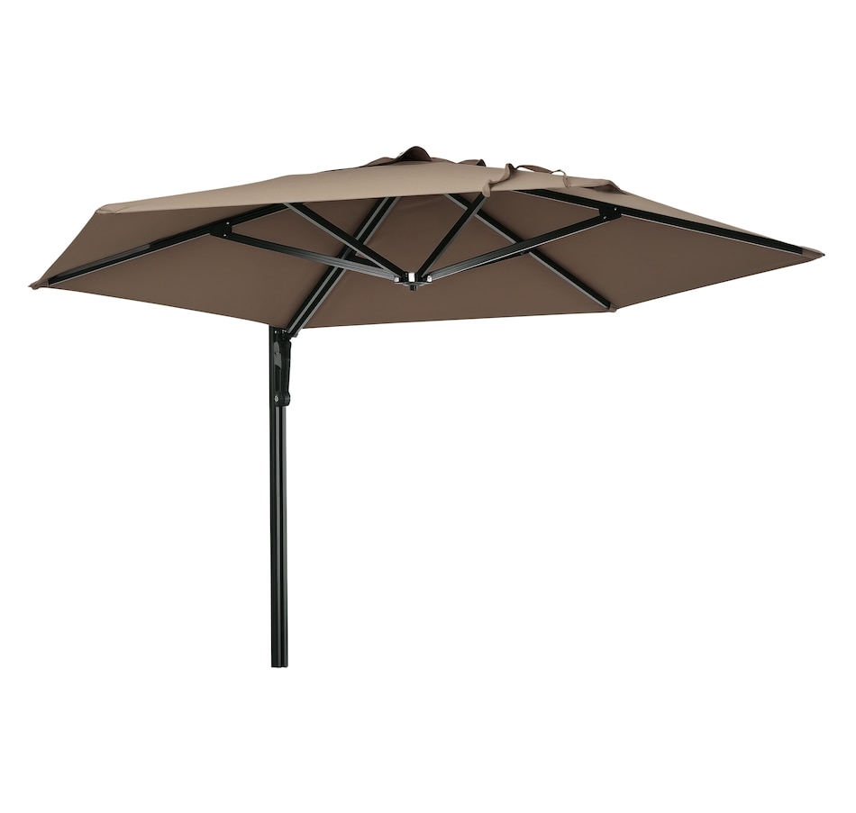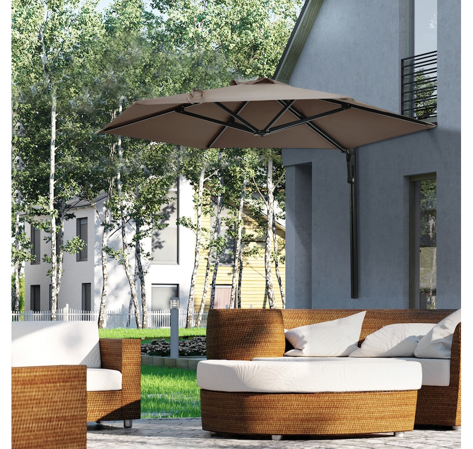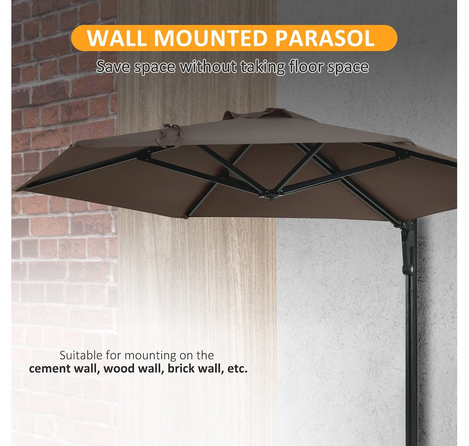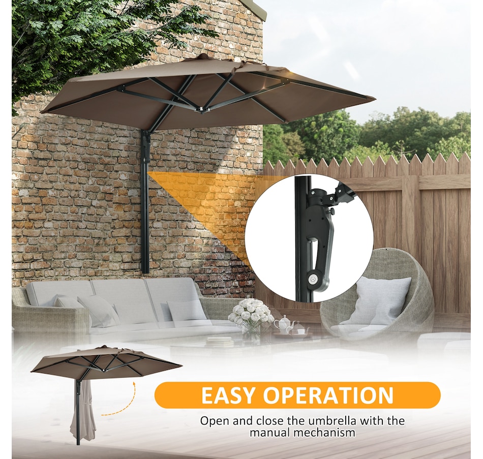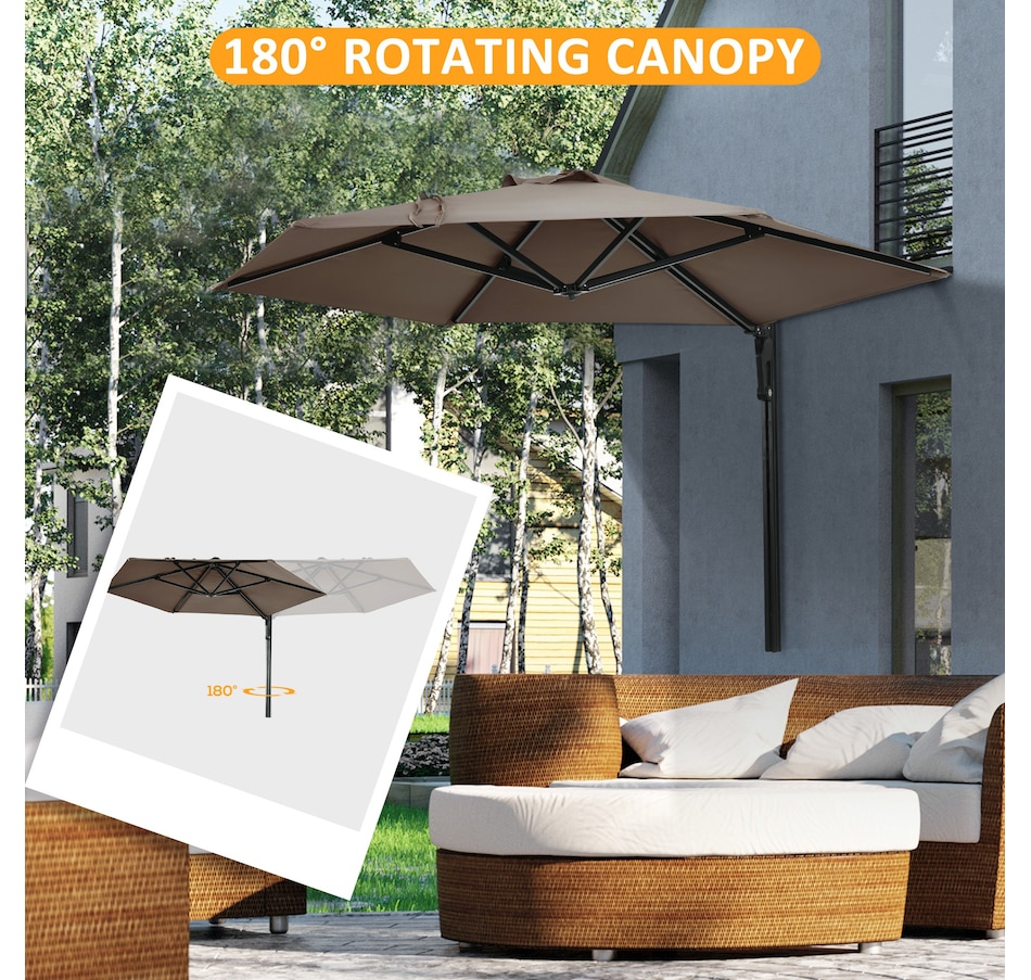Like to read in the great outdoors? Enjoy picnics out in the summer breeze? Say goodbye to sunburns this summer with Outsunny garden umbrella. Wall-mounted design makes it save space without sacrificing shade protection. Our patio umbrella controlled with its 180° rotating canopy offers ample shade at a position you like. Made of polyester fabric and aluminum frame for outdoor-ready. Take the wall umbrella home, and it will provide soothing shade for you throughout the summer.