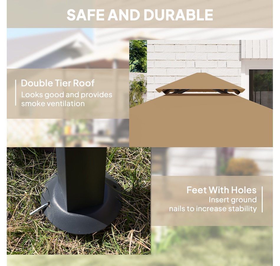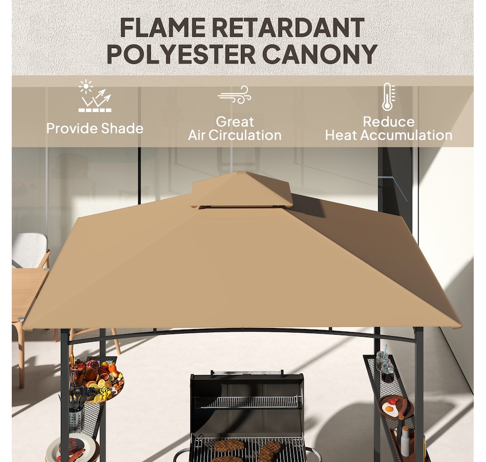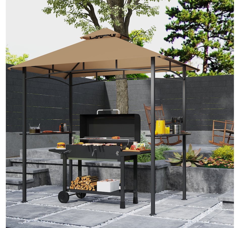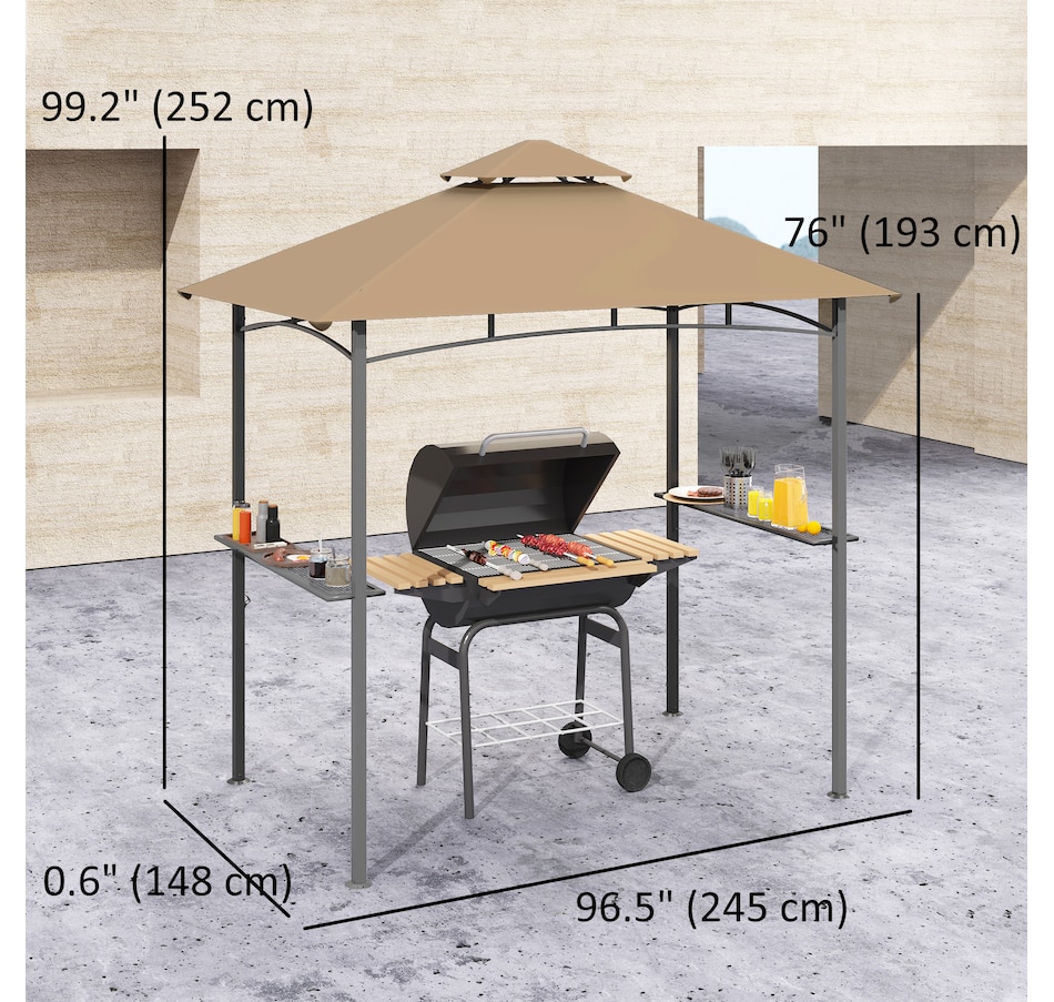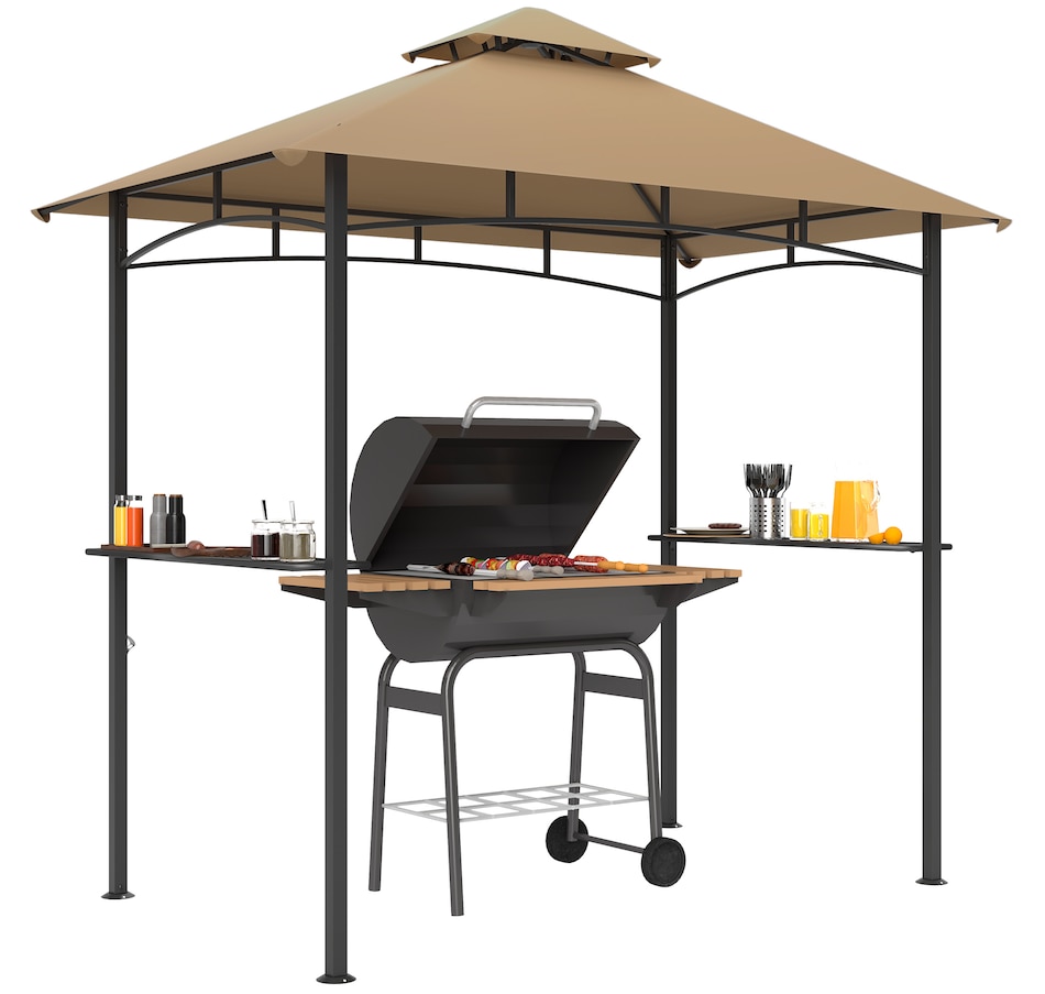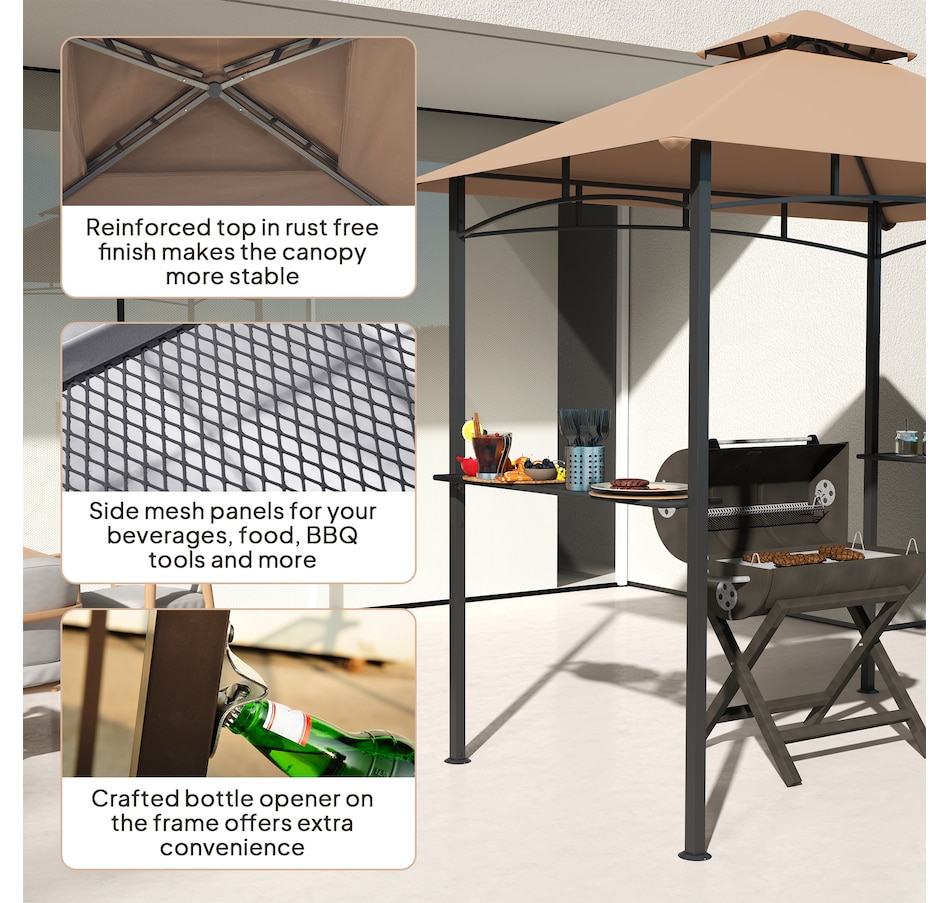 Protect your grill from the weather with this Outsunny curved grill shelter. The powder-coated steel frame is built to be sturdy, and the polyester fabric on the grill canopy resists fading and flames. The outdoor grill gazebo includes a bottle opener on the upright and 2 sides of iron counters provide plenty of space. Make it convenient to grill in virtually any kind of weather with this Outsunny grill tent.