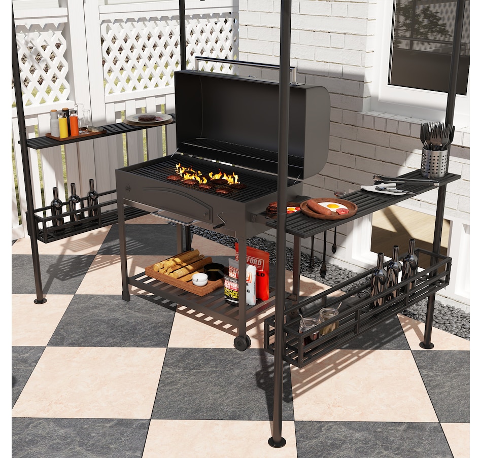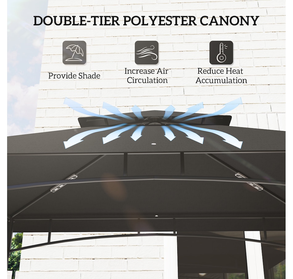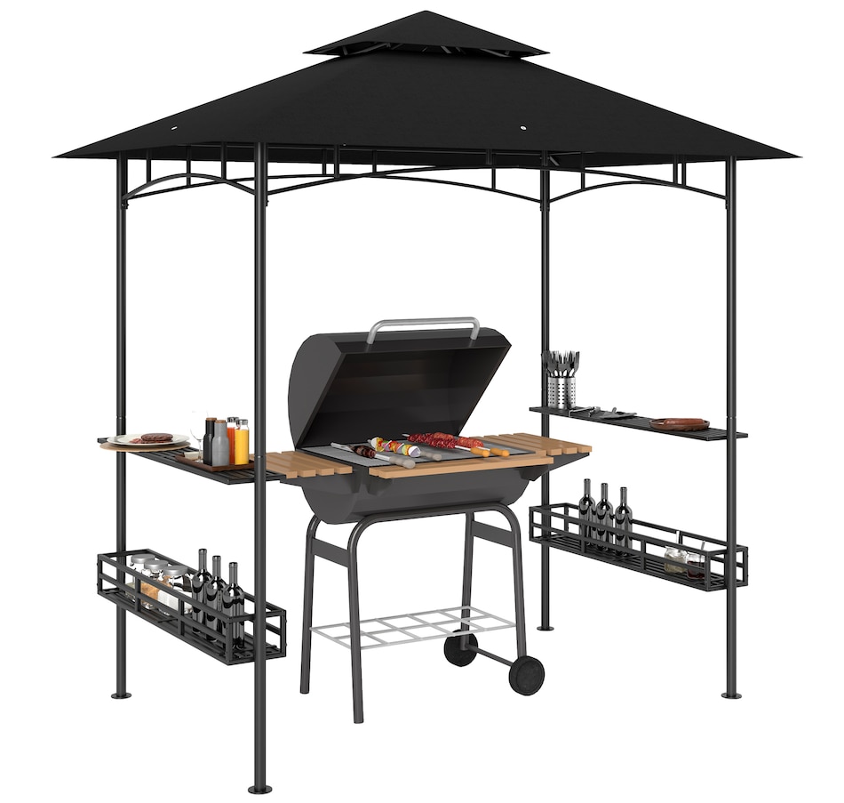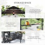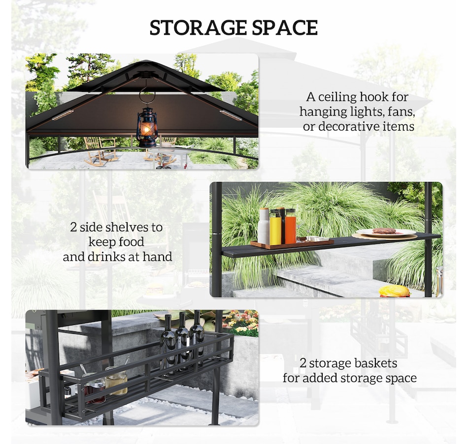Take your grilling to the next level with the Outsunny 2-Tier BBQ Gazebo! Featuring excellent airflow to keep smoke away, this shelter also protects you from the sun and light rain. The flame-retardant and splash-resistant canopy ensures a safe cooking area, while convenient hook, shelves and storage baskets keep your essentials organized. Built with a strong, rust-resistant frame, this barbecue gazebo is a great addition to any outdoor kitchen.
