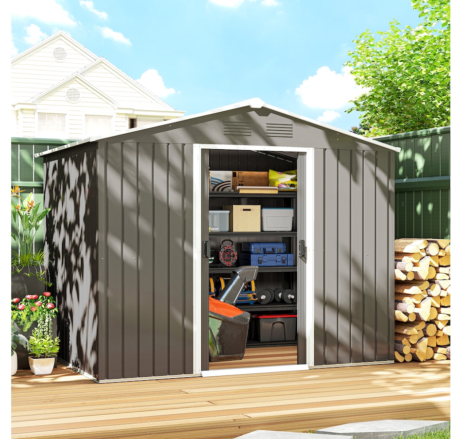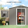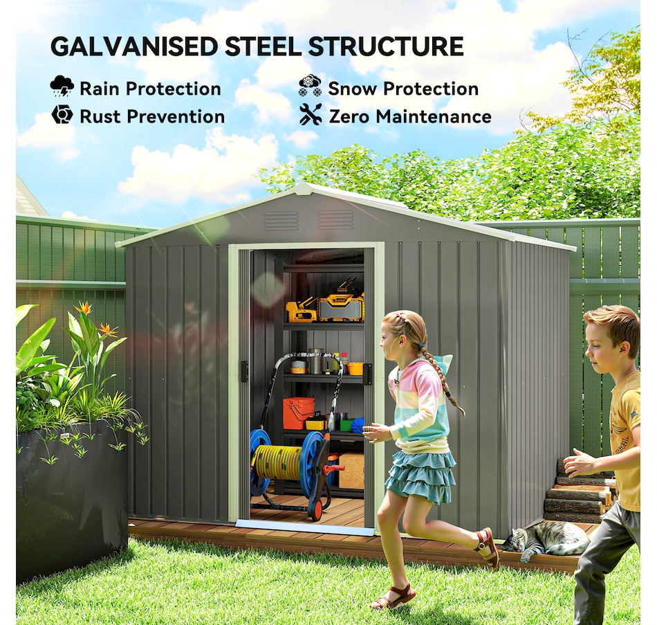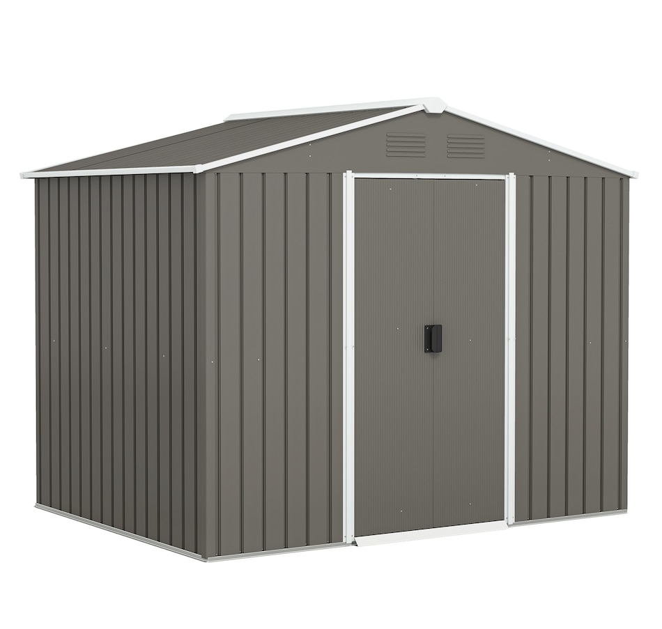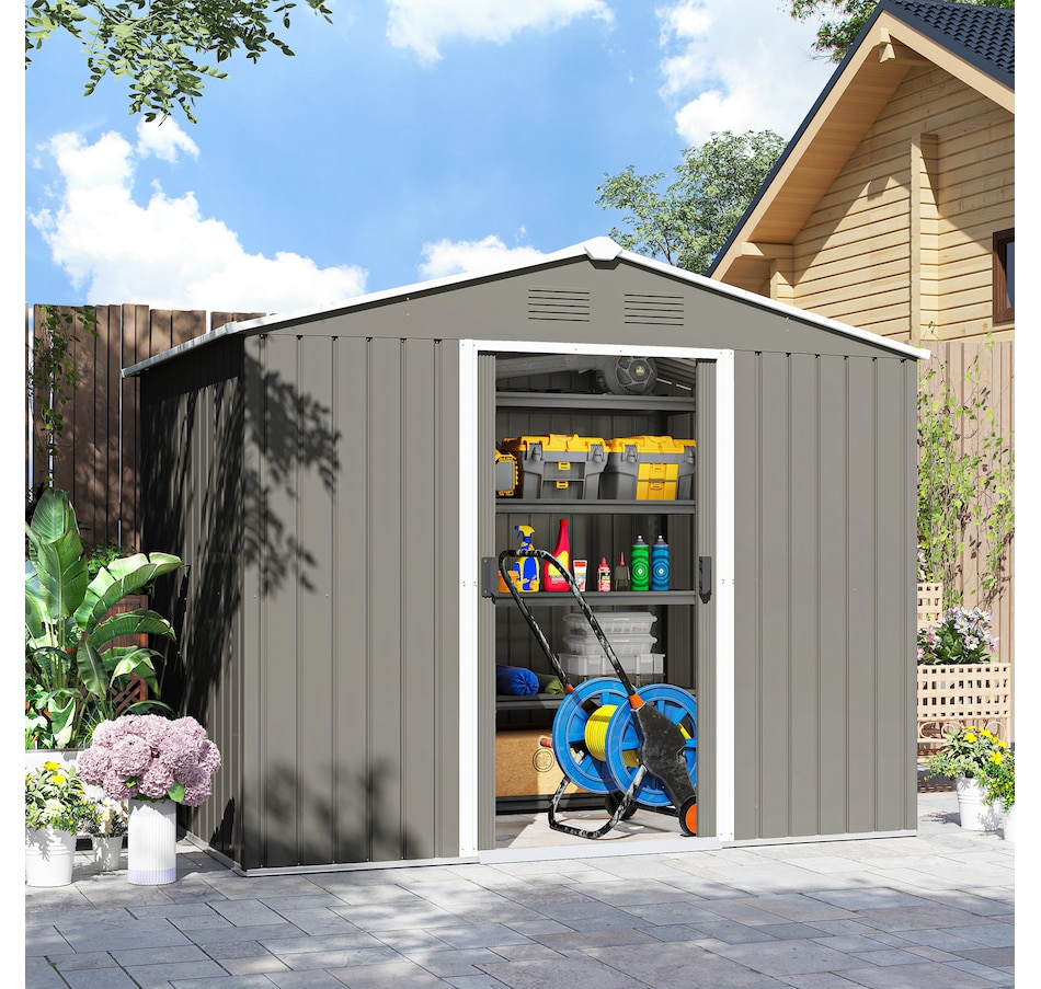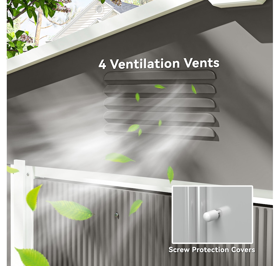Outsunny's tool shed is your go-to for storing and safeguarding tools, garden gear, and outerwear. Crafted from durable, corrosion-resistant galvanized steel, this shed ensures longevity. Its sloping roof prevents rainwater buildup, protecting your mobility scooter shed from damage. The double sliding doors offer effortless access, while four ventilation slots keep the interior fresh and aerated in this metal garden shed.Features: