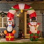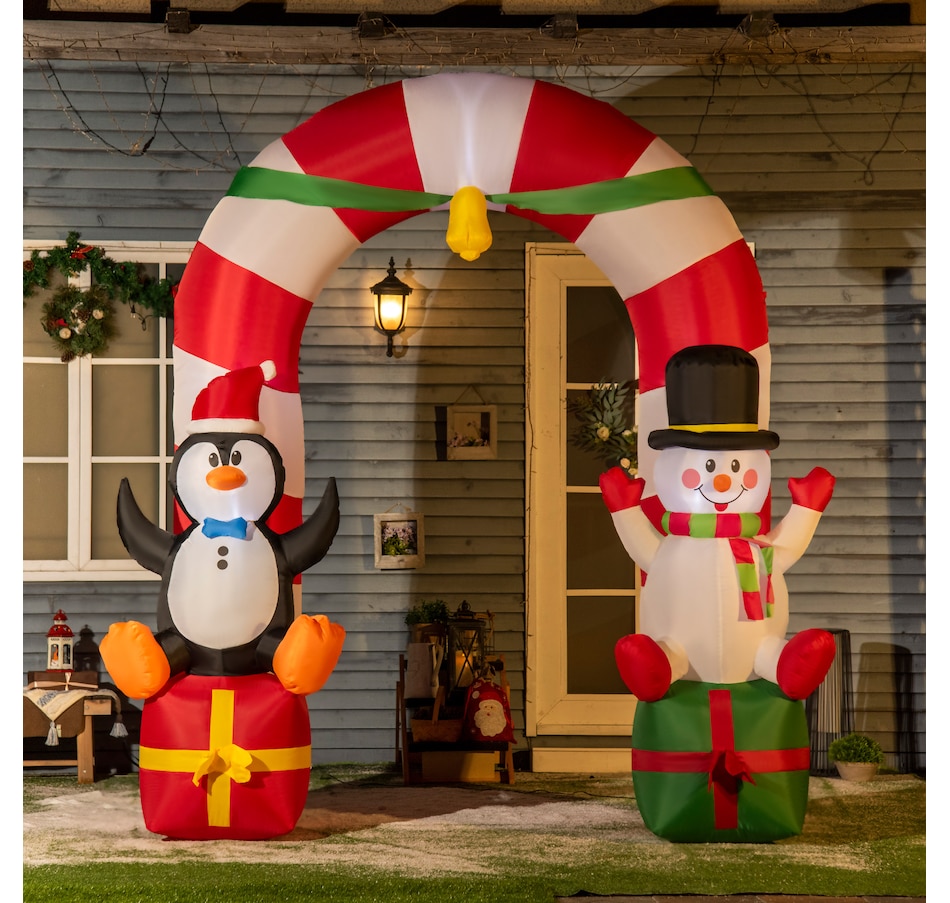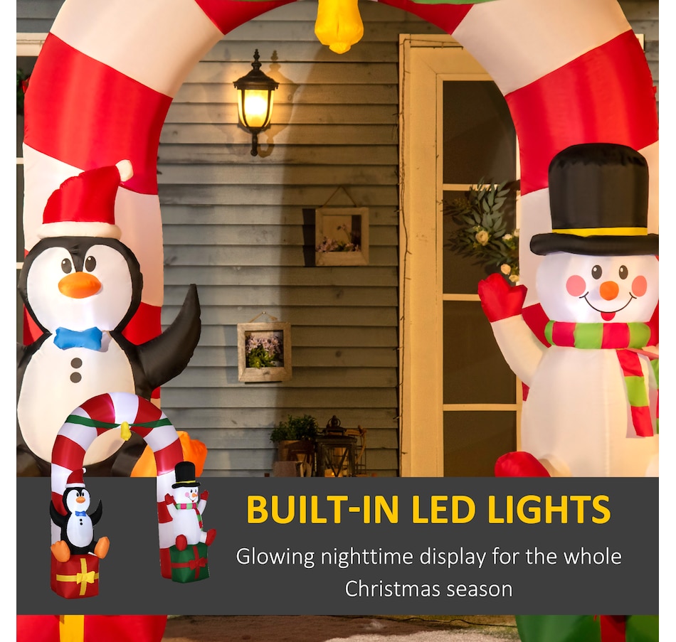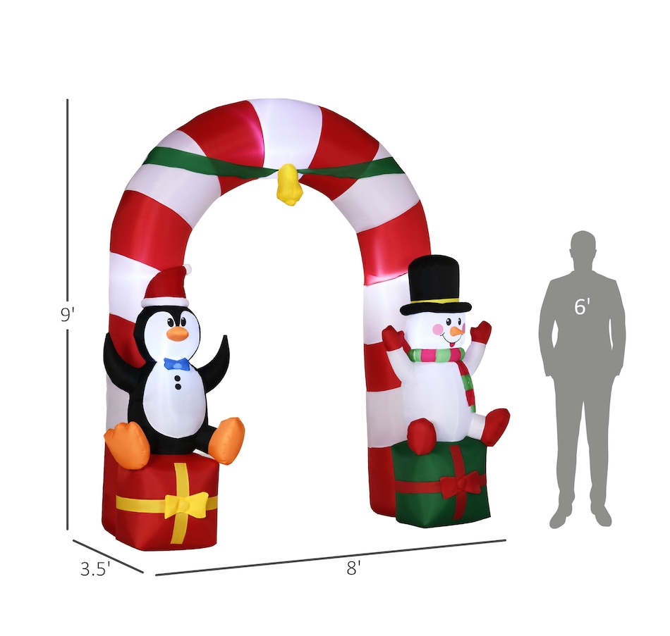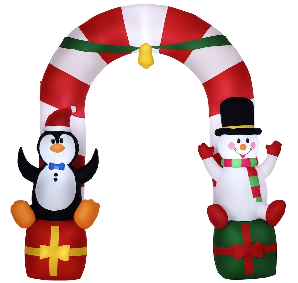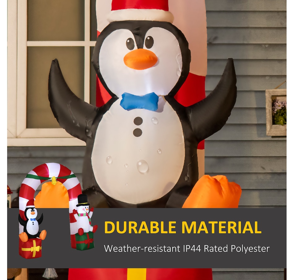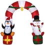 Be the highlight of the neighbourhood with this fun and merry inflatable Christmas candy cane arch with a penguin and snowman sitting on top of gift boxes. The white LED lights on this Christmas yard decoration will dazzle your entire neighbourhood while lighting up your garden. Families, neighbours, and carolers are sure to stop and enjoy this inflatable arch display.Features: