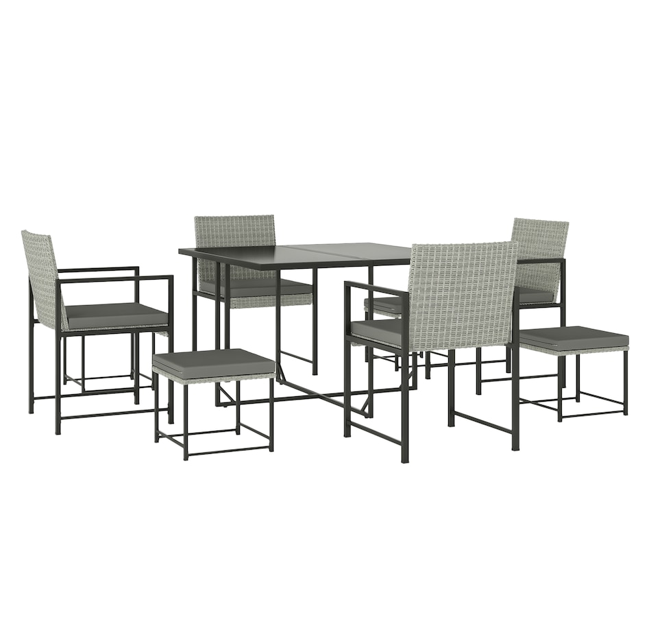 Transform your outdoor gatherings with the Outsunny 9-piece outdoor table and chairs. This patio conversation set includes a table, 4 chairs, and 4 stools that tuck neatly under the table for space-saving magic! Enjoy the comfort of thick, washable cushions and dine in style with a sleek tempered glass tabletop. This dining table set suits any patio conversation set or backyard furniture ensemble.