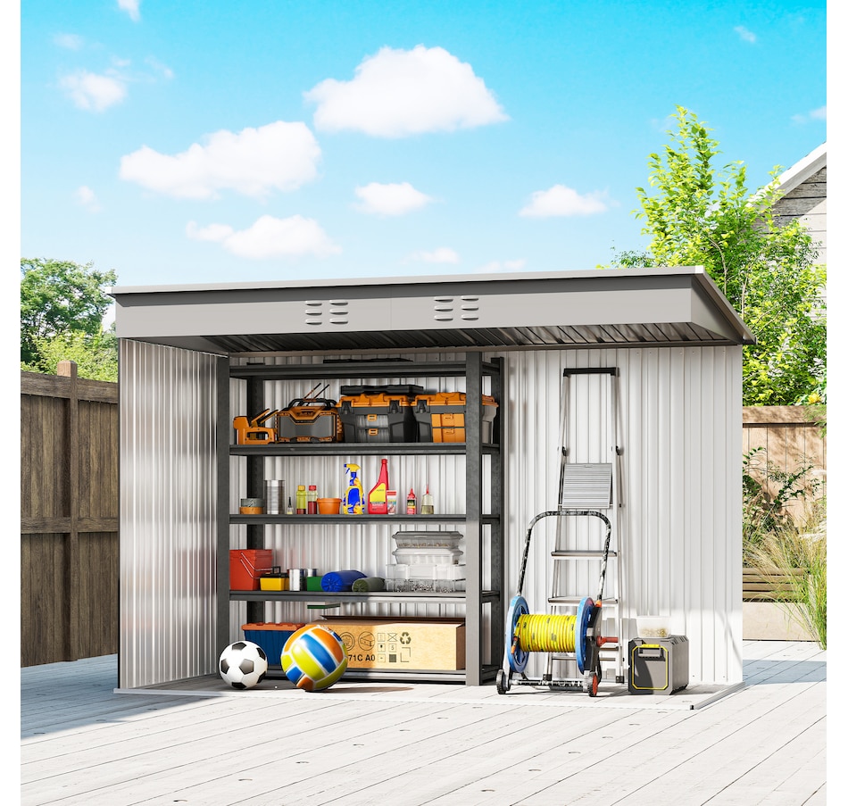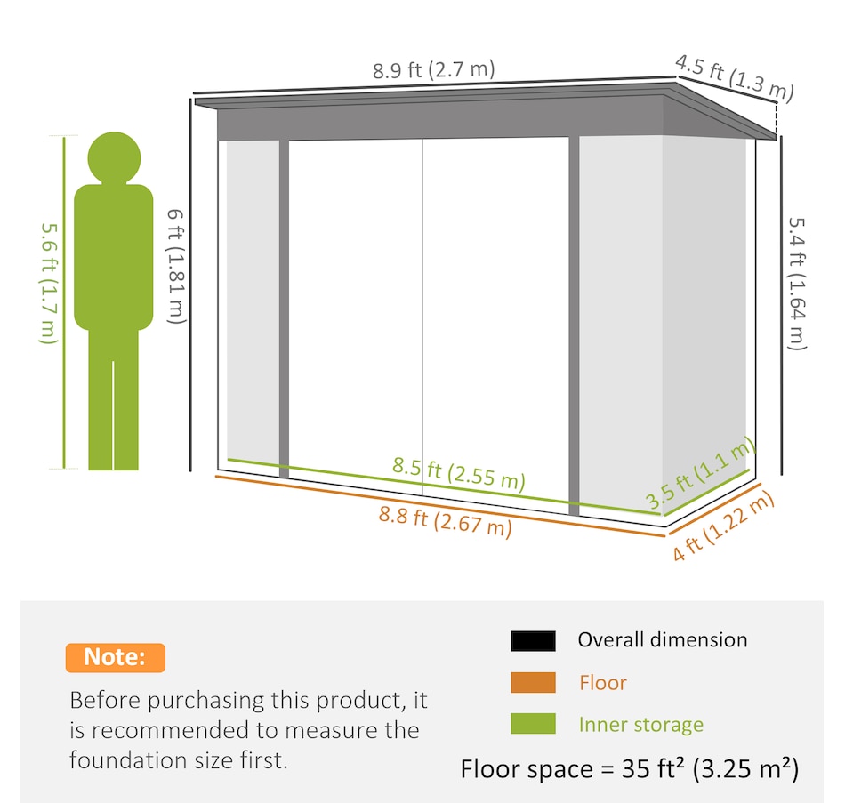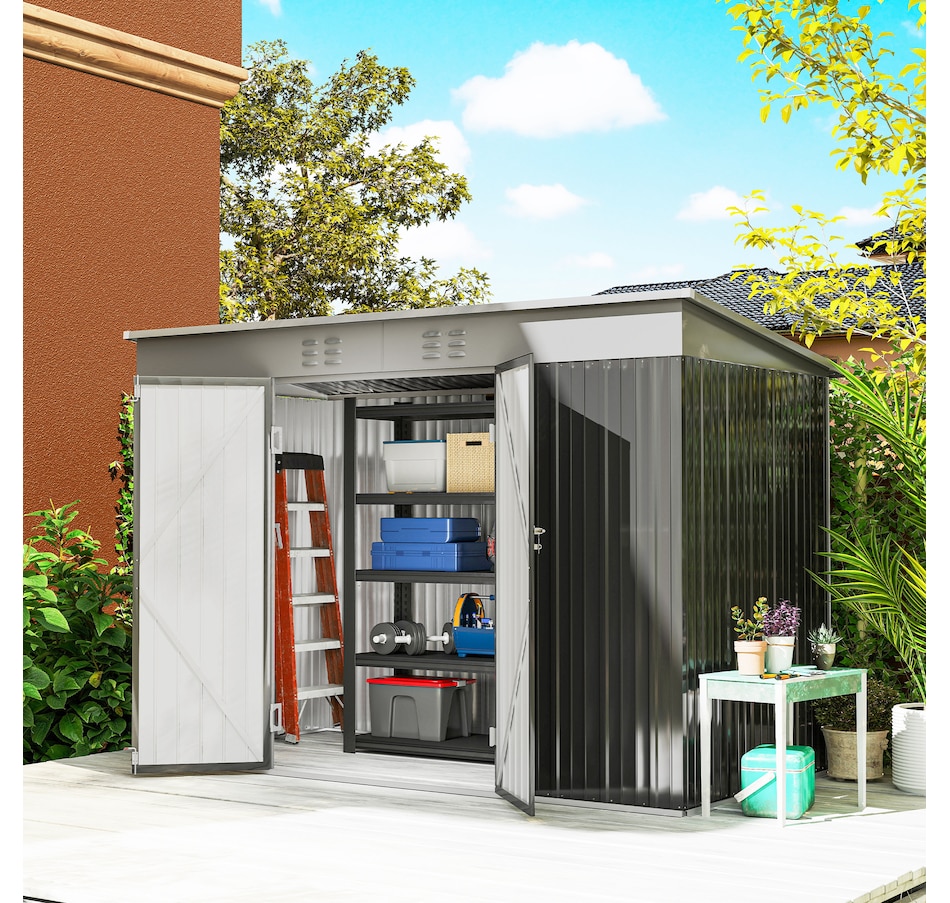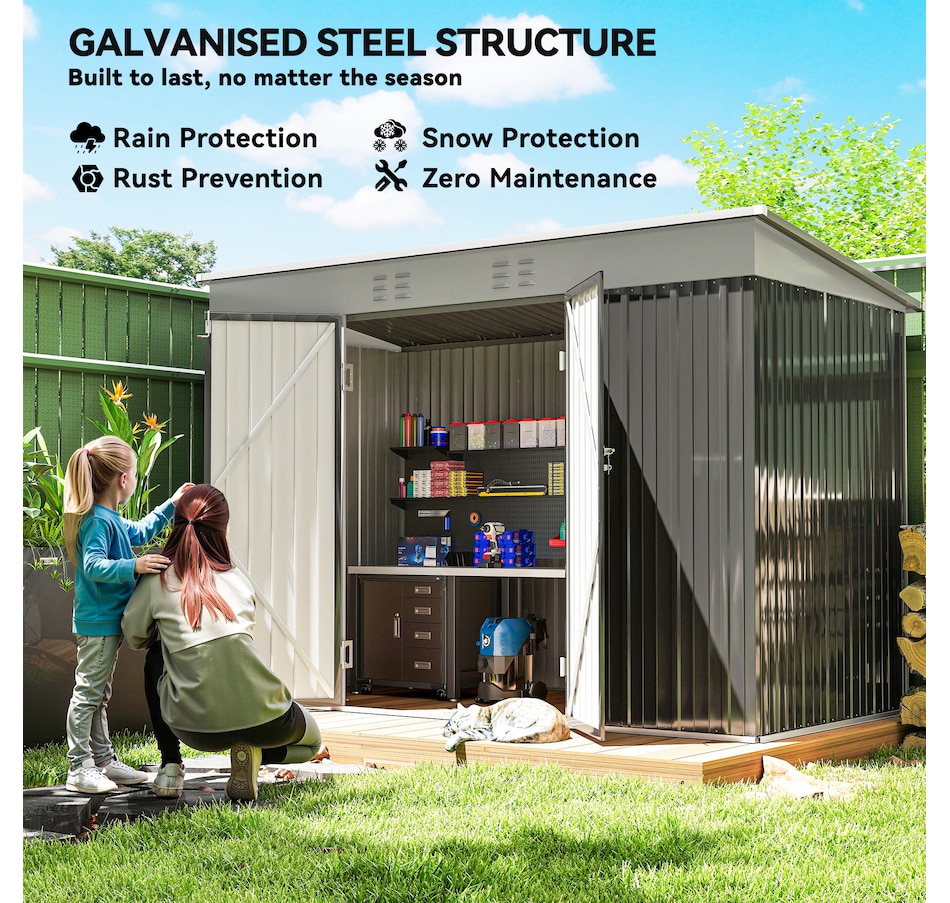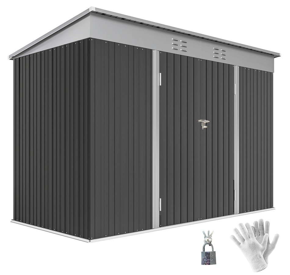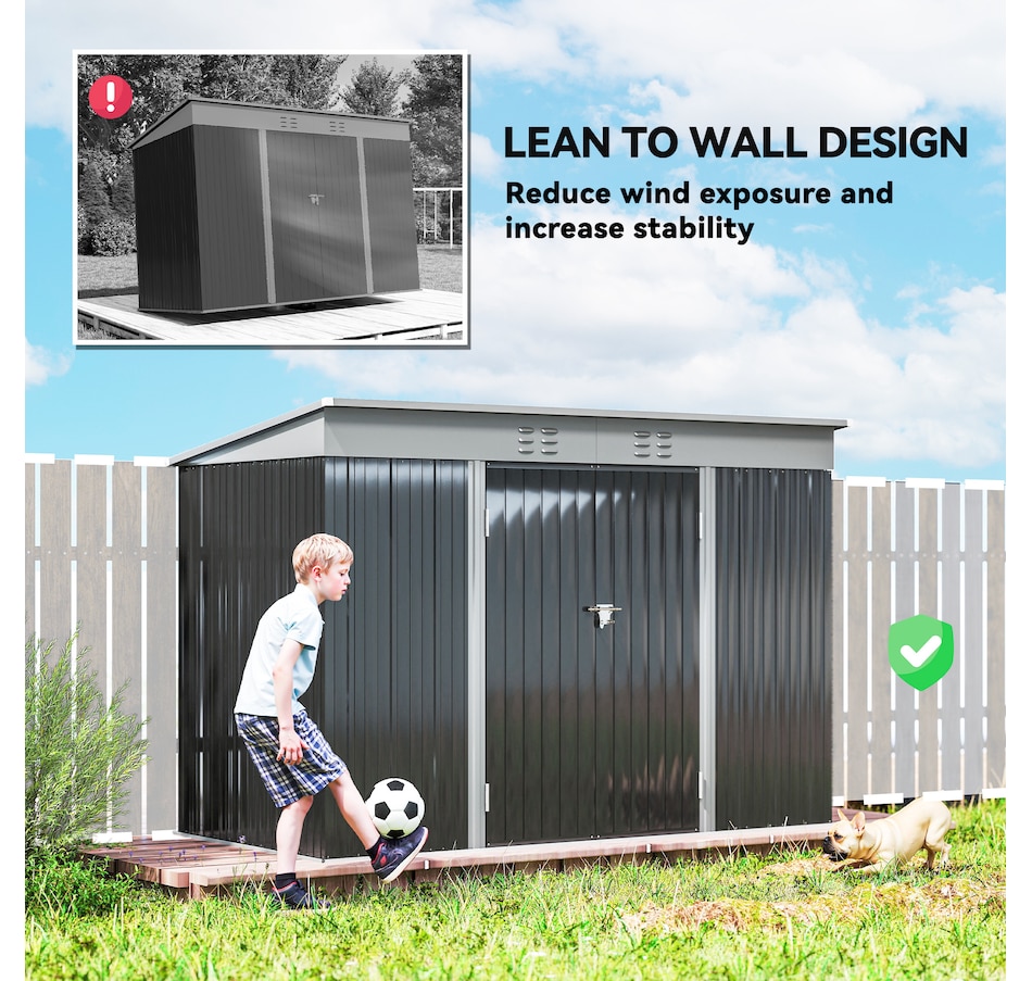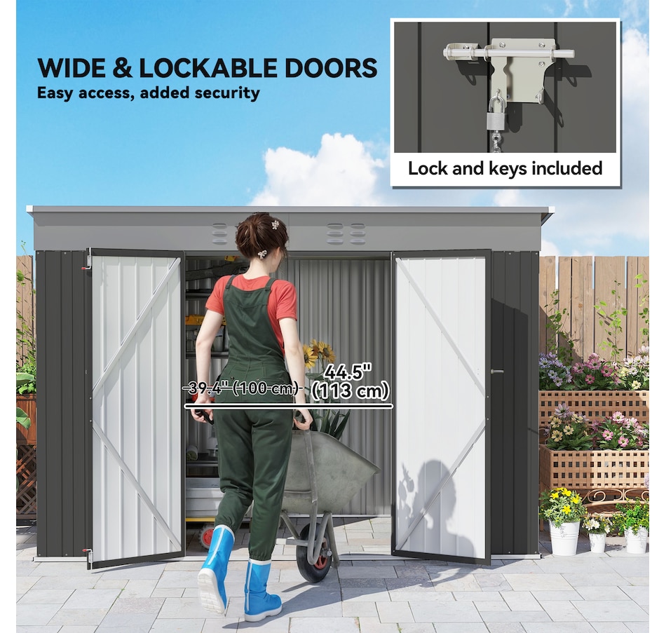 Keep your garden tools and outdoor essentials secure and tidy with the Outsunny Backyard Storage Shed! This spacious 9' x 4' metal shed offers a robust, waterproof haven with easy-access double hinged doors. Featuring two vents for optimal ventilation, this outdoor garden shed is your go-to for decluttering and protecting your outdoor space.Features:
