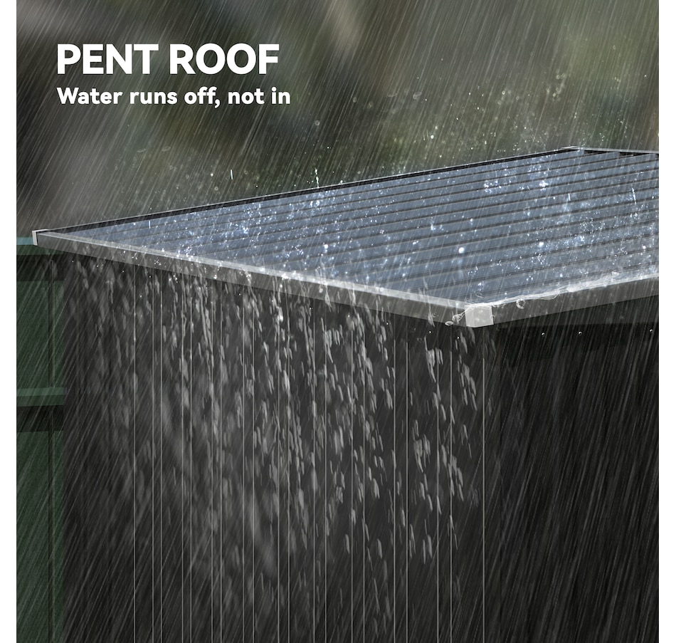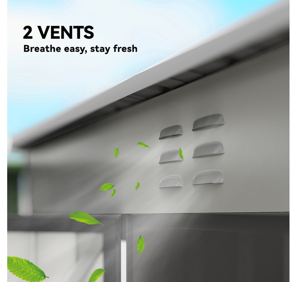 ● Spacious shed accommodates garden tools and equipment;