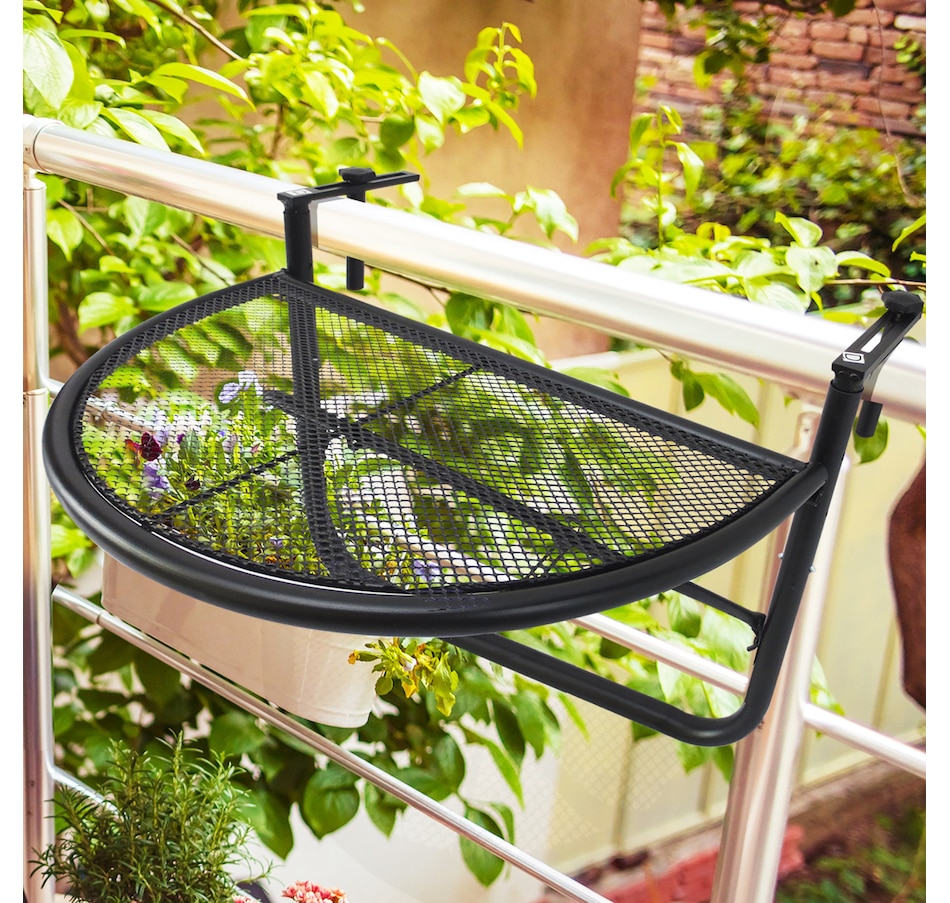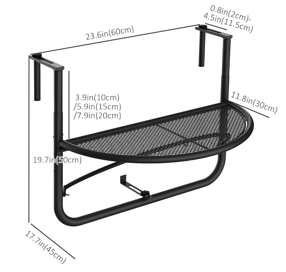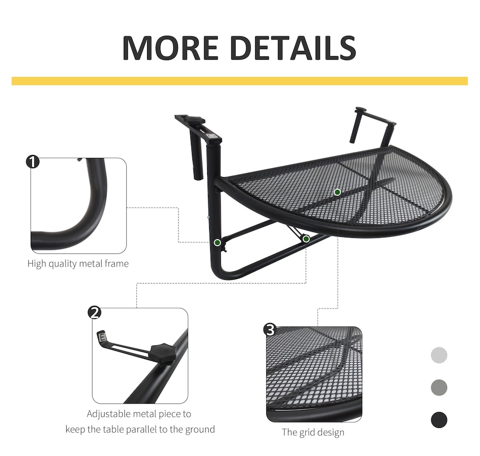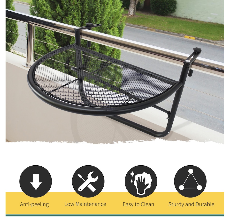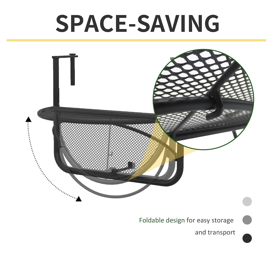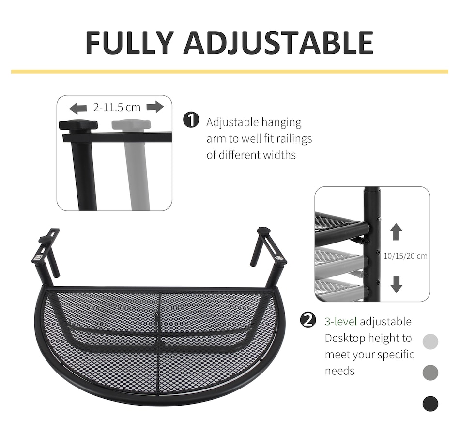 Sit at the balcony, enjoy coffee, tea, cook-tile with this Rattan Styled Railing Table from Outsunny! This table provides a great solution to anyone who has a tight or confined outdoor space. Constructed with metal frame in grey finish, it can meet your frequent daily use. With adjustable railing position and 3 adjustable positions for desktop height, it can easily attach to your deck or patio railing. With this smart gadget, you will never spill a drink while enjoying the view from your balcony.