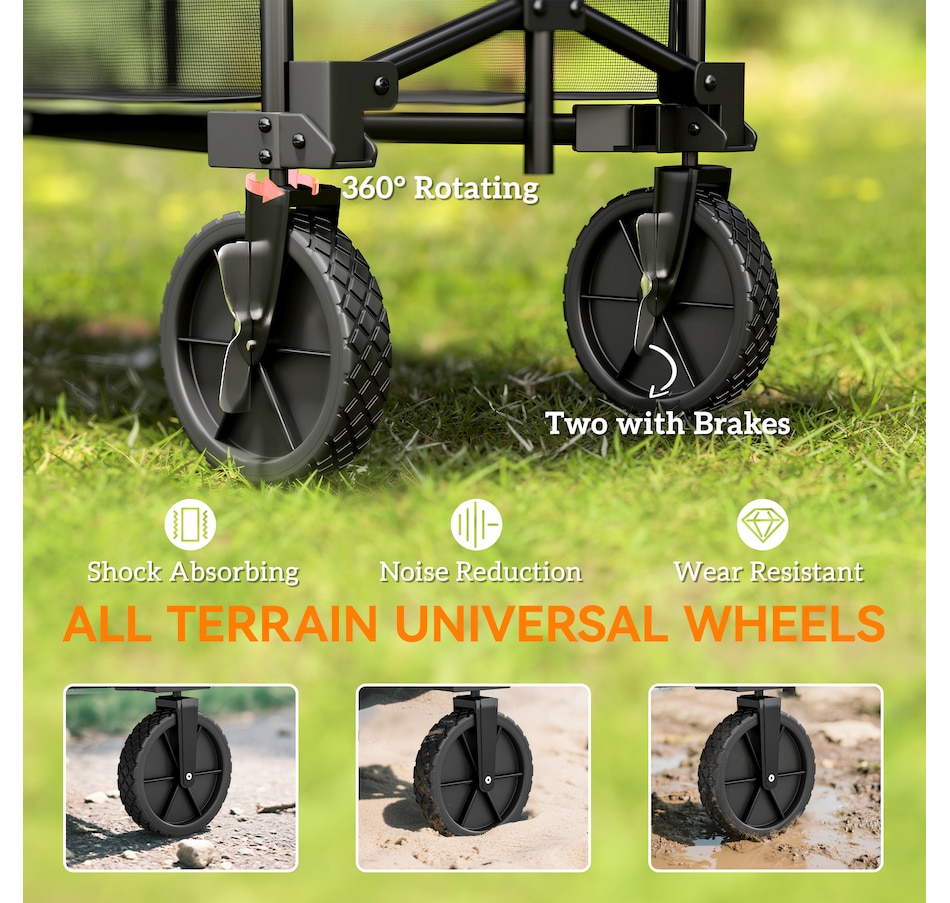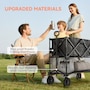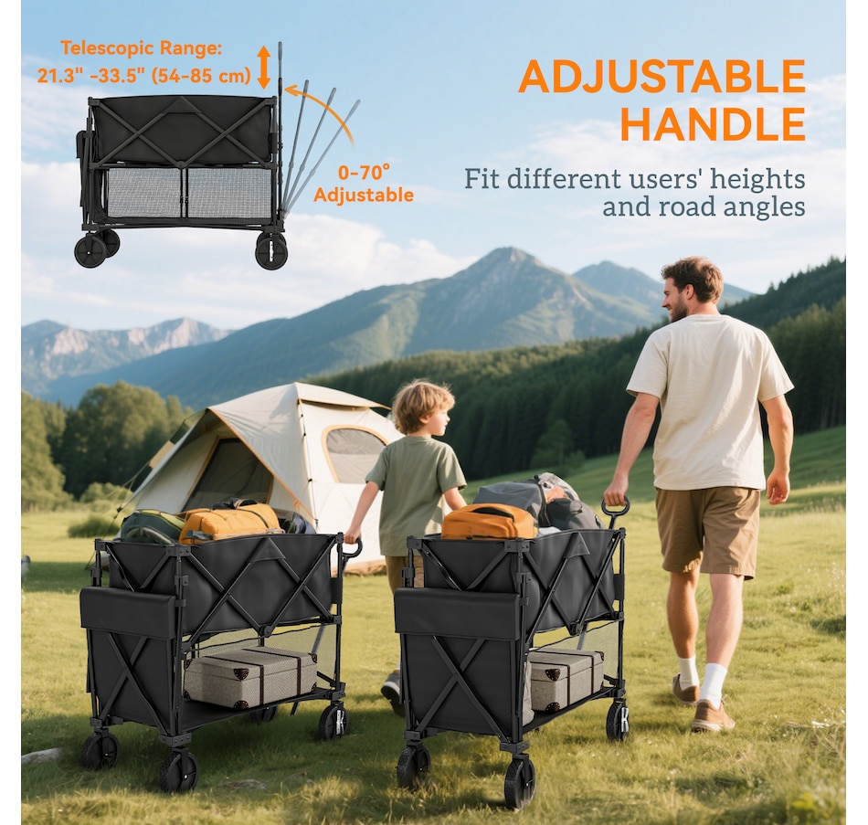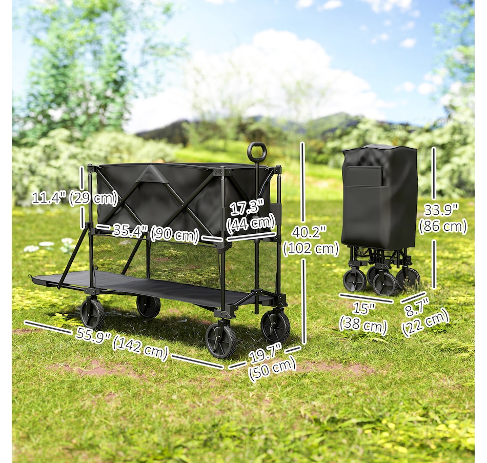 Discover the convenience of the Outsunny foldable wagon, a double-decker marvel offering ample storage with an extended lower shelf for bulky items. Its robust 450 lbs. (200 kg) capacity and waterproof 600D Oxford fabric make it a reliable choice for any task. Effortlessly maneuver through any terrain with its 360° rotating all-terrain wheels. Great as a garden wagon, camping cart, or utility trolley!Features: