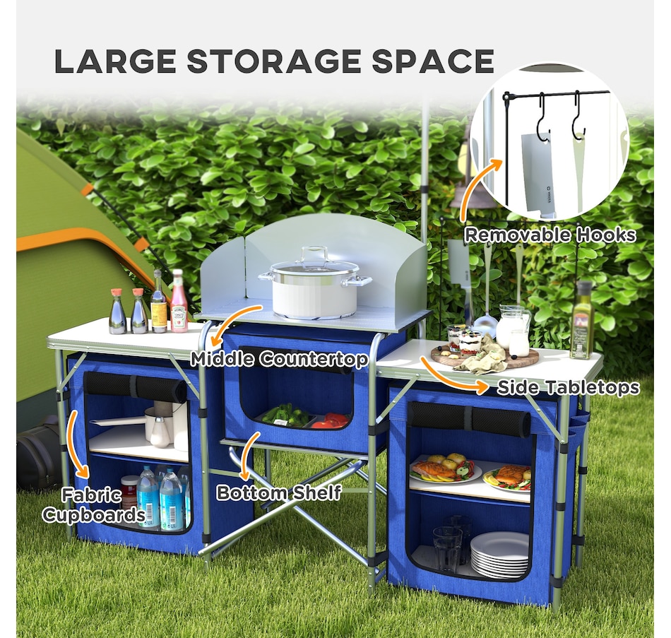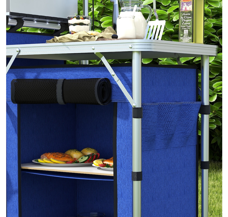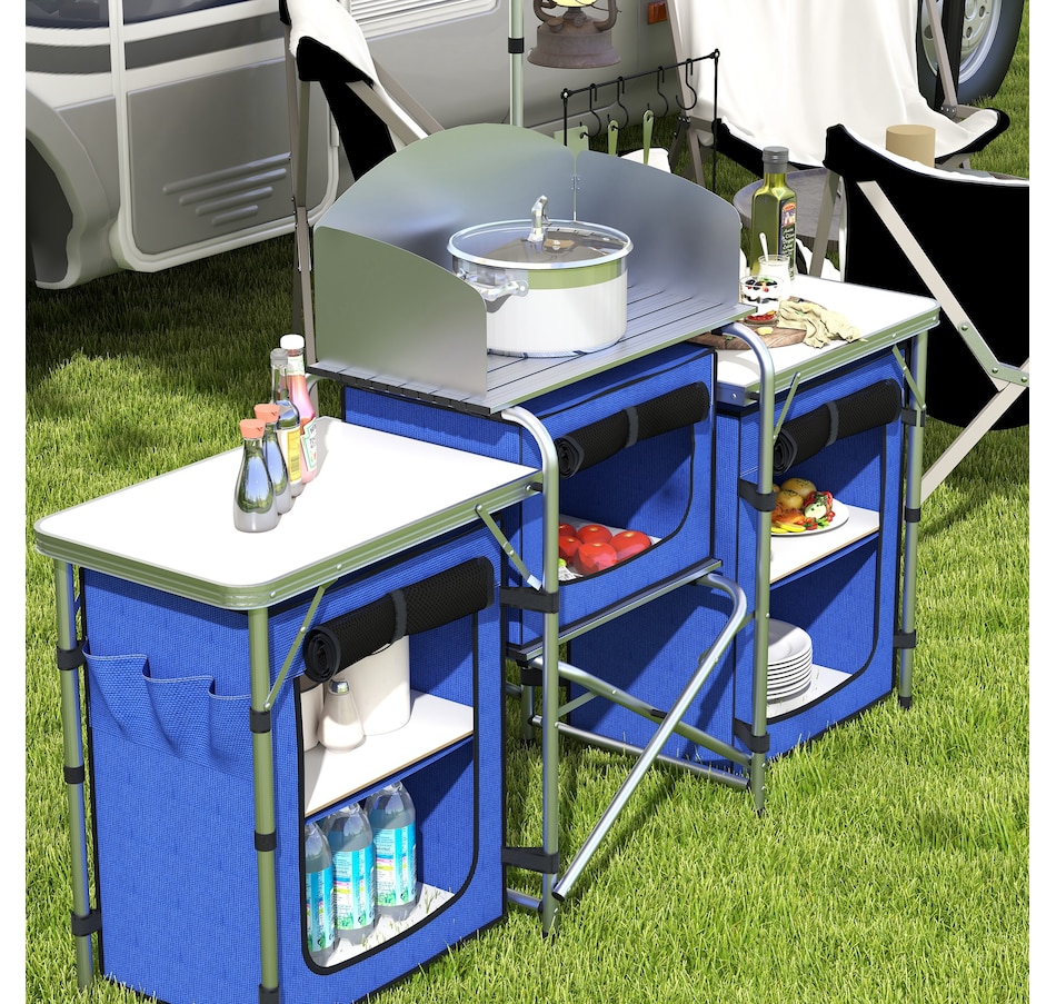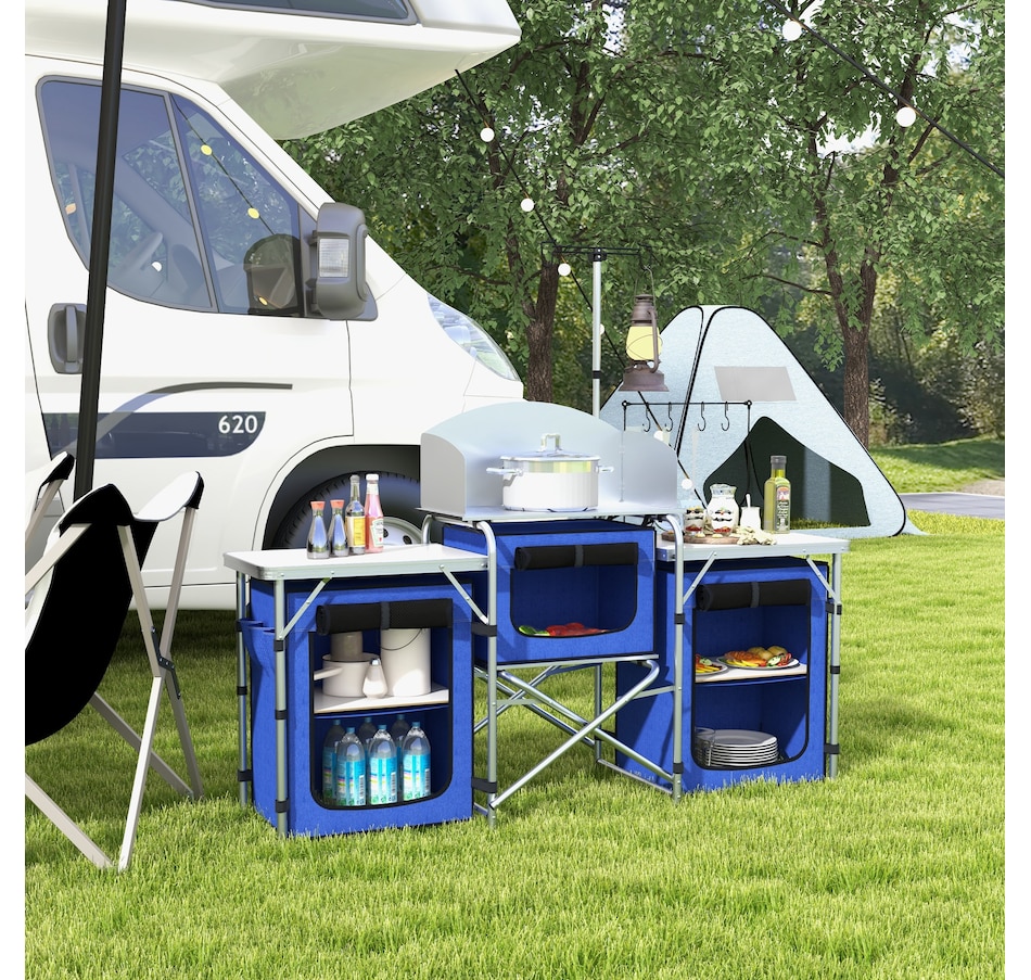 With plenty of room for your cooking gear, our portable kitchen from Outsunny gets the job done when you need to prep food on the go. Great space management includes three tabletops, a bottom shelf, three fabric cupboards, four hooks and a height adjustable light stand. Outsunny foldable camping table helps keep you organized so that you spend less time looking for utensils and more time seeking adventure.