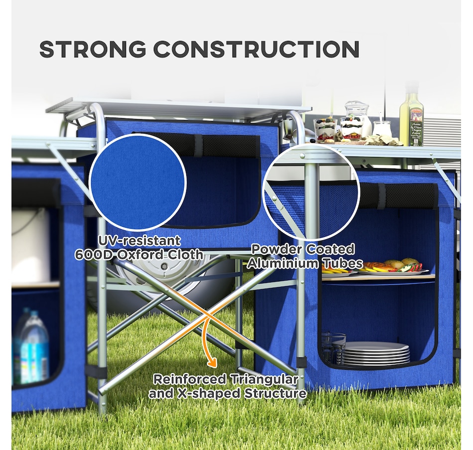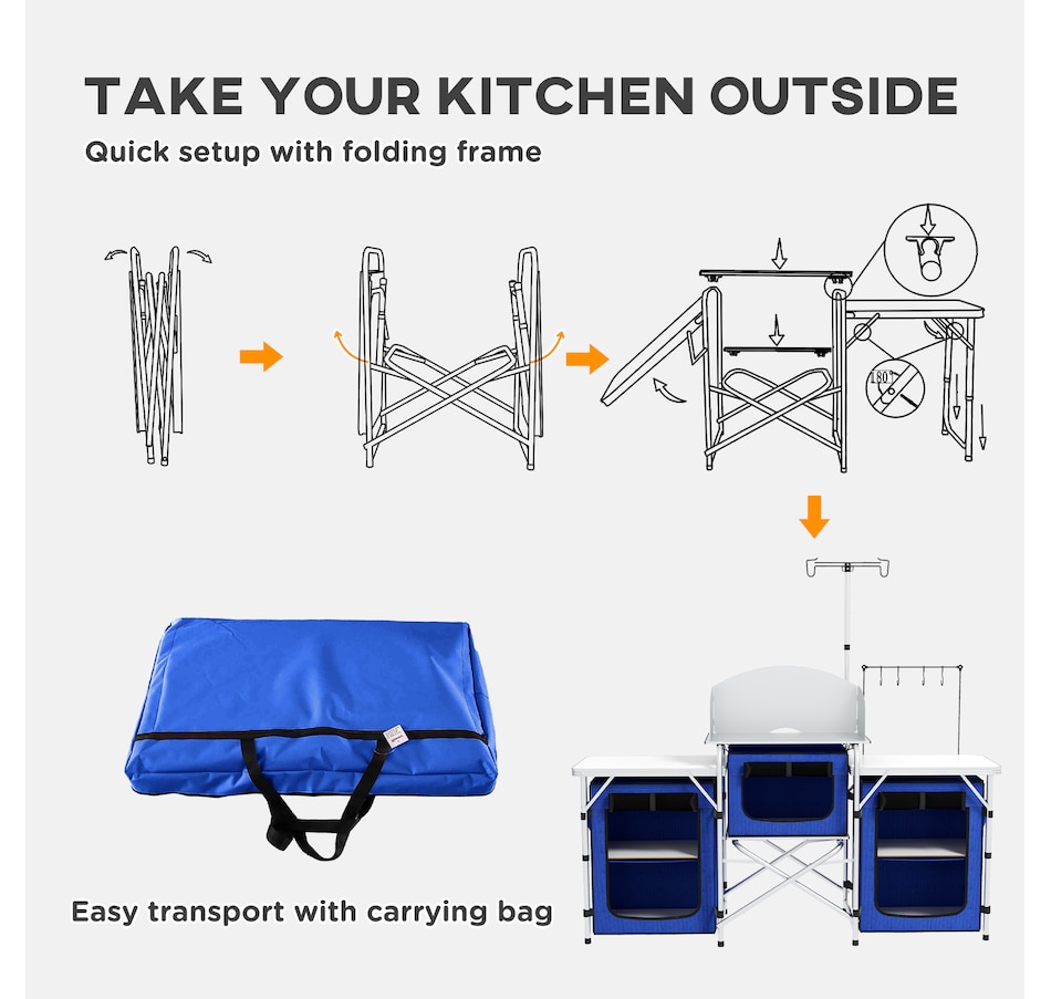 ● Portable camp kitchen folds compactly with a carrying bag;