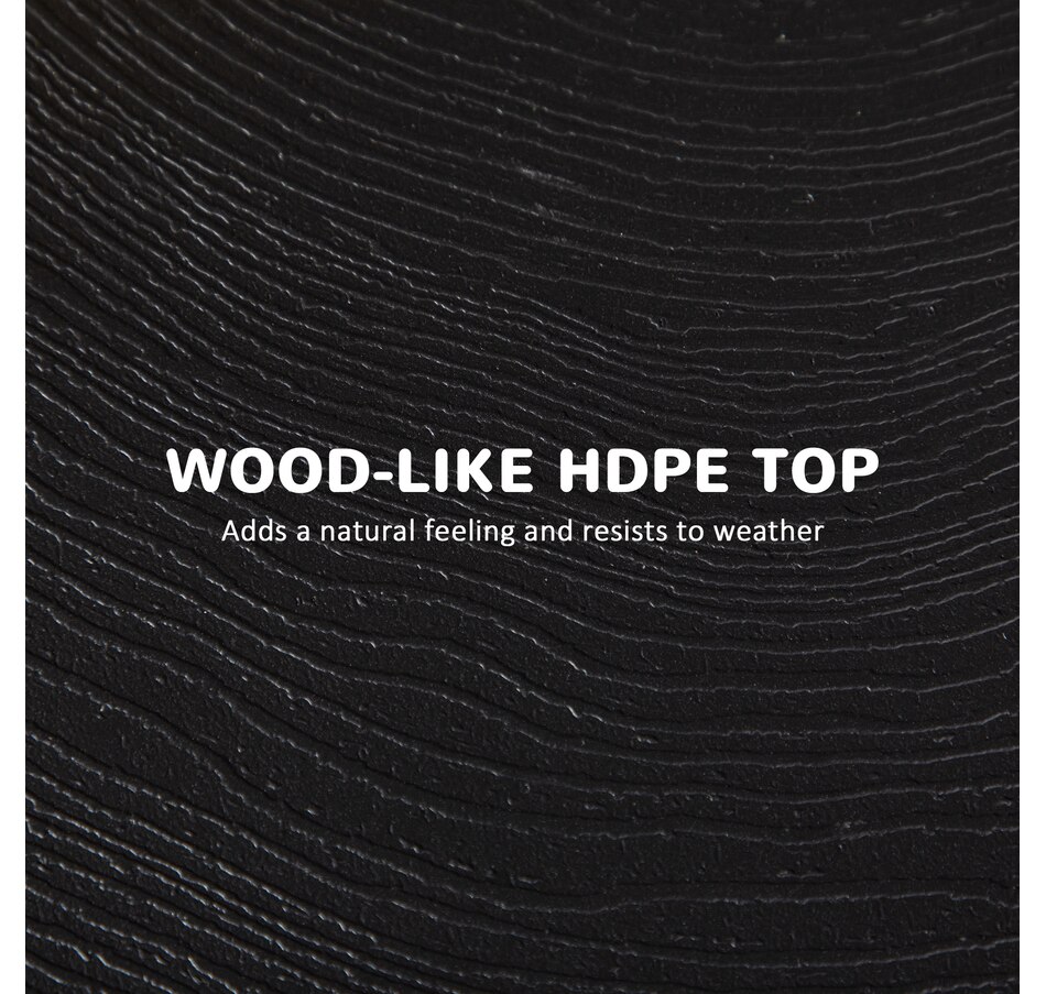 ● Wood-effect HDPE tabletop is weather-resistant and highly decorative;