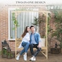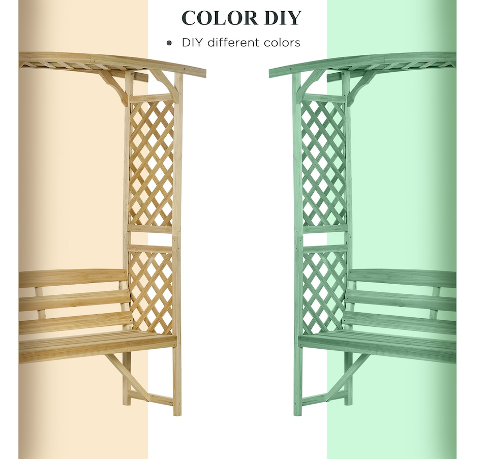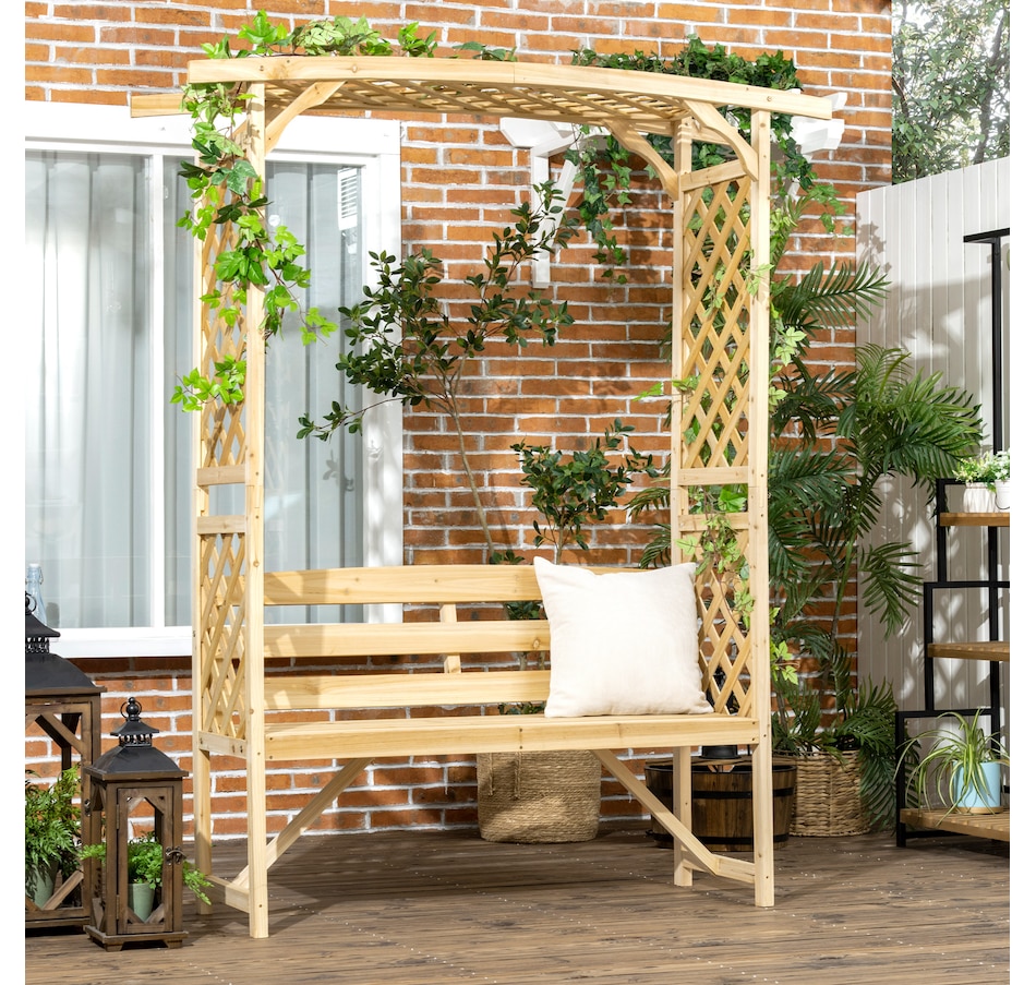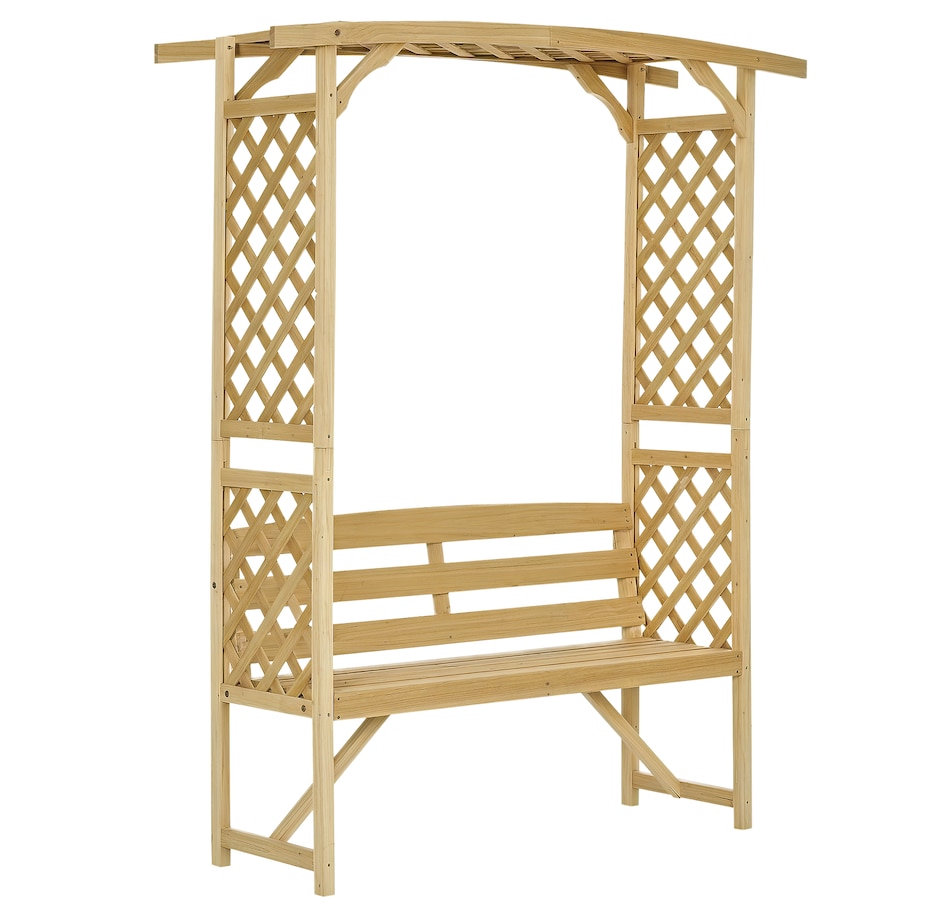● Arbor arch garden bench with two trellises and a pergola offers form and function