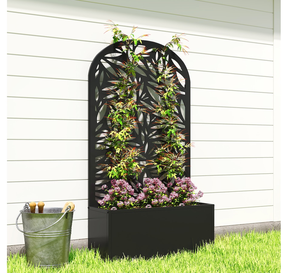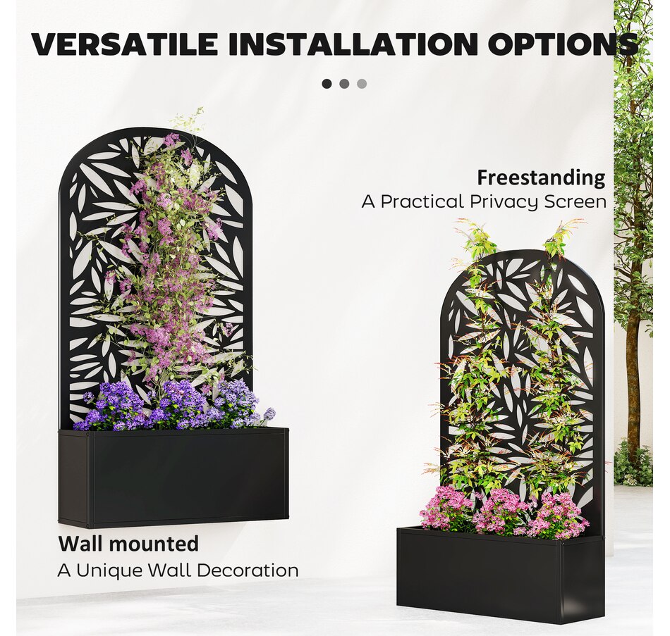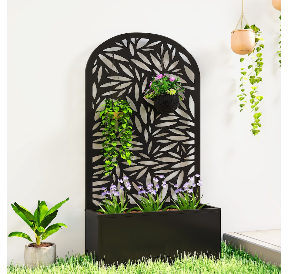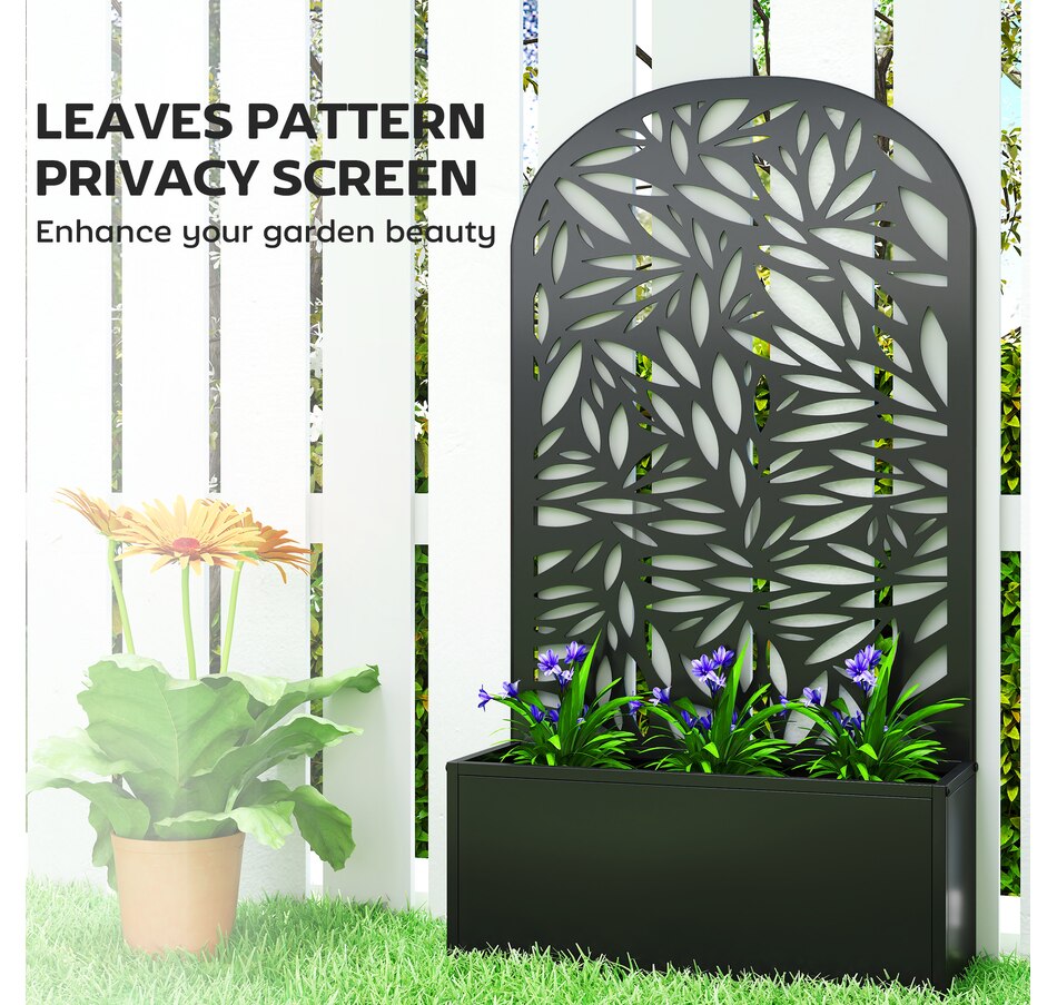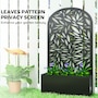 Transform your outdoor space with the Outsunny metal planter, featuring a curved privacy panel with leaves cut-out motifs. This metal garden planter boasts a spacious 22.8" L x 8.3" W x 9.4" H interior, great for nurturing plants in up to 7.7 gallons of soil. Its versatile design allows for wall mounting or freestanding setups, making it a charming addition to any garden.