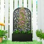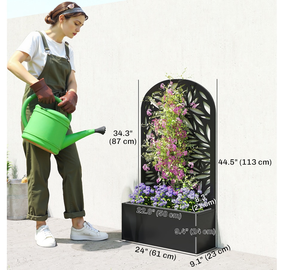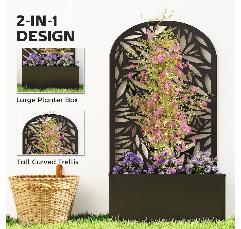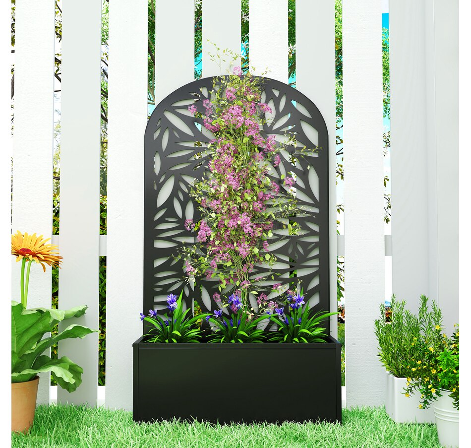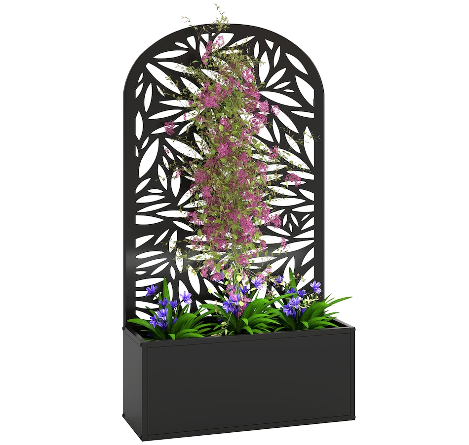 Transform your outdoor space with the Outsunny metal planter, featuring a curved privacy panel with leaves cut-out motifs. This metal garden planter boasts a spacious 22.8" L x 8.3" W x 9.4" H interior, great for nurturing plants in up to 7.7 gallons of soil. Its versatile design allows for wall mounting or freestanding setups, making it a charming addition to any garden.