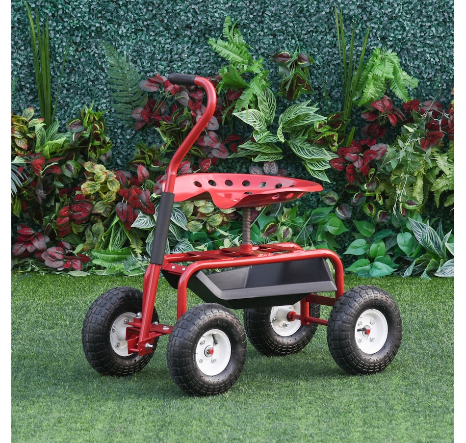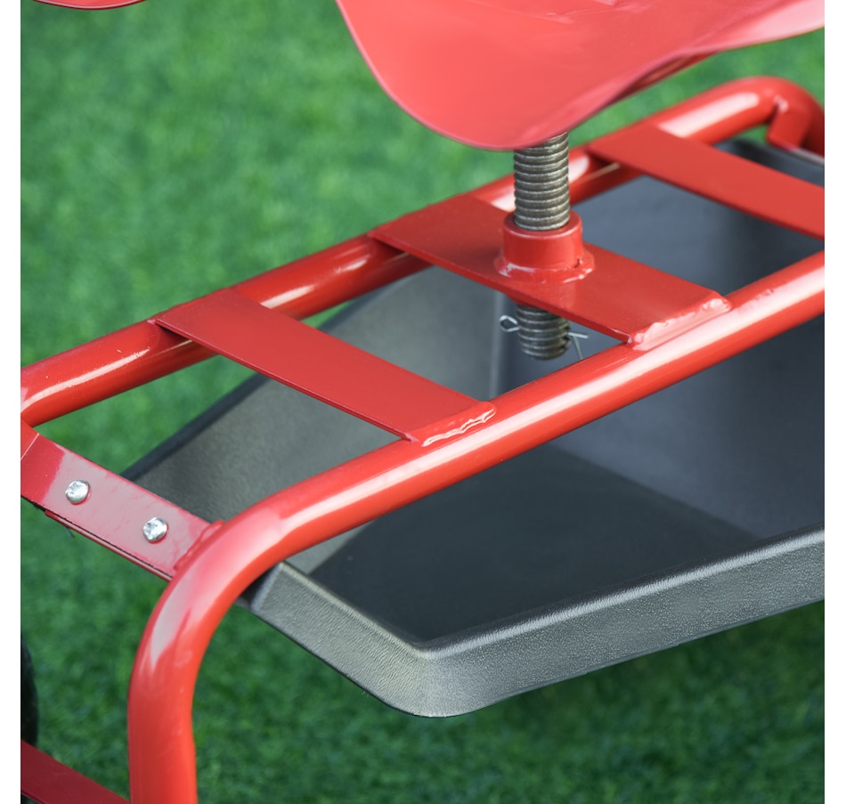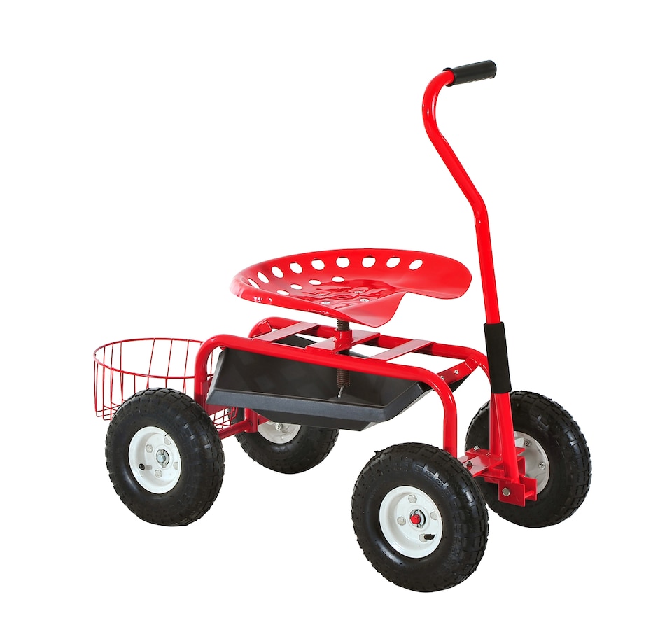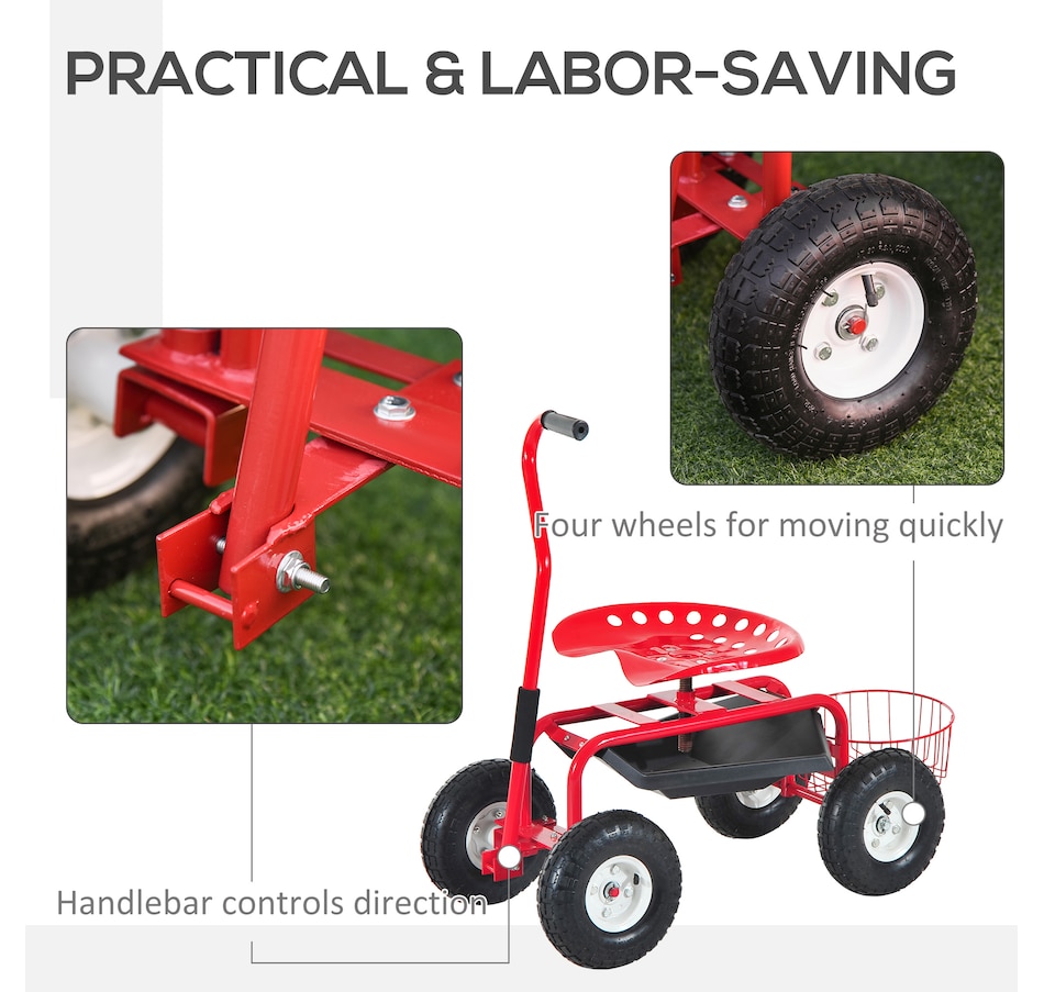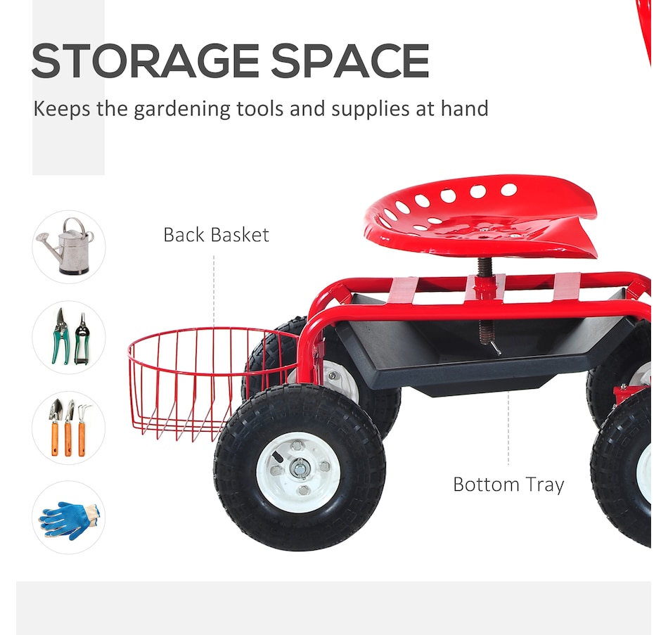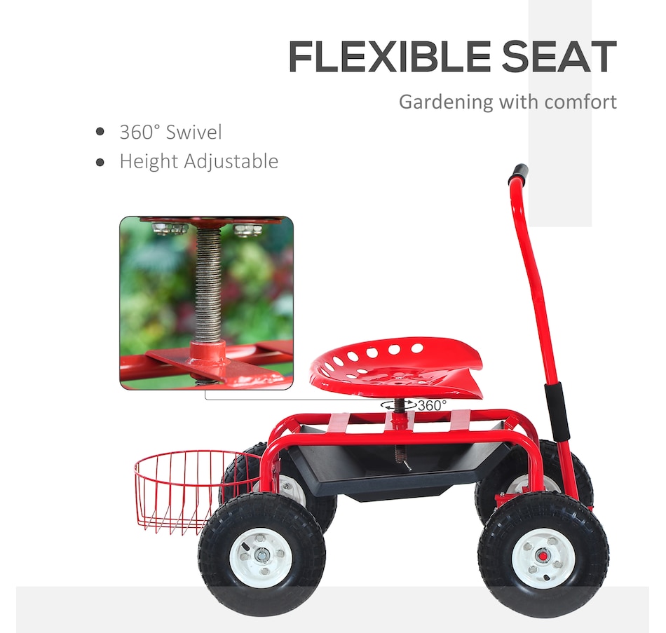 This Outsunny garden scooter with seat and wheels is a necessity for any gardener. Made of metal frme for enough stable, and the garden car can be easily moved around with 4 wheels, the front wheels can steer using the pull handle. Including a swivel and height adjustable seat for you to tend your plants and landscape with comfort. There is a utility basket at the rear and also a tray under the seat for tools.Features: