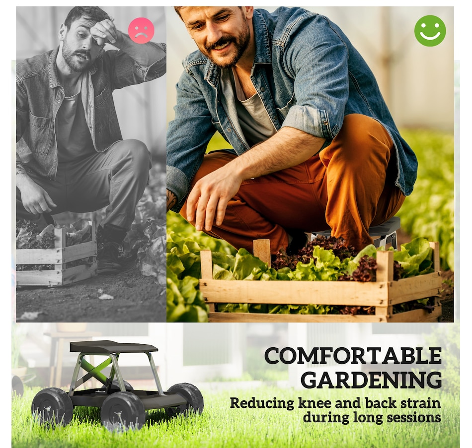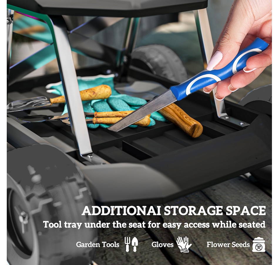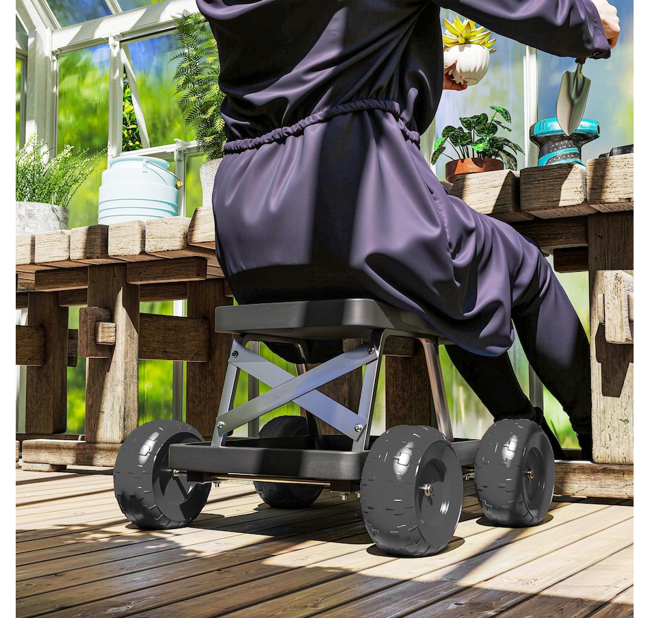 The Outsunny garden scooter with work seat is the great solution for comfortable and practical gardening or workshop tasks. Its innovative design provides an ergonomic seat that relieves pressure on your knees and back, allowing you to work longer without discomfort. Plus, the integrated tool tray beneath the seat keeps your tools easily accessible while you stay seated.Features: