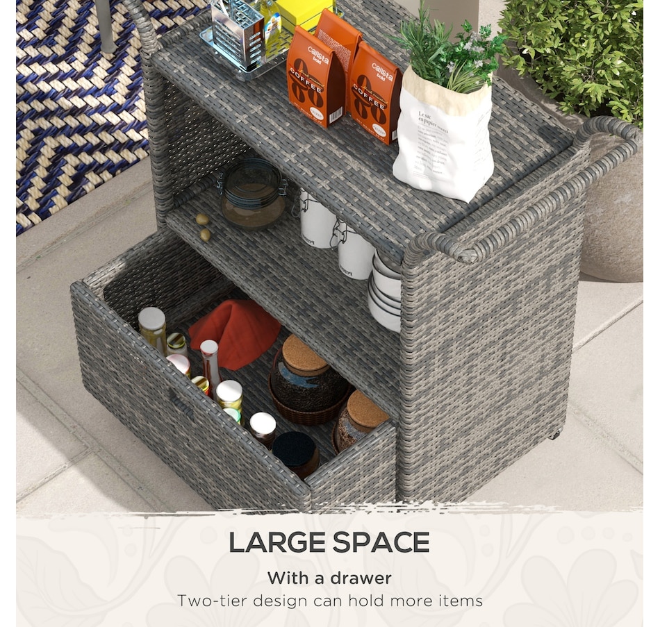 Planning on hosting some friends? Take your entertaining to the next level with a sophisticated outdoor rolling cart from Outsunny. Featuring two shelves and a drawer, this serving cart can effortlessly hold all your food, drinks, towels, and games, making it the good solution for catering to any size gathering. With four wheels, this kitchen cart is a breeze to maneuver, and two of the wheels even have brakes for added stability. Get ready to roll in style with Outsunny!Features: