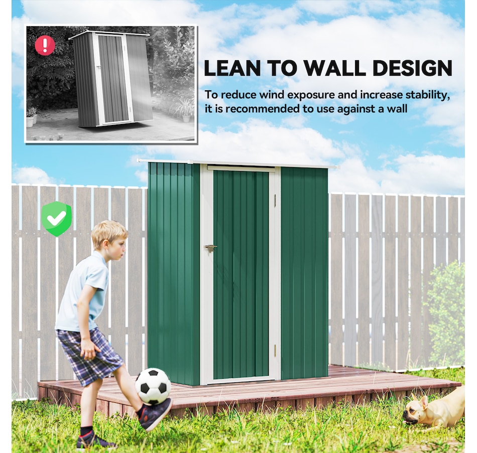 ● Sloped roof to prevent the accumulation of water and rot/rust the frame of metal storage shed;