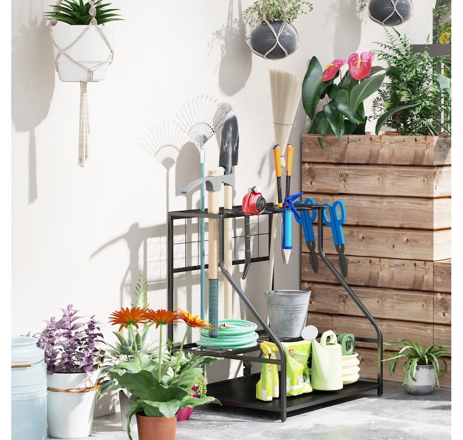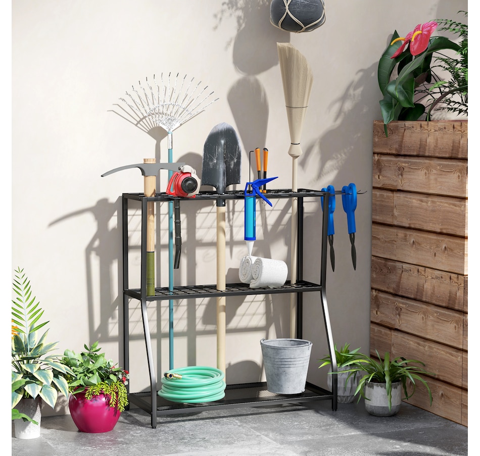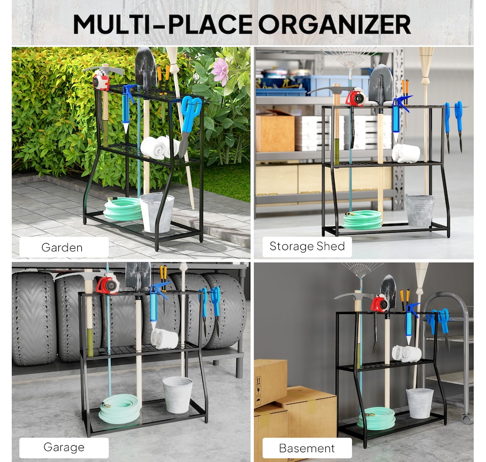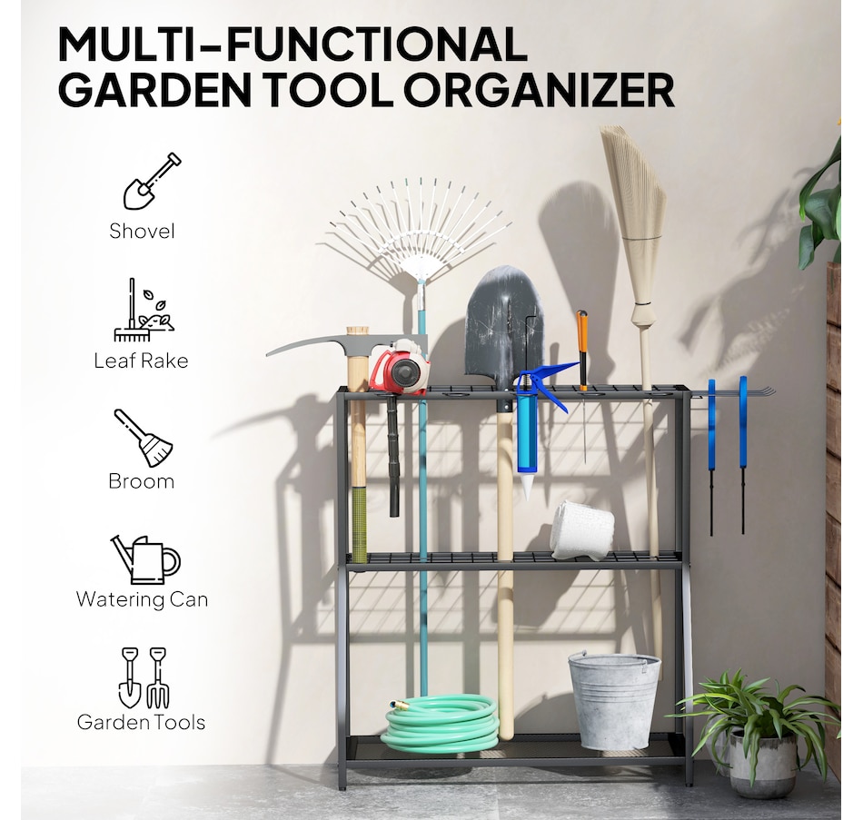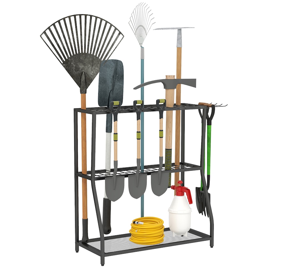 ● 3 Tier organizer holds over 20 tools, including shovels, rakes and brooms