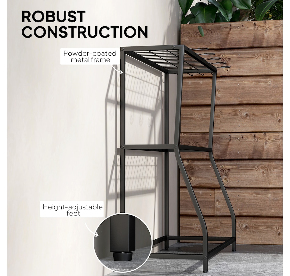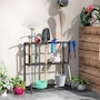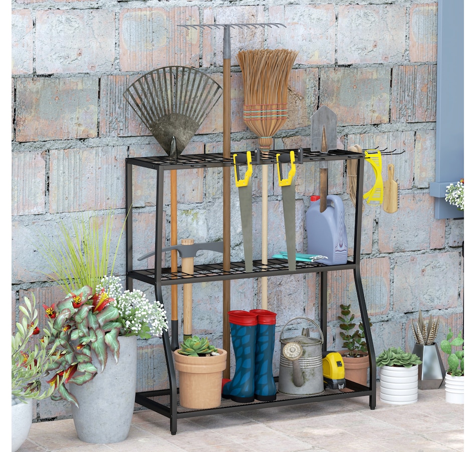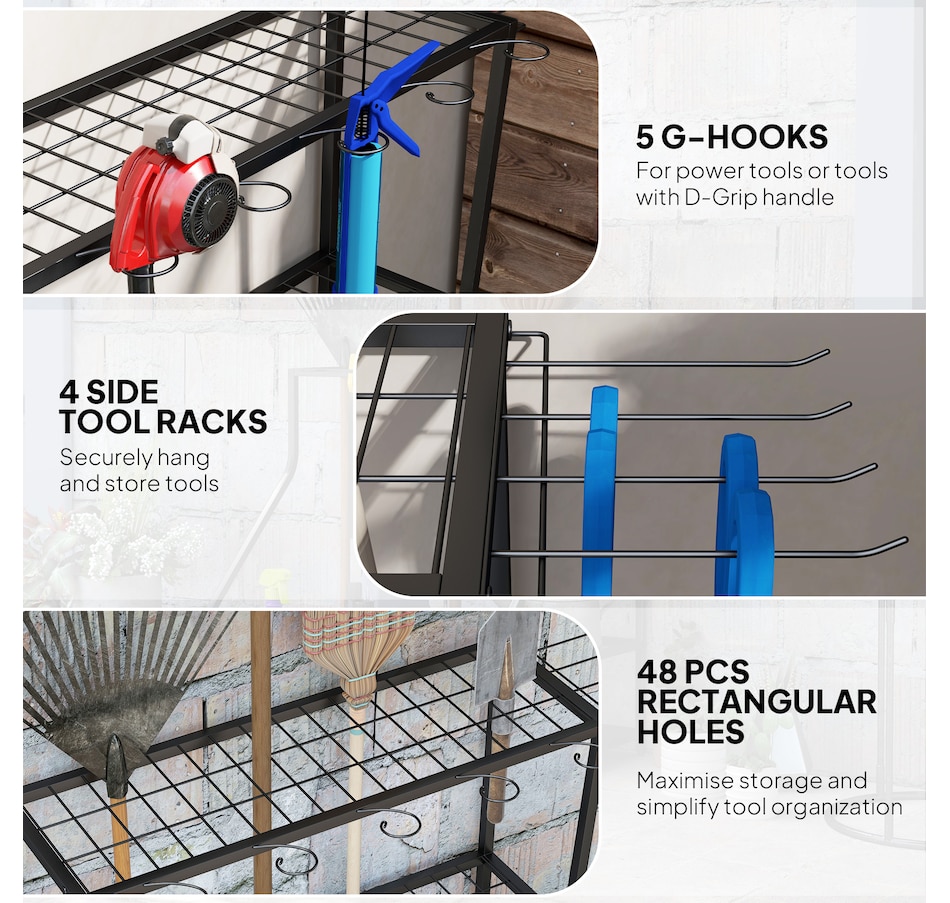 Transform your cluttered space with the Outsunny Garden Tool Organizer! Effortlessly store over 20 tools, from garden essentials to cleaning supplies, on this versatile rack. Featuring five G-hooks, four side hooks and mesh shelves, it's a great solution for keeping your garage or shed organized. Plus, its robust, rust-resistant frame ensures it stands up to the elements.